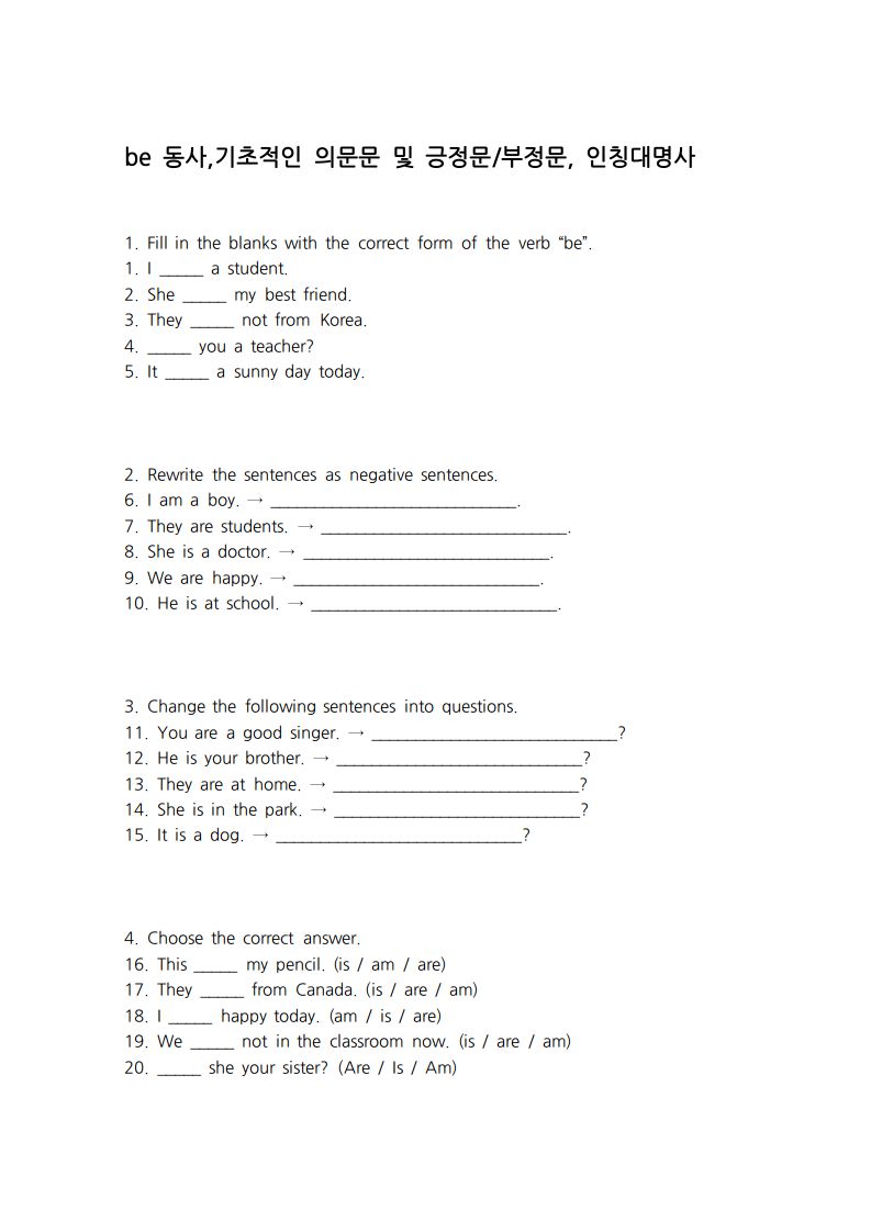 중학교 1학년 영어 교과서 1단원에서는 주로 다루는 문법 내용을 바탕으로 만든 문제들입니다. 보통 1단원에서는 be 동사, 기초적인 의문문 및 긍정문/부정문, 그리고 인칭대명사 등이 다뤄집니다.아래는 중학교 1학년 교과서 1단원에서 주로 다뤄지는 내용들에 관련된 문제와 정답입니다.간단 테스트에 활용하기 좋습니다. 영어학습지-문제지(1) 영어학습지-정답지(1) 중학교 1학년 영어 교과서 1단원에서는 주로 다루는 문법 내용을 바탕으로 만든 문제들입니다. 보통 1단원에서는 be 동사, 기초적인 의문문 및 긍정문/부정문, 그리고 인칭대명사 등이 다뤄집니다.아래는 중학교 1학년 교과서 1단원에서 주로 다뤄지는 내용들에 관련된 문제와 정답입니다.간단 테스트에 활용하기 좋습니다. 영어학습지-문제지(2) ..