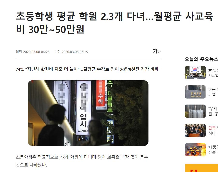 안녕하세요 '윤자매 놀이학습'의 윤자매입니다. 오늘은 초등학생 사교육에 대해 이야기 해 보고자 합니다. 우리나라 초등학생의 사교육비는 평균적으로 얼마나 들까요? 우리나라 초등학생의 평균 사교육비는 30만원에서 50만원 우리나라 초등학생들의 경우 평균적으로 한명당 2~3개의 학원을 다니고 있다고 봐야할 것 같습니다. 대표적으로 피아노학원, 태권도 학원, 미술학원, 영어학원, 수학학원으로 볼 수 있겠죠. 초등학생 저학년일수록 예체능계 학원에 영어 혹은 수학(사고력포함)을 다니지 않나 생각되어집니다. 예체능계 학원 교육비를 평균적으로 15만원 내외, 영어 수학 학원의 교육비를 20만원 내외로만 봐도 한명당 평균적으로 35~40만원 선으로 볼 수 있습니다. 이렇게 많은 비용이 들기에 부모님들은 부담스러울 밖에 ..