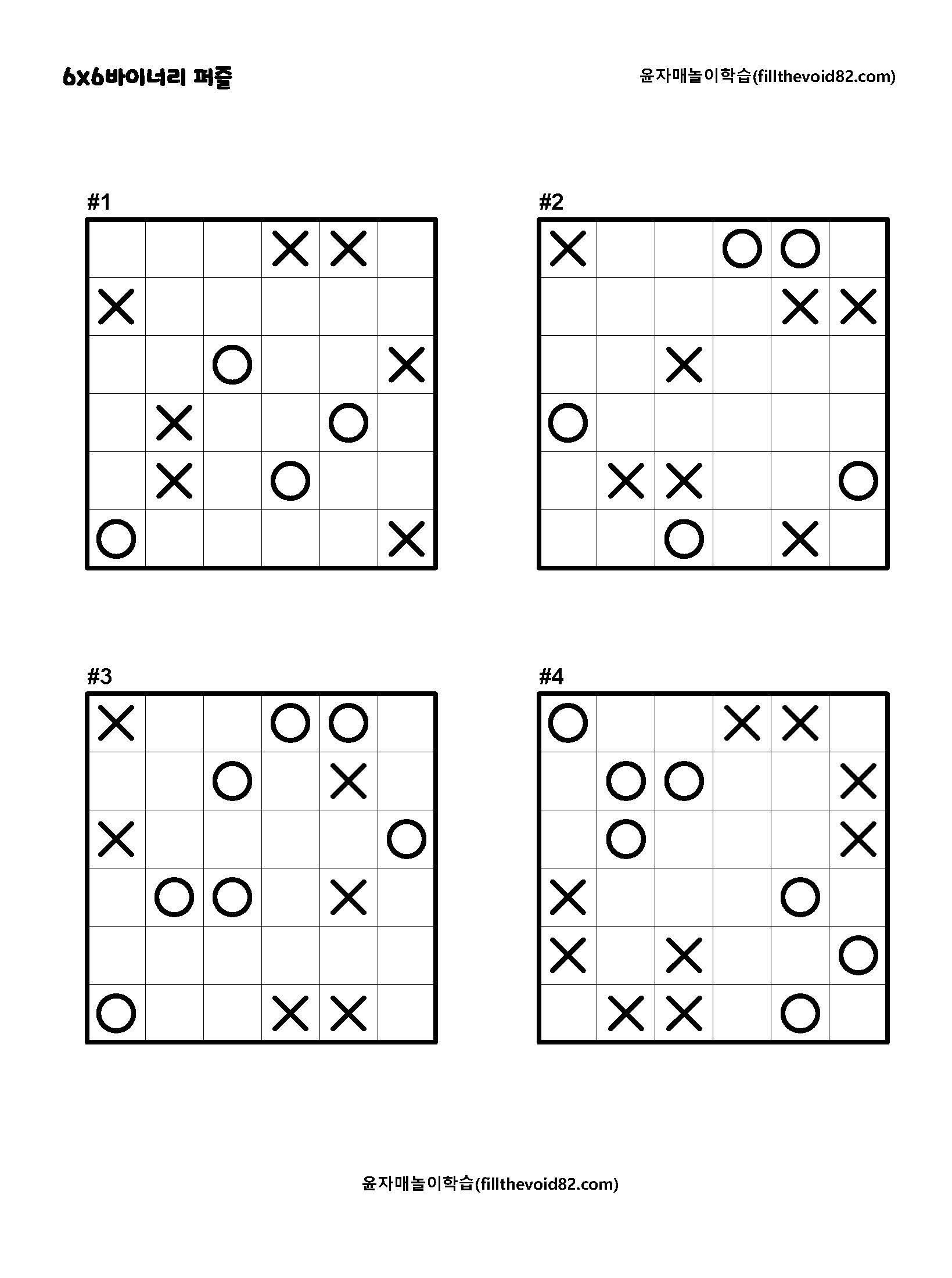 놀이학습지) 바이너리 퍼즐 (쉬움)(1) 0,X로 모든 칸을 채우는 바이너리 퍼즐입니다. 모든 칸을 채우고 나면 성취감과 사고력이 높아진 것을 느끼게 될 것입니다. 추천연령 : 초등3~성인 규칙 각 행에 들어가는 0와 X의 수는 동일합니다. 각 열에 들어가는 0와 X의 수는 동일합니다. 같은 모양이 이어지는 것은 2개를 초과해서는 안됩니다. 예) 00X0 가능, 0X0X 가능, 000XX 불가능 도움이 되셨다면 공감과 댓글 부탁드립니다. 놀이학습지/바이너리퍼즐 2023.04.11