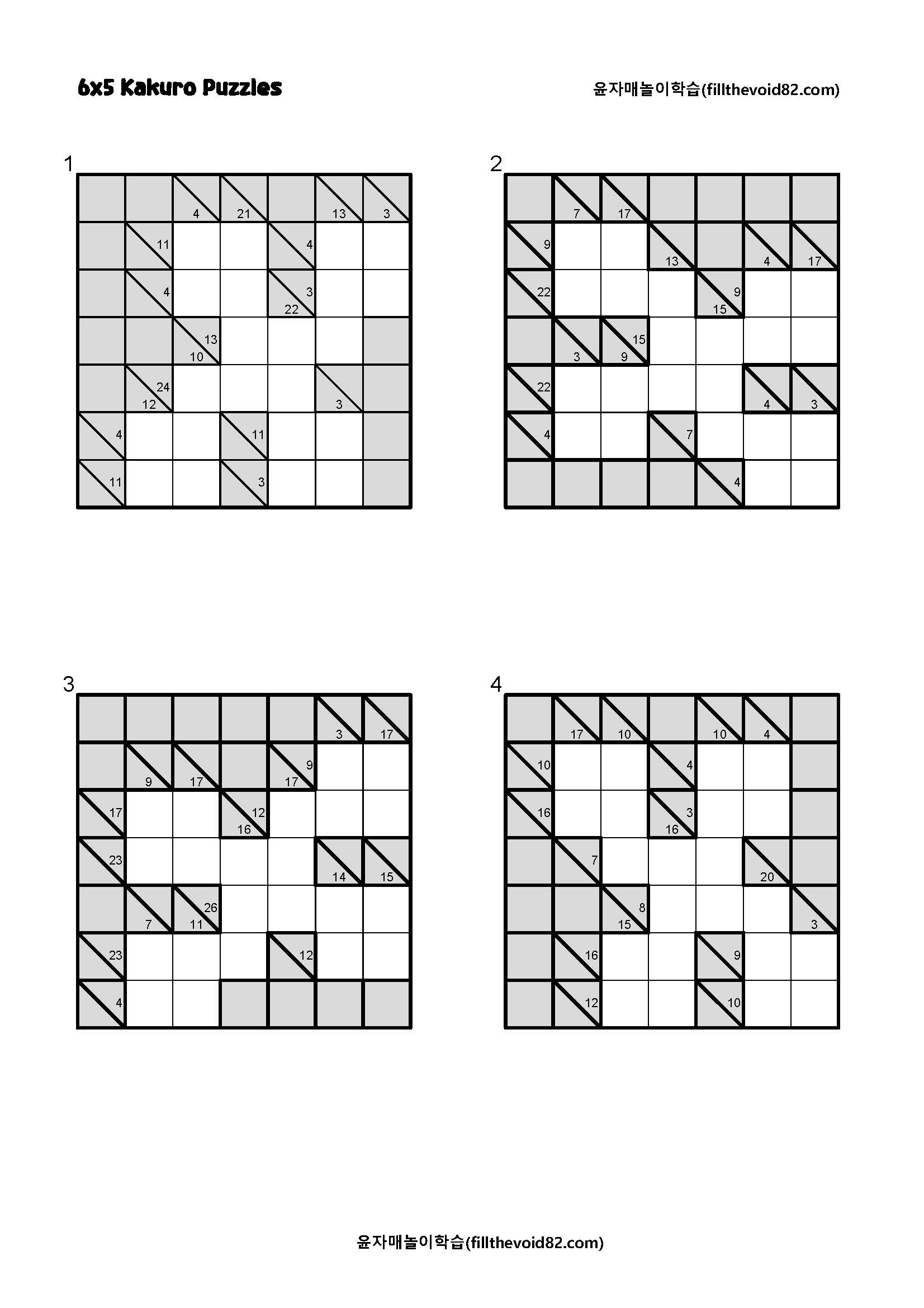 6x6 카쿠로 퍼즐입니다. 빈 칸을 채워가다보면 연산력과 사고력을 기를 수 있습니다. 추천연령 : 초2~성인 규칙 1~9까지의 수로 빈칸을 채워넣습니다. 가로줄에 수가 중복 되면 안됩니다. 세로줄에 수가 중복되면 안됩니다. 빈 칸의 네모 위쪽의 수가 아래 빈 칸 속 수들의 합입니다. 빈 칸의 네모 왼쪽의 수가 오른쪽으로 빈 칸 속 수들의 합입니다. 빈 칸의 네모 오른쪽의 수가 왼쪽으로 빈 칸 속 수들의 합입니다. 빈 칸 네모 아래에 있는 수가 빈 칸 속 수들의 합입니다. 도움이 되셨다면 공감과 댓글 부탁드립니다.