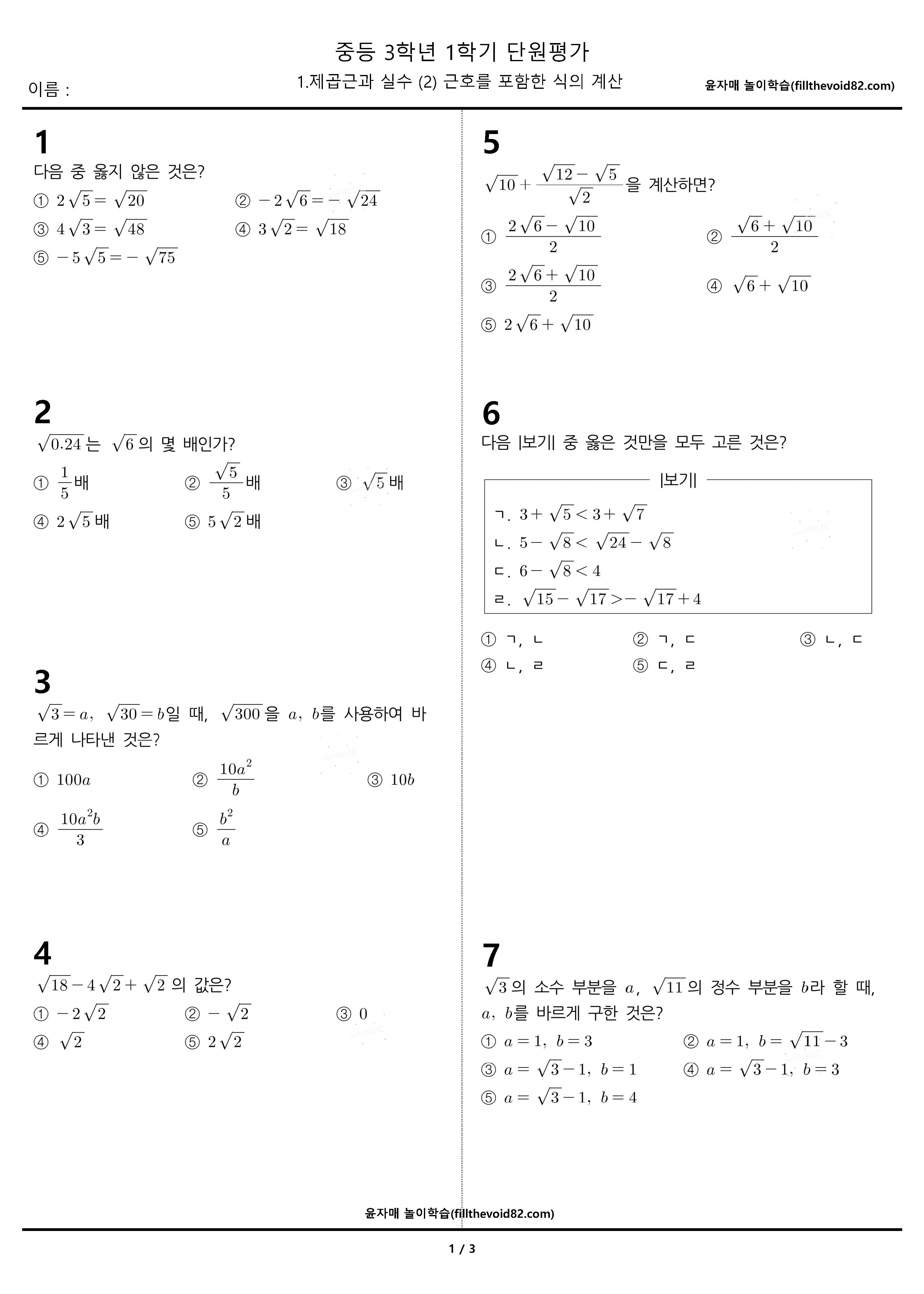 중3 단원평가) 3학년 1학기 1. 제곱근과 실수 (2) 근호를 포함한 식의 계산