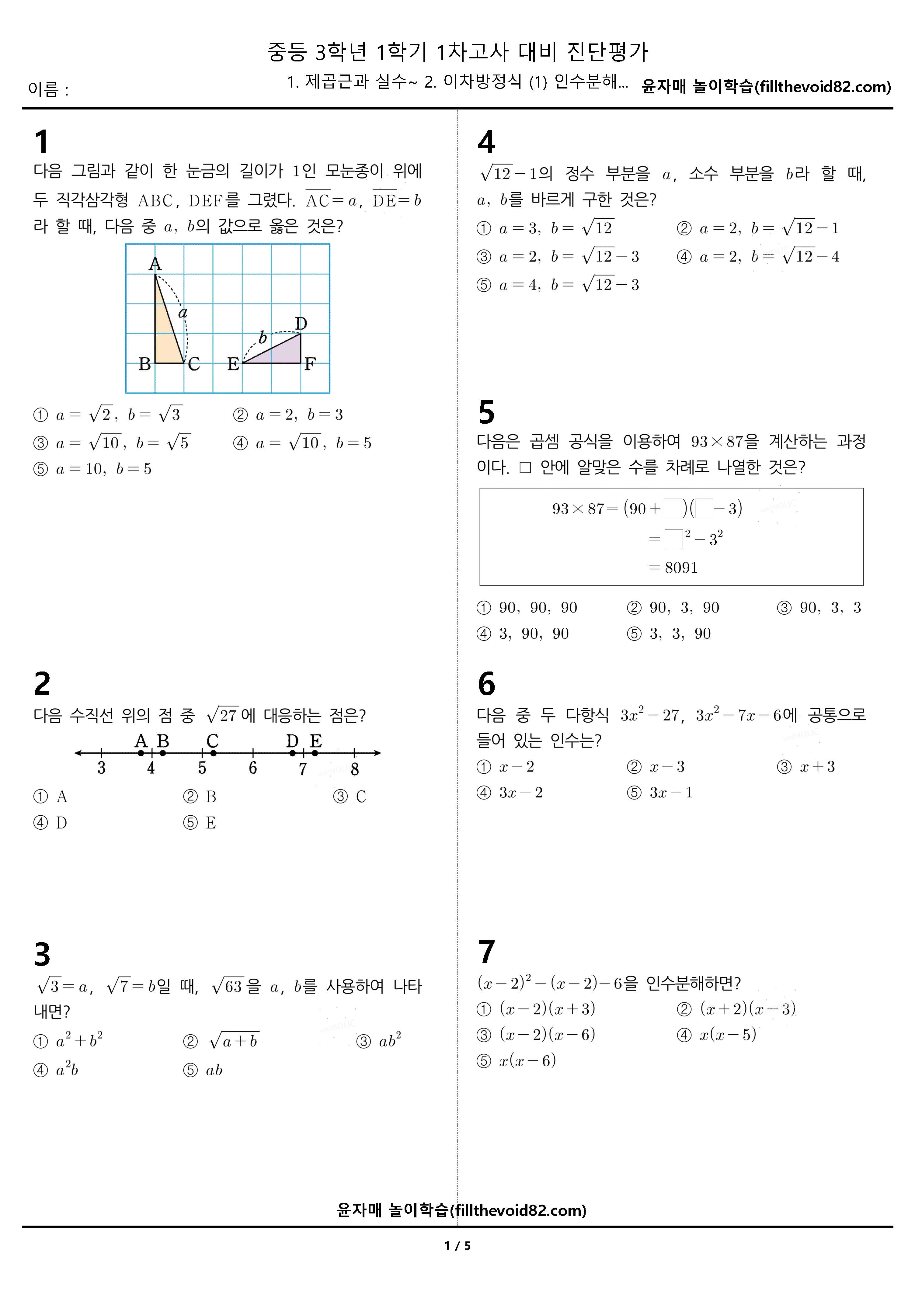 중등 3학년 1학기-3. 이차방정식 연산문제지 중등 3학년 1학기 이차방정식 해를 구하는 연습을 할 수 있는 연산문제 100개입니다. 아주 쉬운 문제들로 이루어져 있습니다. 해를 구하는 것을 어려워하거나 실수가 많은 학생에게 도움을 줄 수 있습니다. 자료가 도움되셨다면 공감과 댓글 부탁드립니다. 수학문제지/중등진단평가 2023.06.24