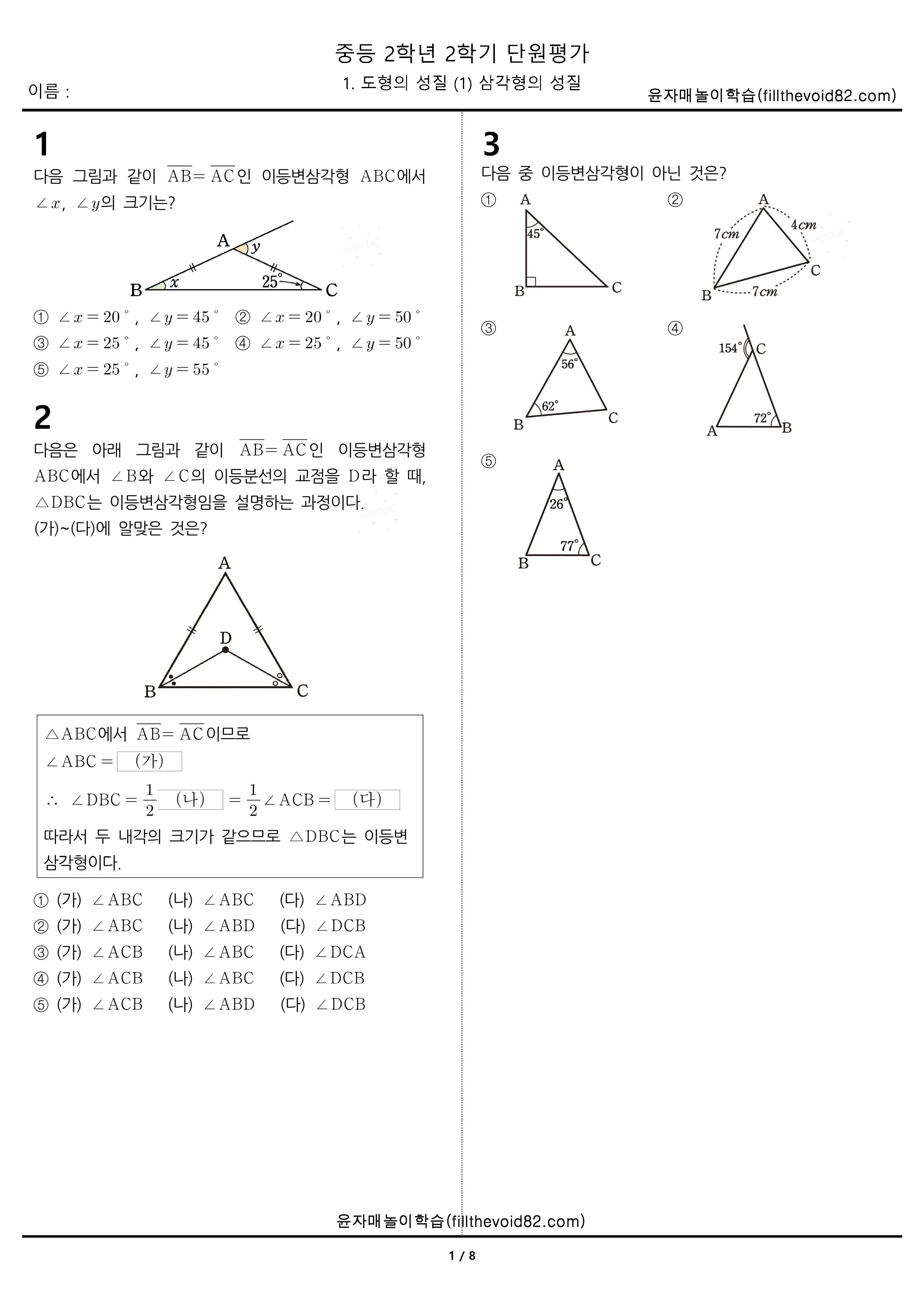 중등무료학습지) 중등단원평가) 중등 2학년 2학기 1. 도형의 성질 (1) 삼각형의 성질 중등 2학년 2학기 1단원을 평가 할 수 있는 무료학습지입니다. 기본 12문제, 실력 12문제, 심화 6문제 총 30문제입니다. 자료가 도움이 되셨다면 공감과 댓글 부탁드립니다. 수학문제지/중등단원평가 2023.09.26