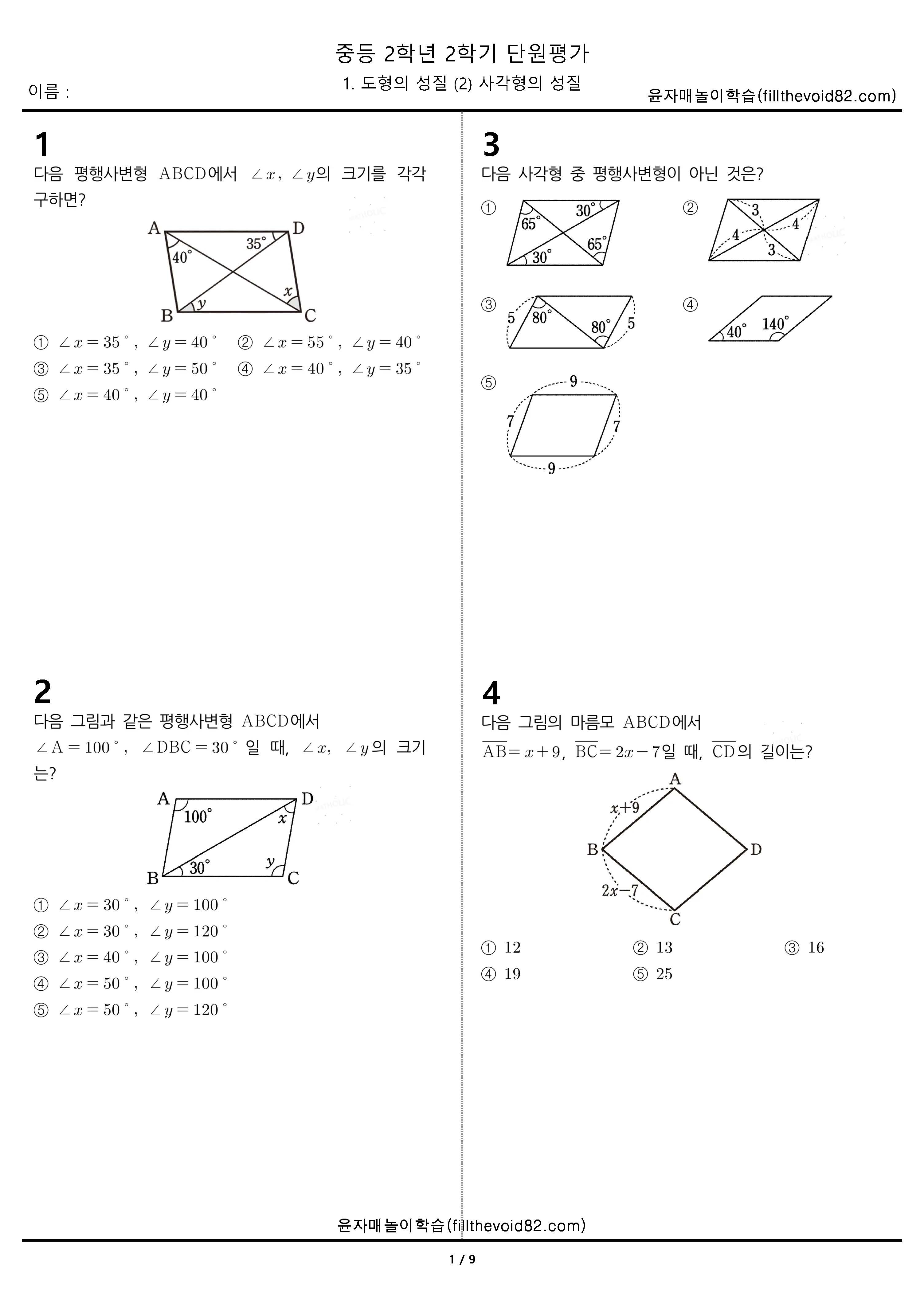 중등무료학습지) 중등단원평가) 중등 2학년 2학기 1. 도형의 성질 (2) 사각형의 성질 중등 2학년 2학기 1단원을 평가 할 수 있는 무료학습지입니다. 기본 7문제, 실력 17문제, 심화 6문제 총 30문제입니다. 자료가 도움이 되셨다면 공감과 댓글 부탁드립니다. 수학문제지/중등단원평가 2023.10.12