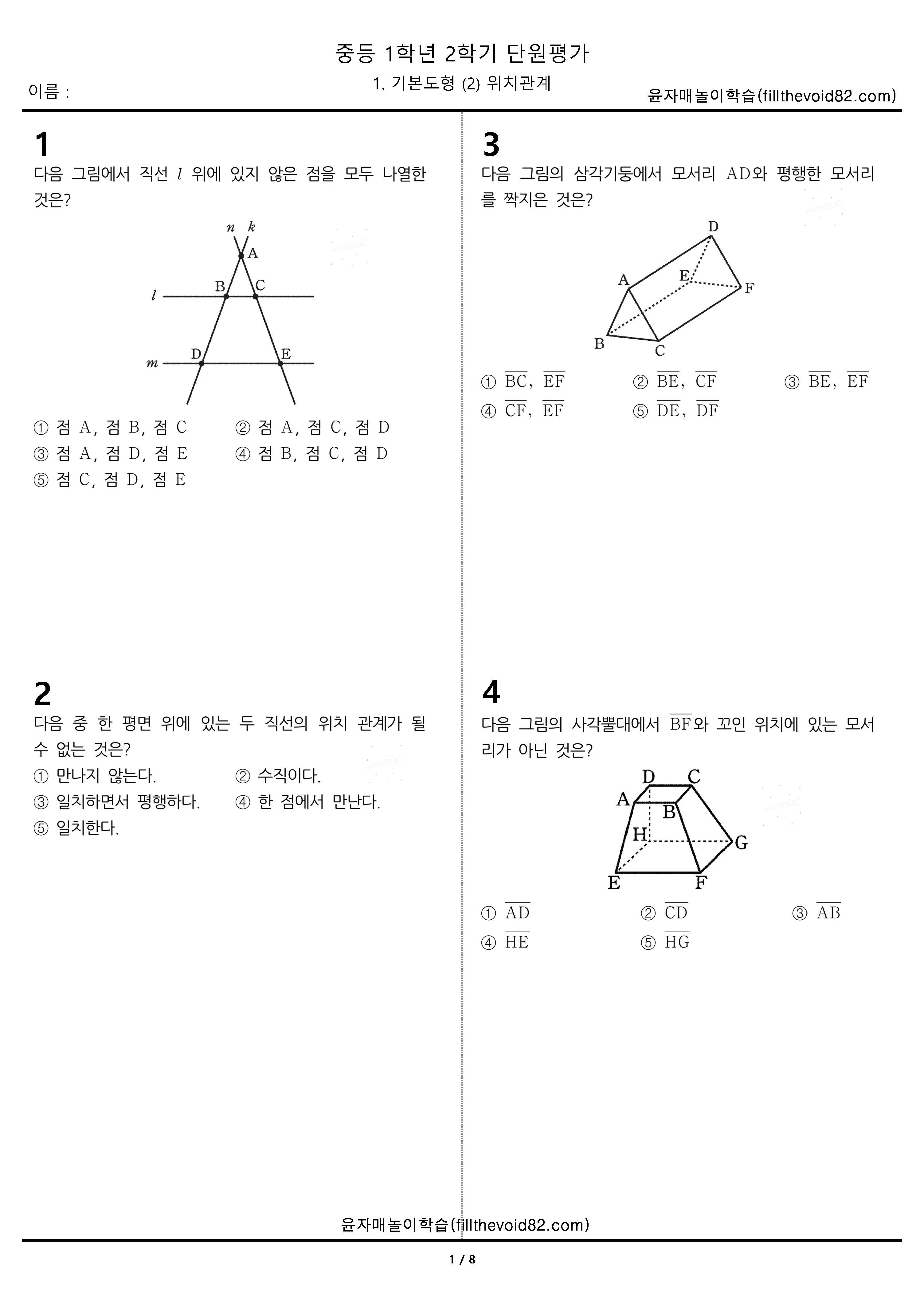 중등무료학습지) 중등단원평가) 중등 1학년 2학기 1. 기본도형 (2) 위치관계 중등 1학년 2학기 1단원을 평가 할 수 있는 무료학습지입니다. 기본 12문제, 실력 12문제, 심화 6문제 총 30문제입니다. 자료가 도움이 되셨다면 공감과 댓글 부탁드립니다. 수학문제지/중등단원평가 2023.09.25