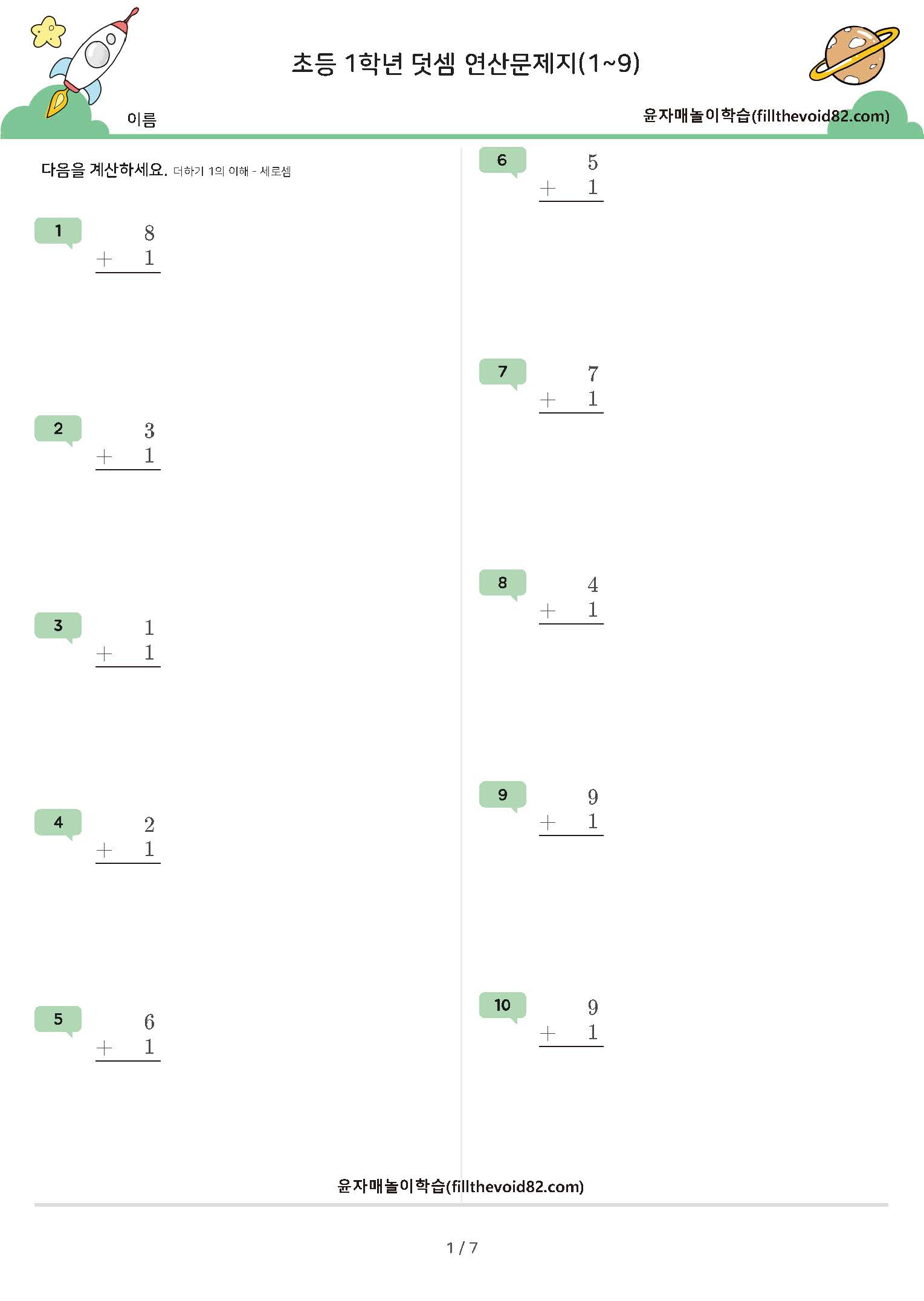 한자리 수+한자리 수 덧셈 연산문제지입니다. (받아올림 있음)