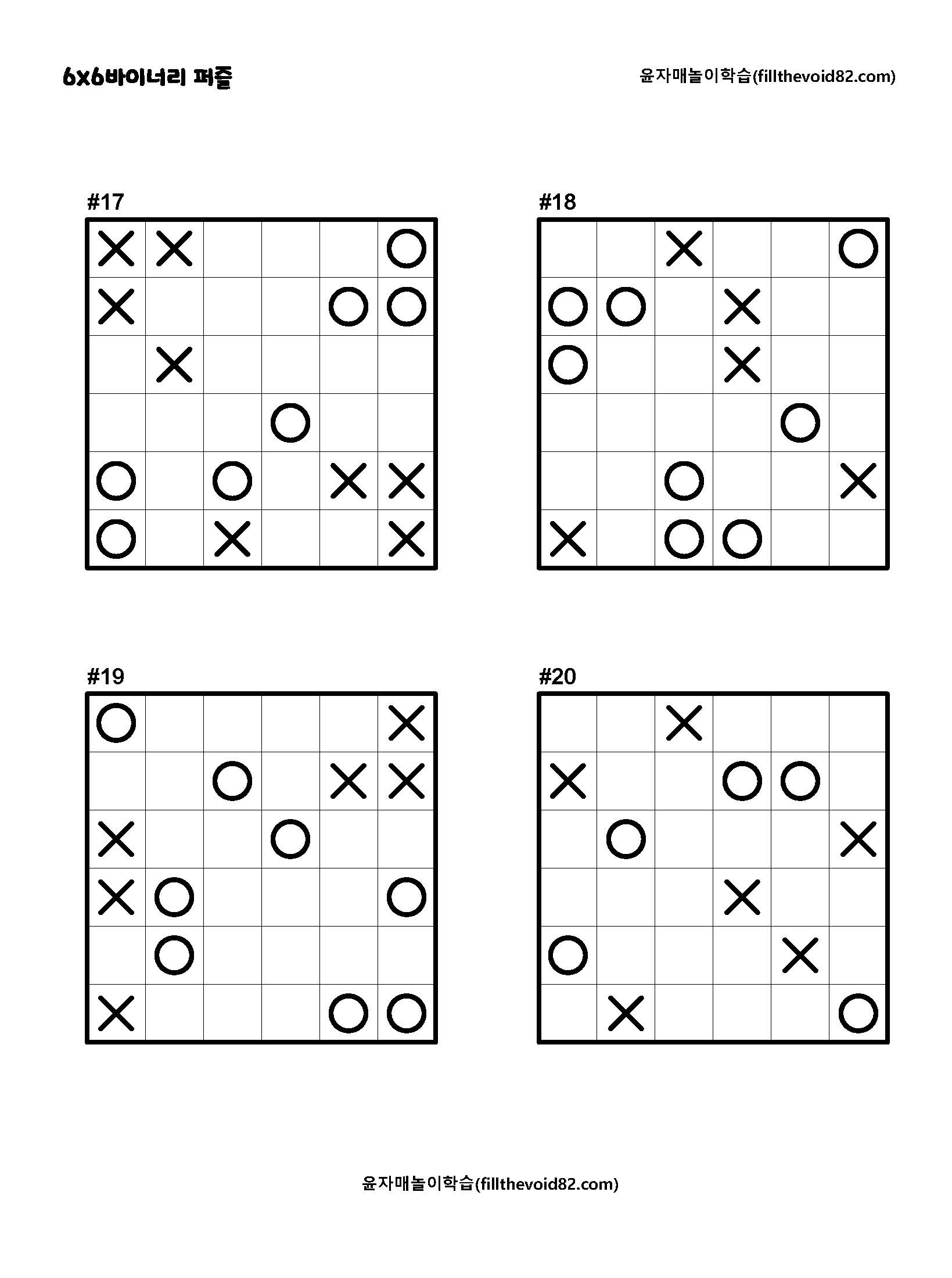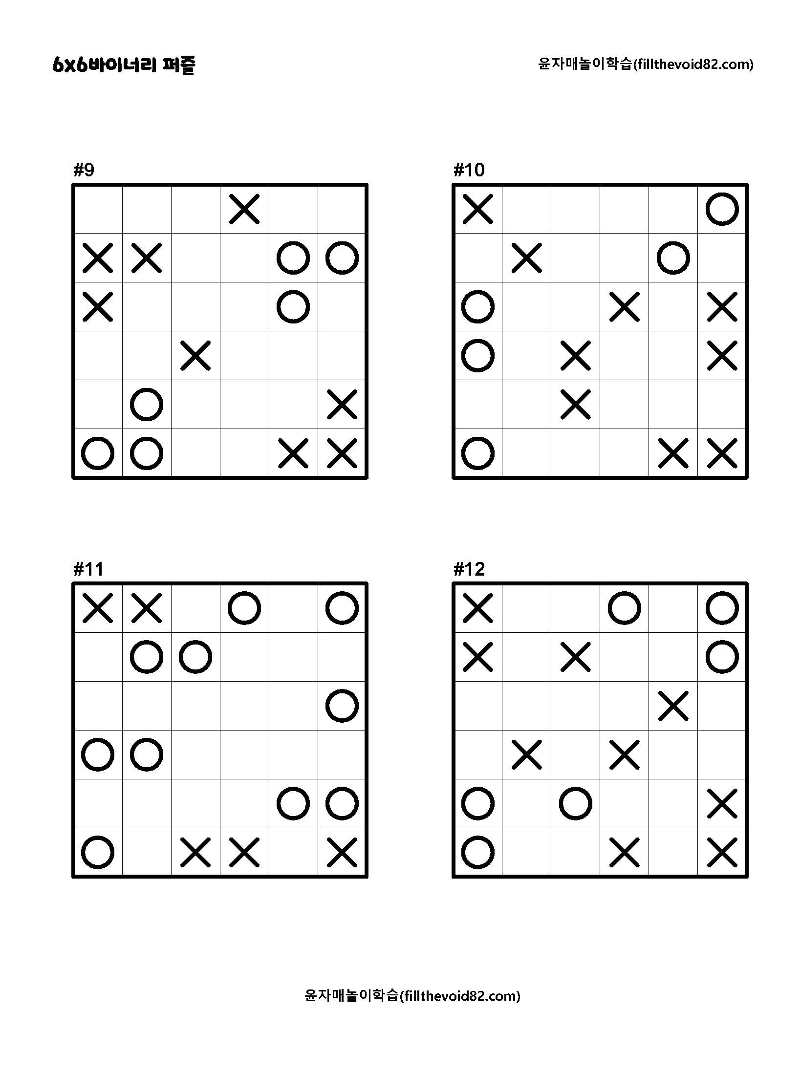 0,X로 모든 칸을 채우는 바이너리 퍼즐입니다. 모든 칸을 채우고 나면 성취감과 사고력이 높아진 것을 느끼게 될 것입니다.
