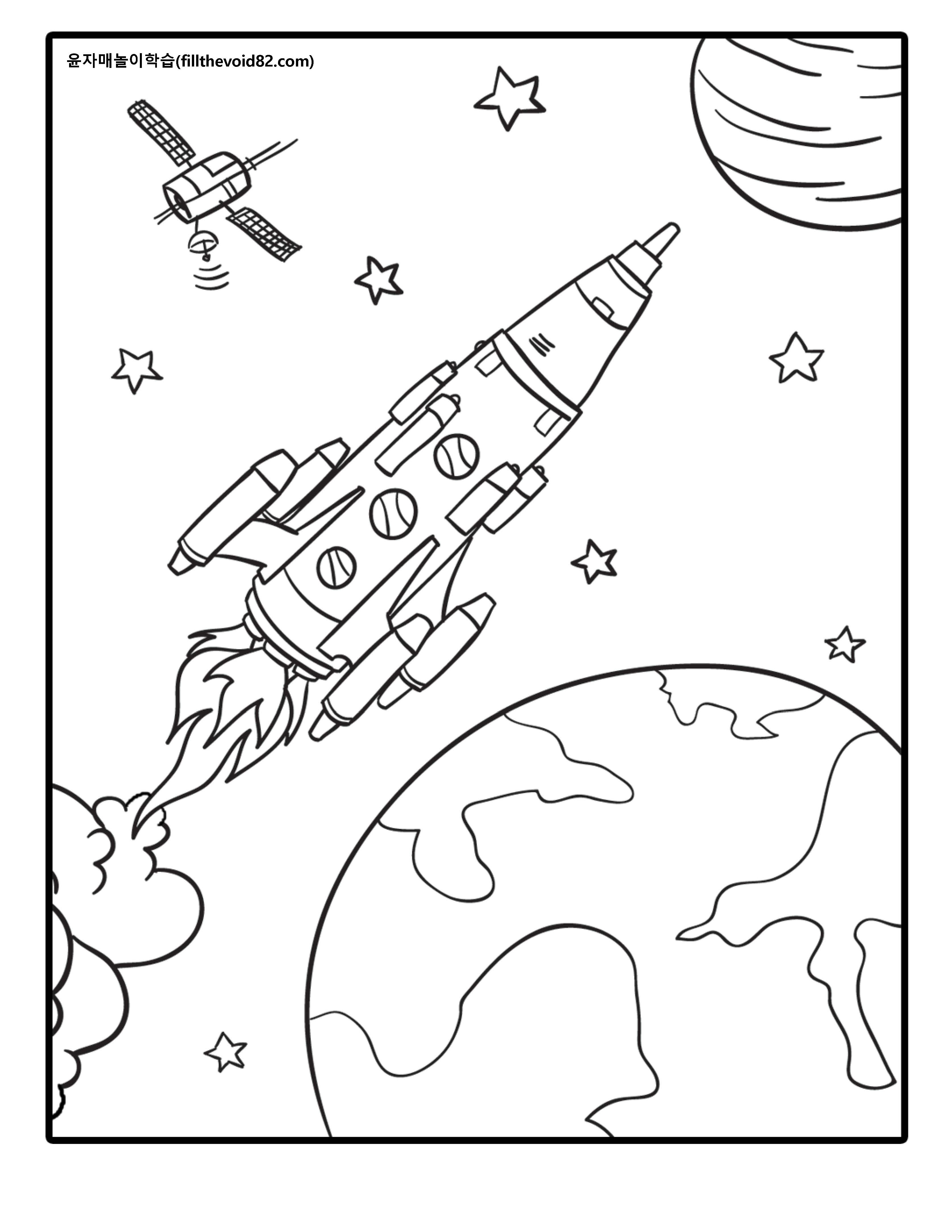 우주선과 우주의 모습을 색칠하는 활동지입니다.