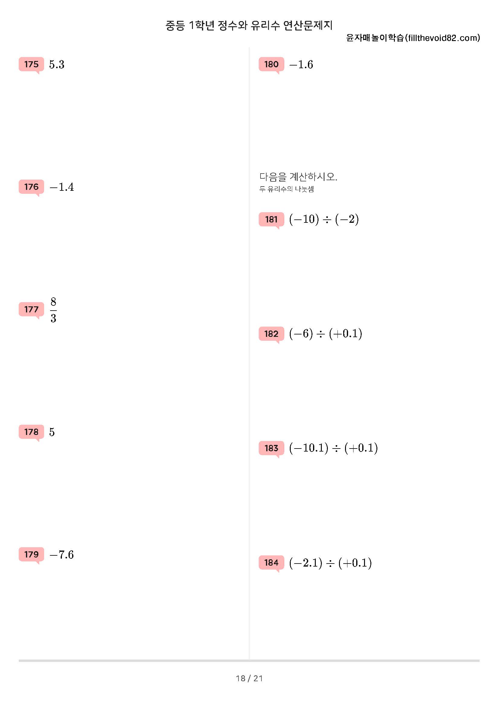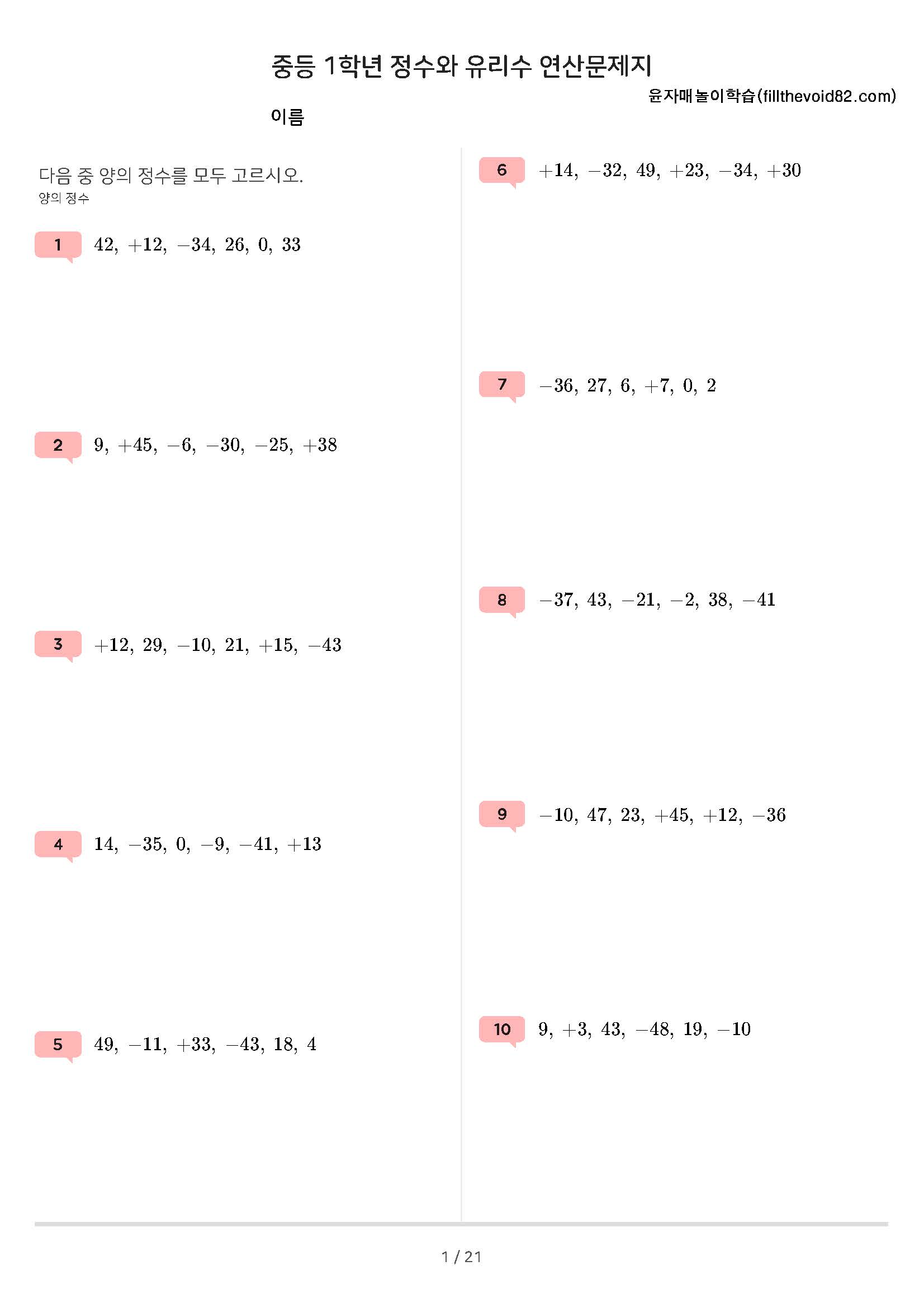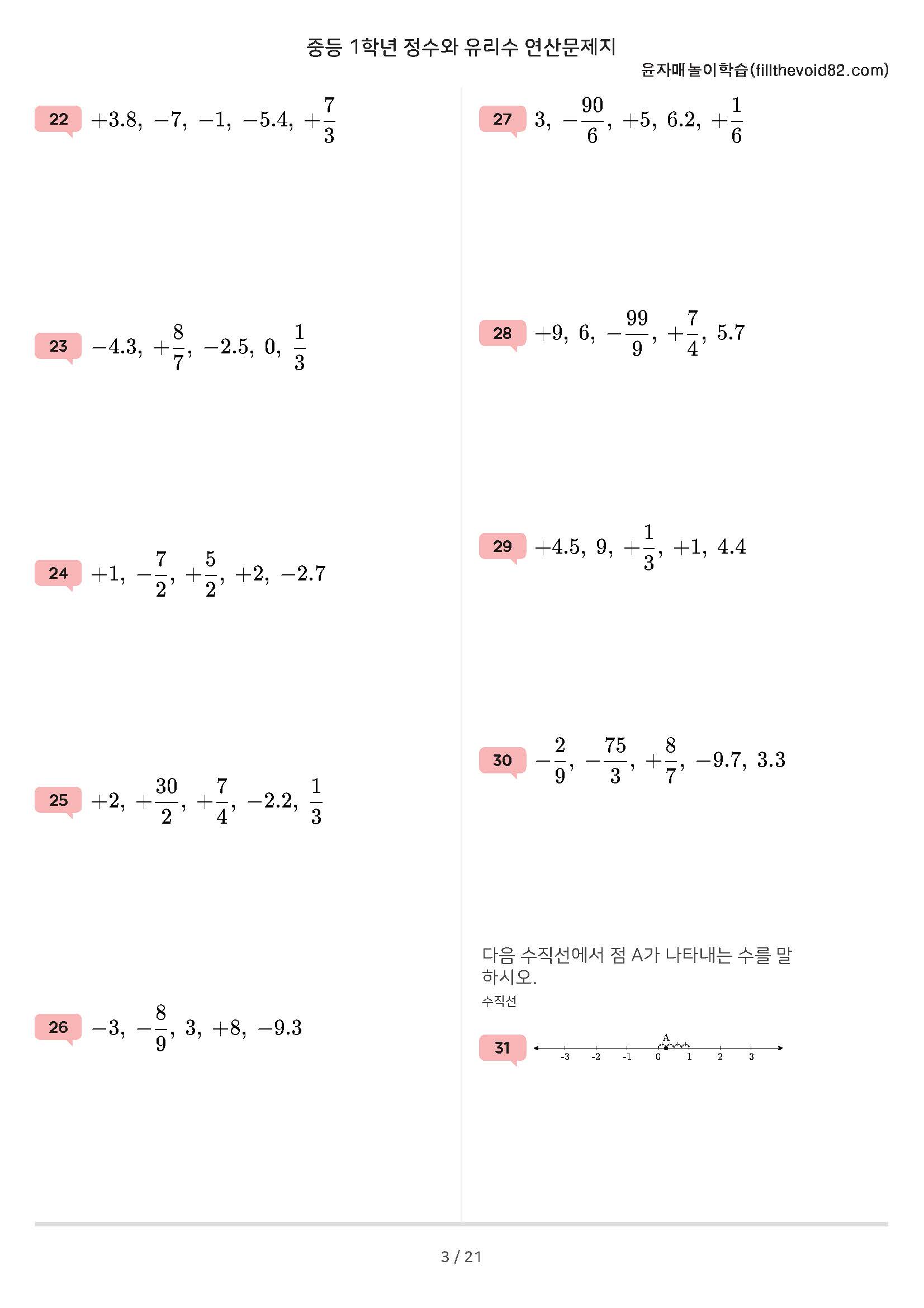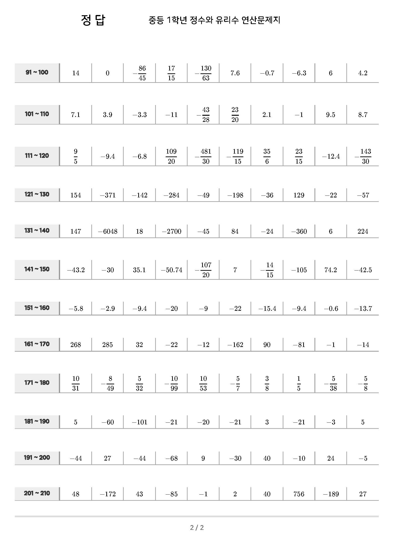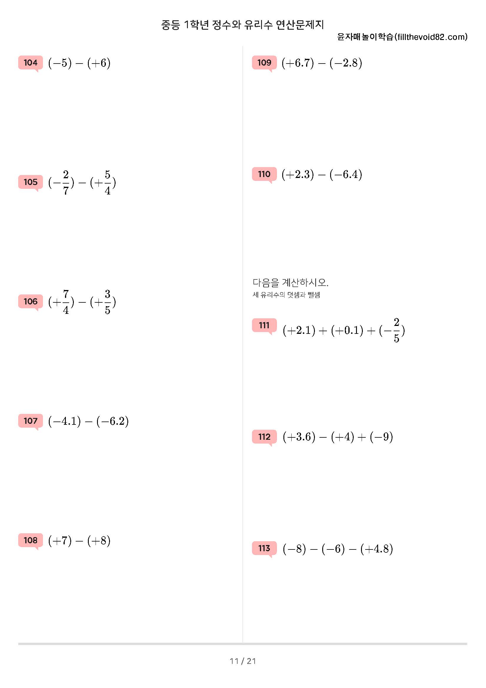 정수와 유리수, 절댓값, 정수와 유리수 크기 비교, 정수와 유리수의 덧셈과 뺄셈 연산문제 210문제로 구성되어 있습니다.