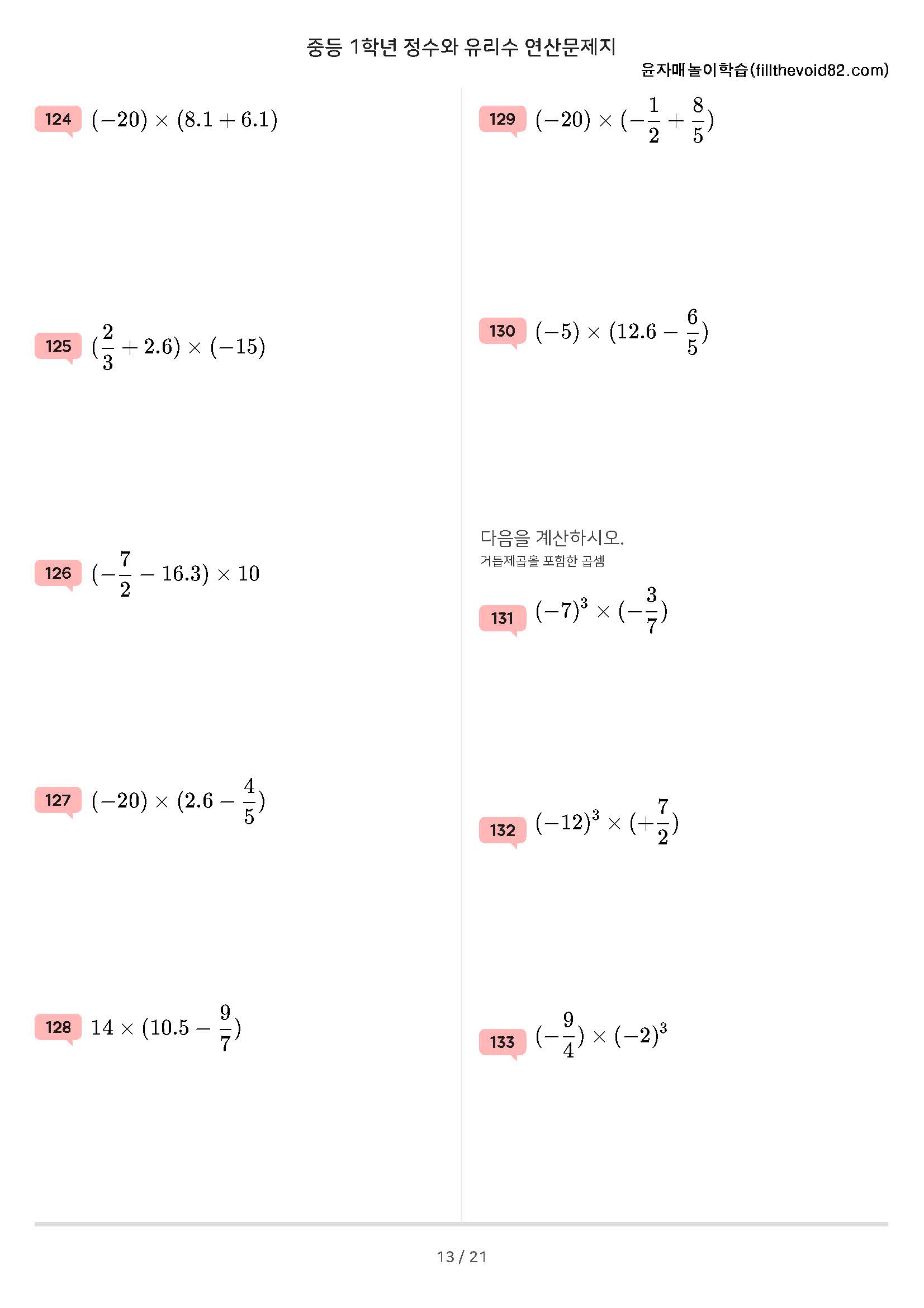 중등 1학년 정수와 유리수를 익힐 수 있는 연산문제지입니다.