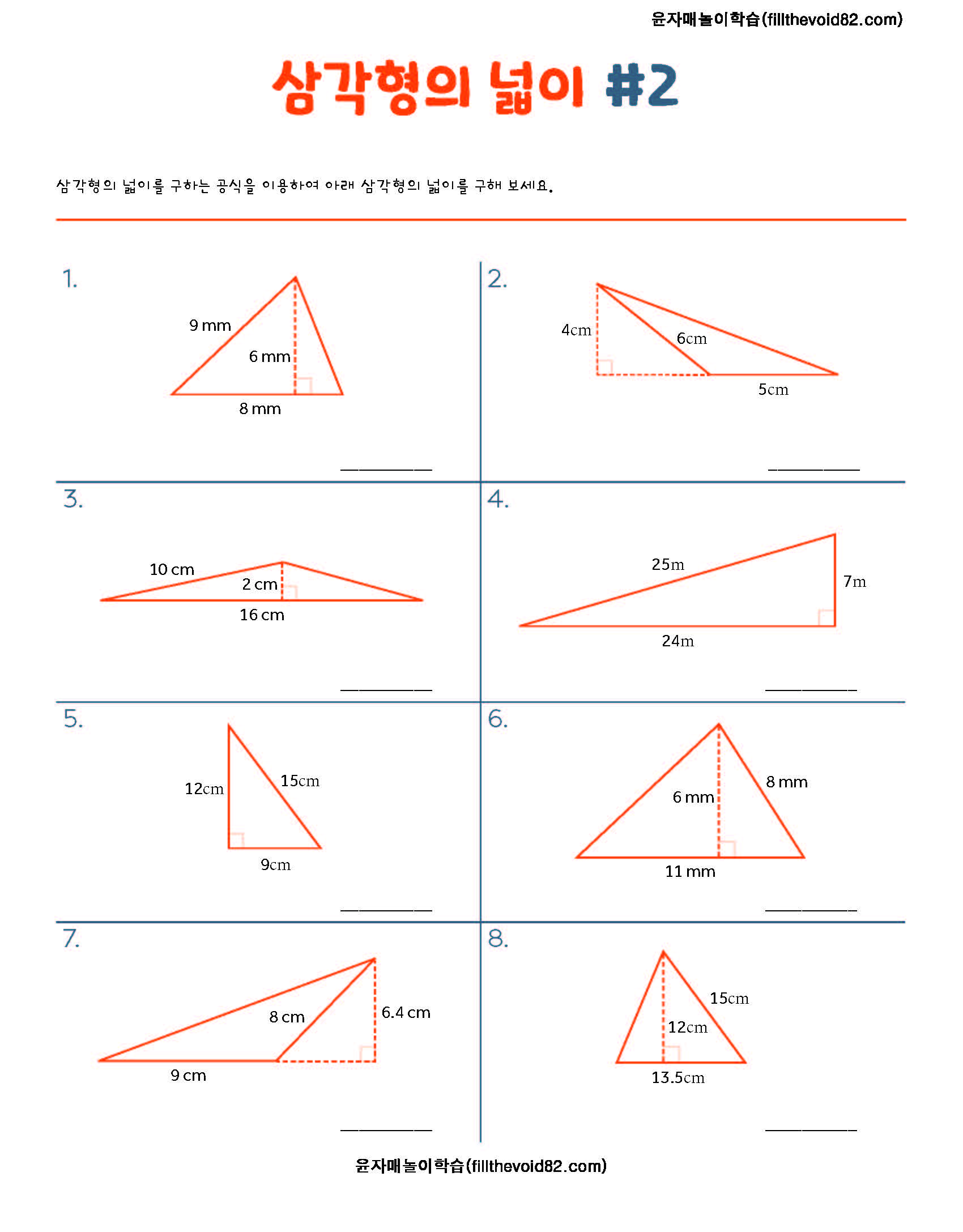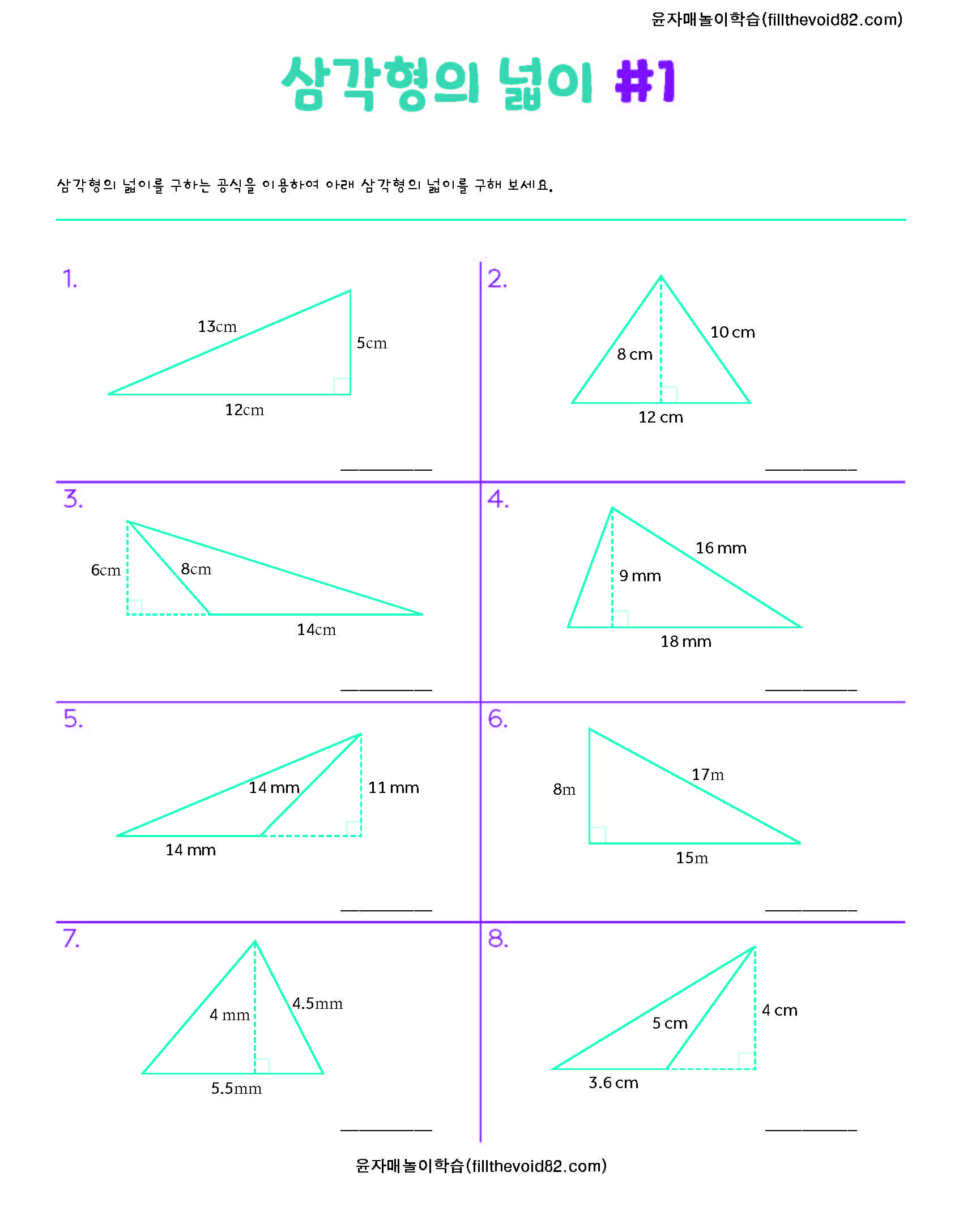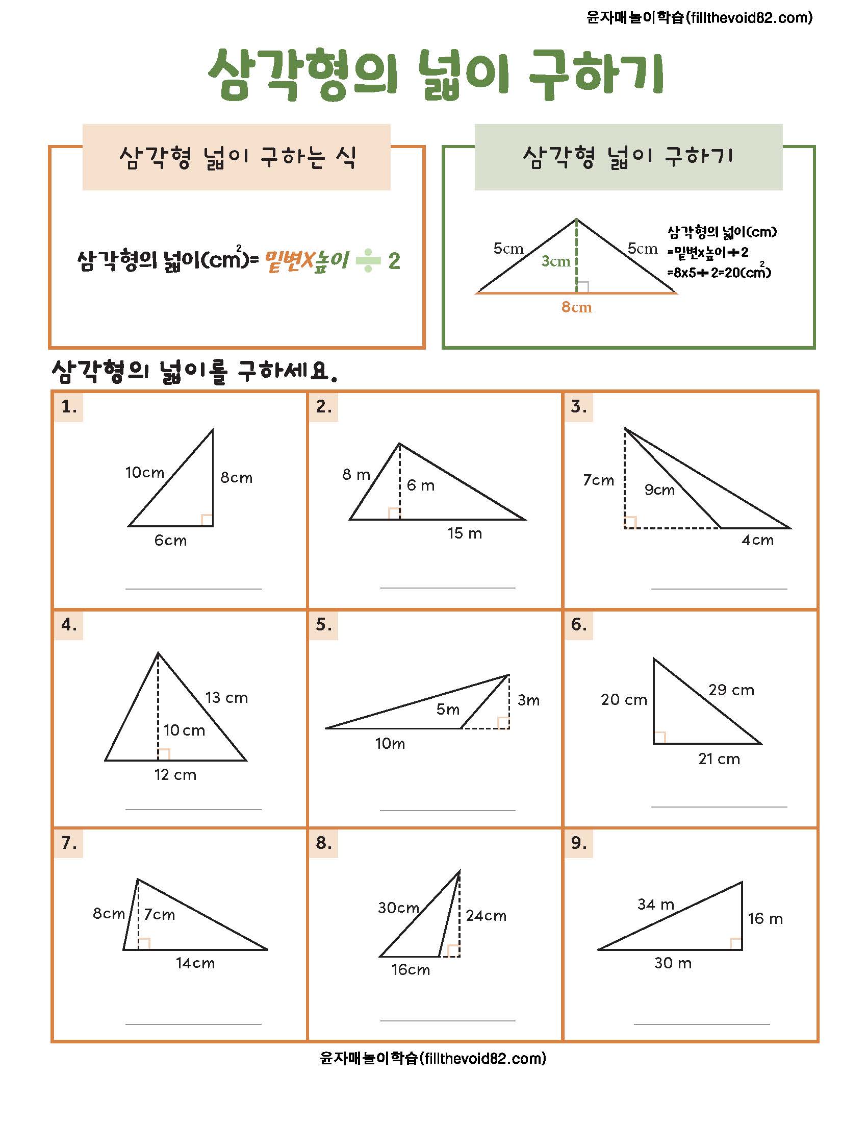 삼각형의 넓이를 구하는 공식을 알고 삼각형의 넓이를 구해보는 활동지입니다.