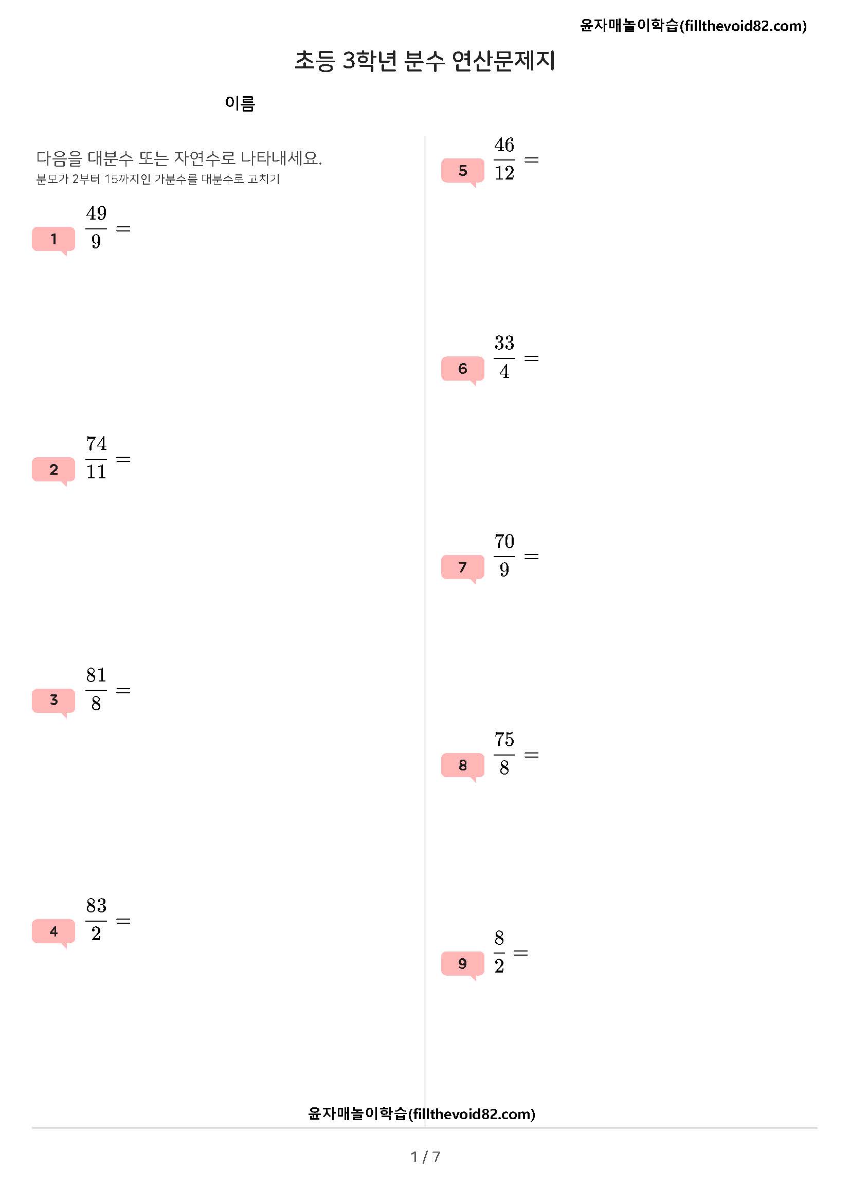 분수의 개념을 꼼꼼하게 학습한 후 완전히 익힐 수 있는 연습을 할 수 있는 연산 문제지입니다