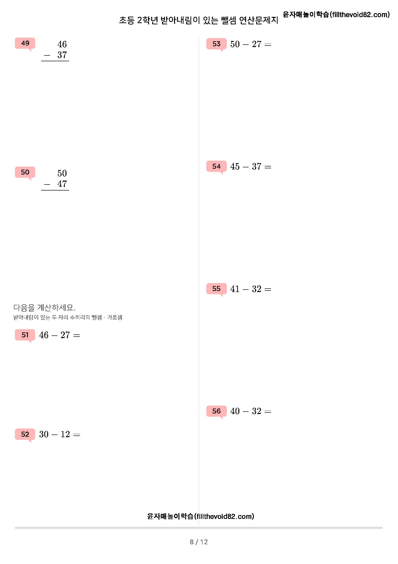 무료학습지) 초2 받아내림이 있는 뺄셈 연산문제지