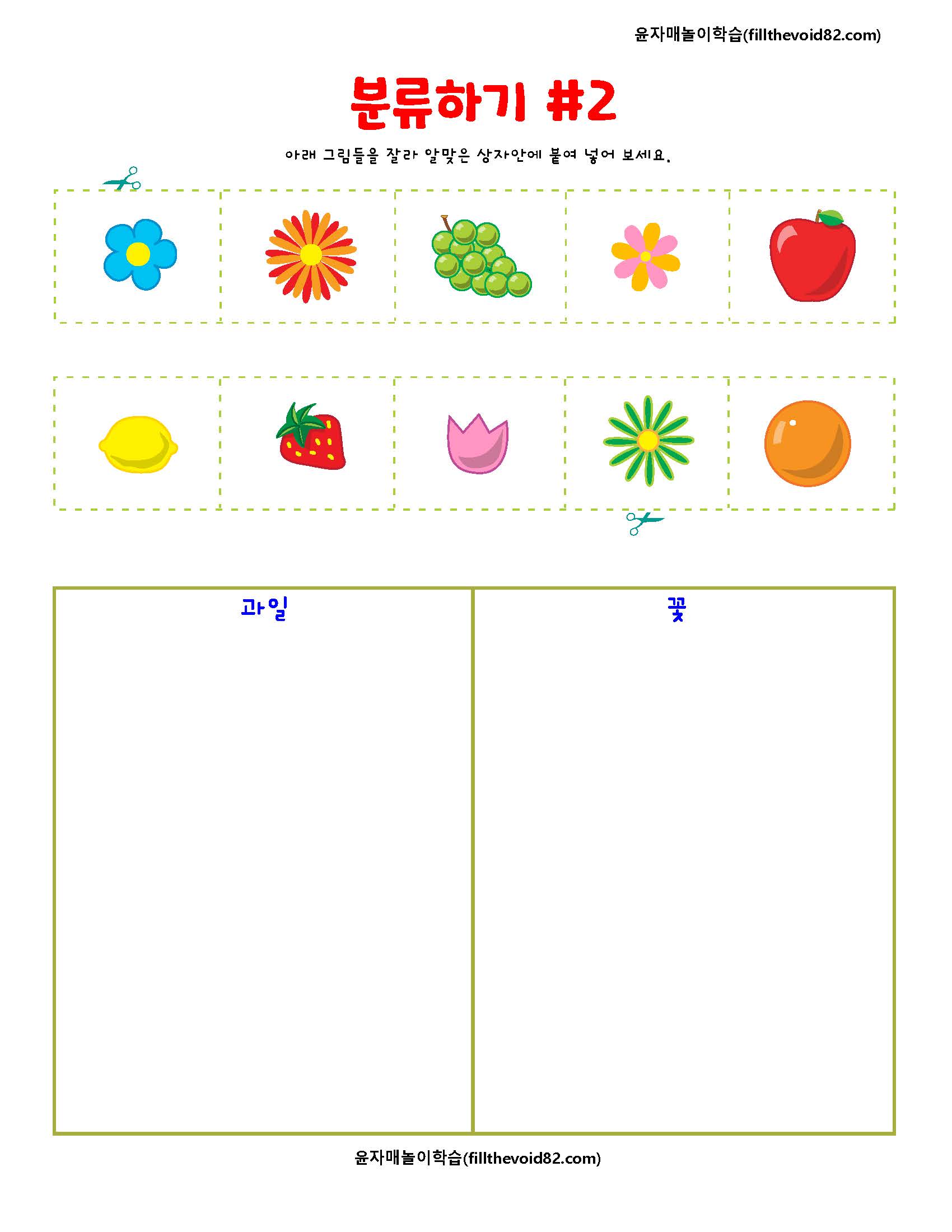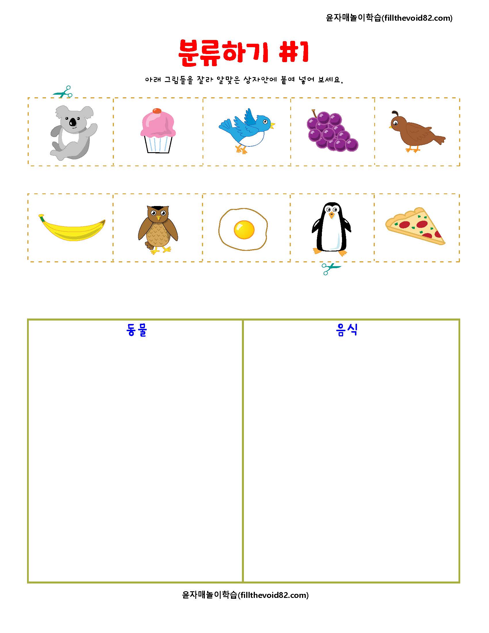 주제에 맞도록 분류하여 알맞은 상자에 잘라 붙여넣어보는 유아 학습지입니다.