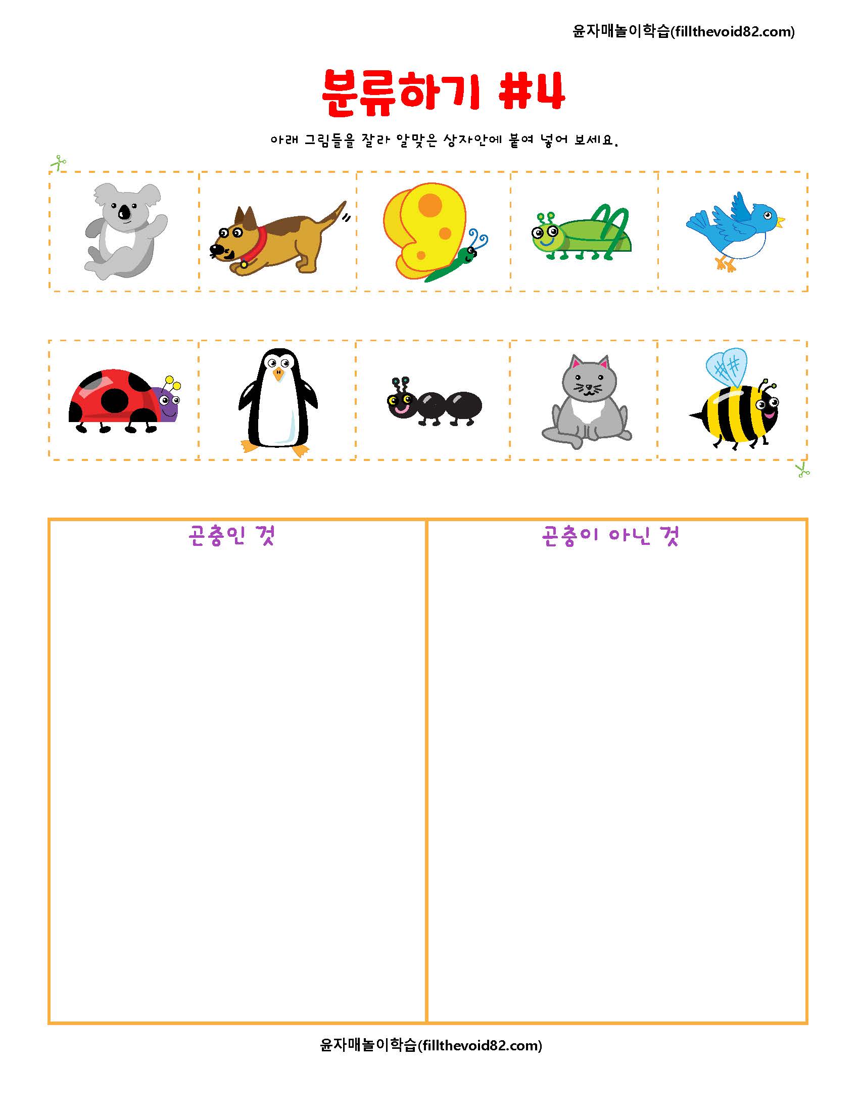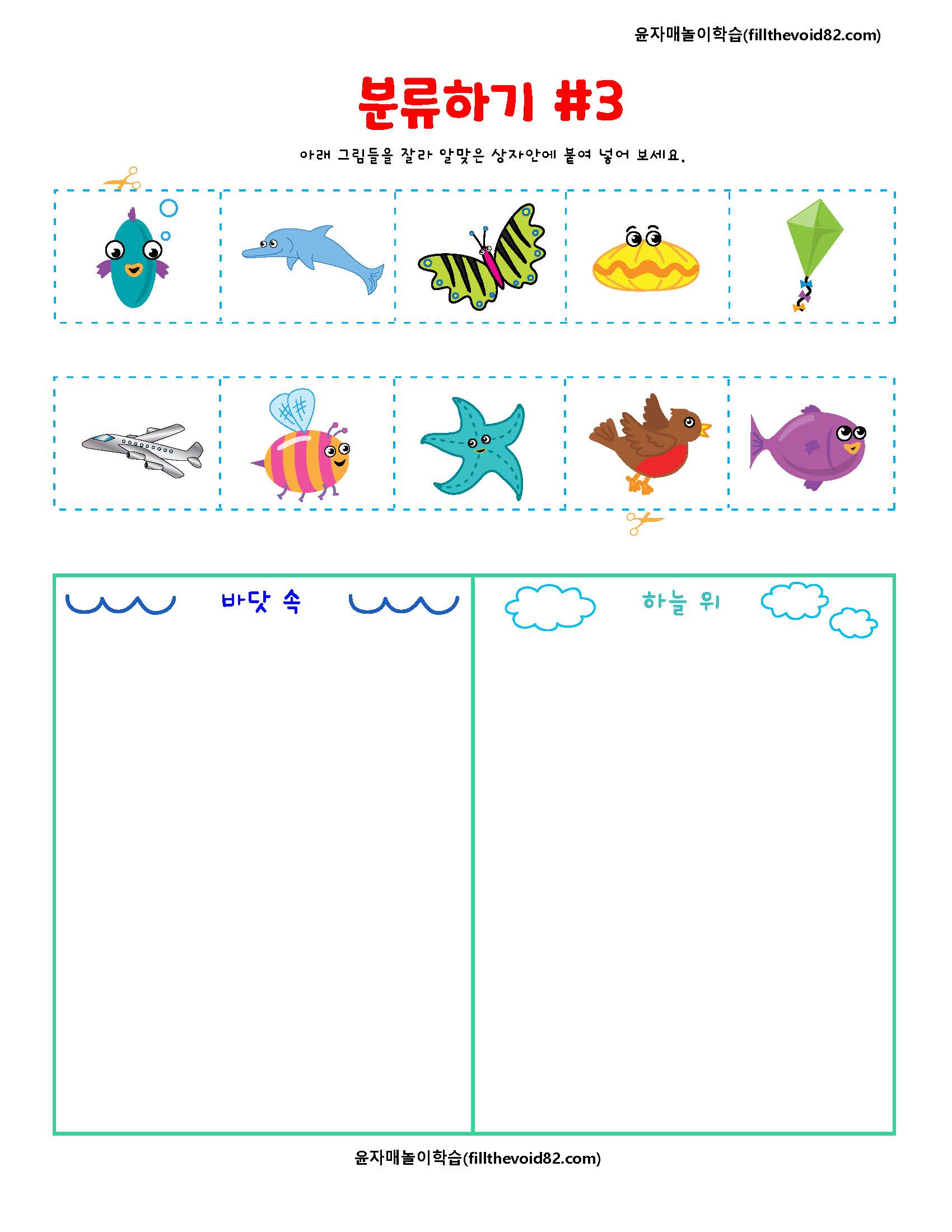주제에 맞도록 분류하여 알맞은 상자에 잘라 붙여넣어보는 유아 학습지입니다.
