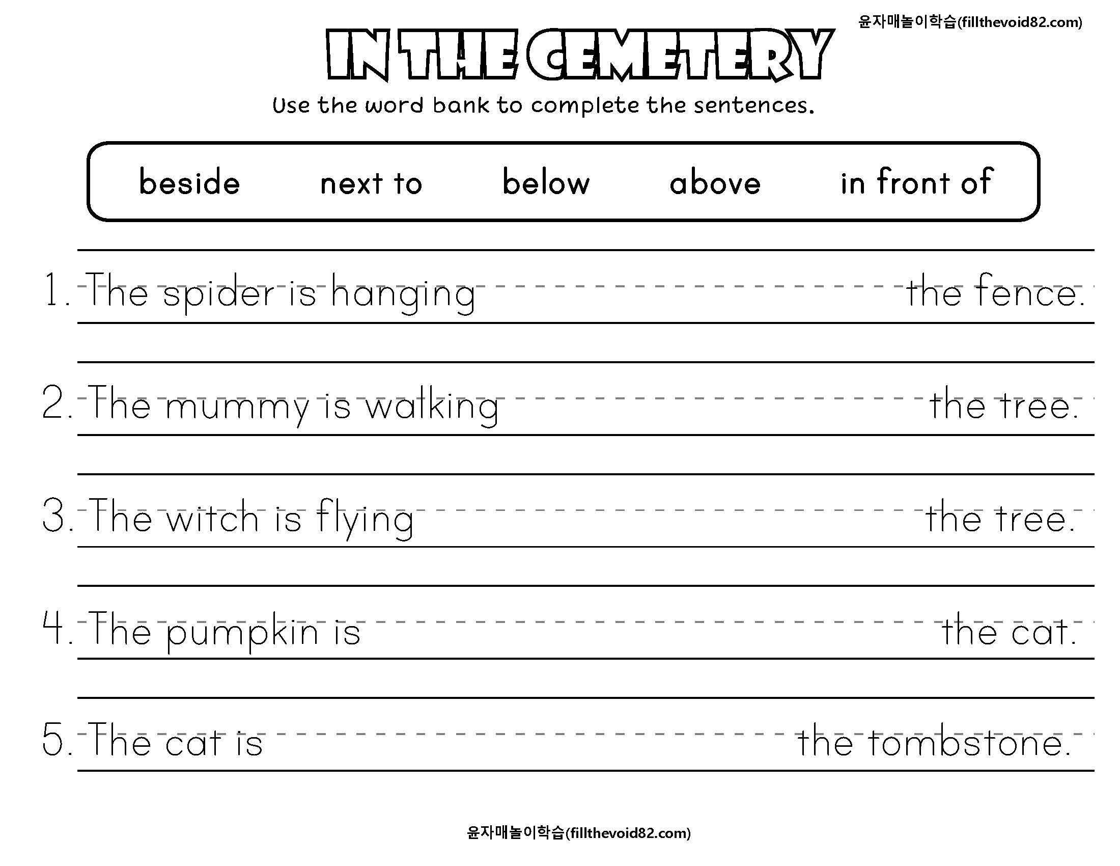 재미있는 할로윈 프린트로 위치에 맞는 단어와 문구를 연습 해 볼 수 있는 활동지입니다.