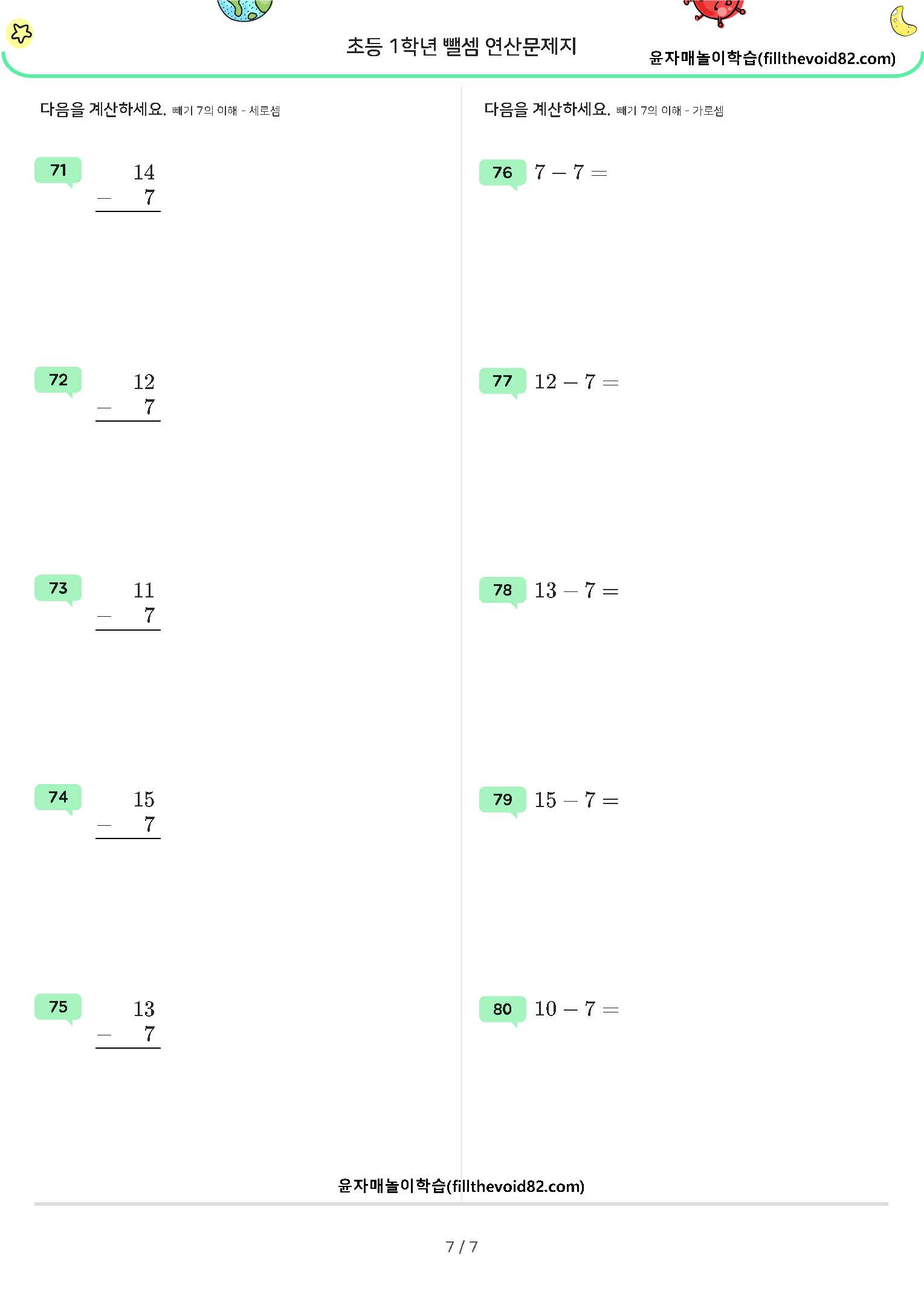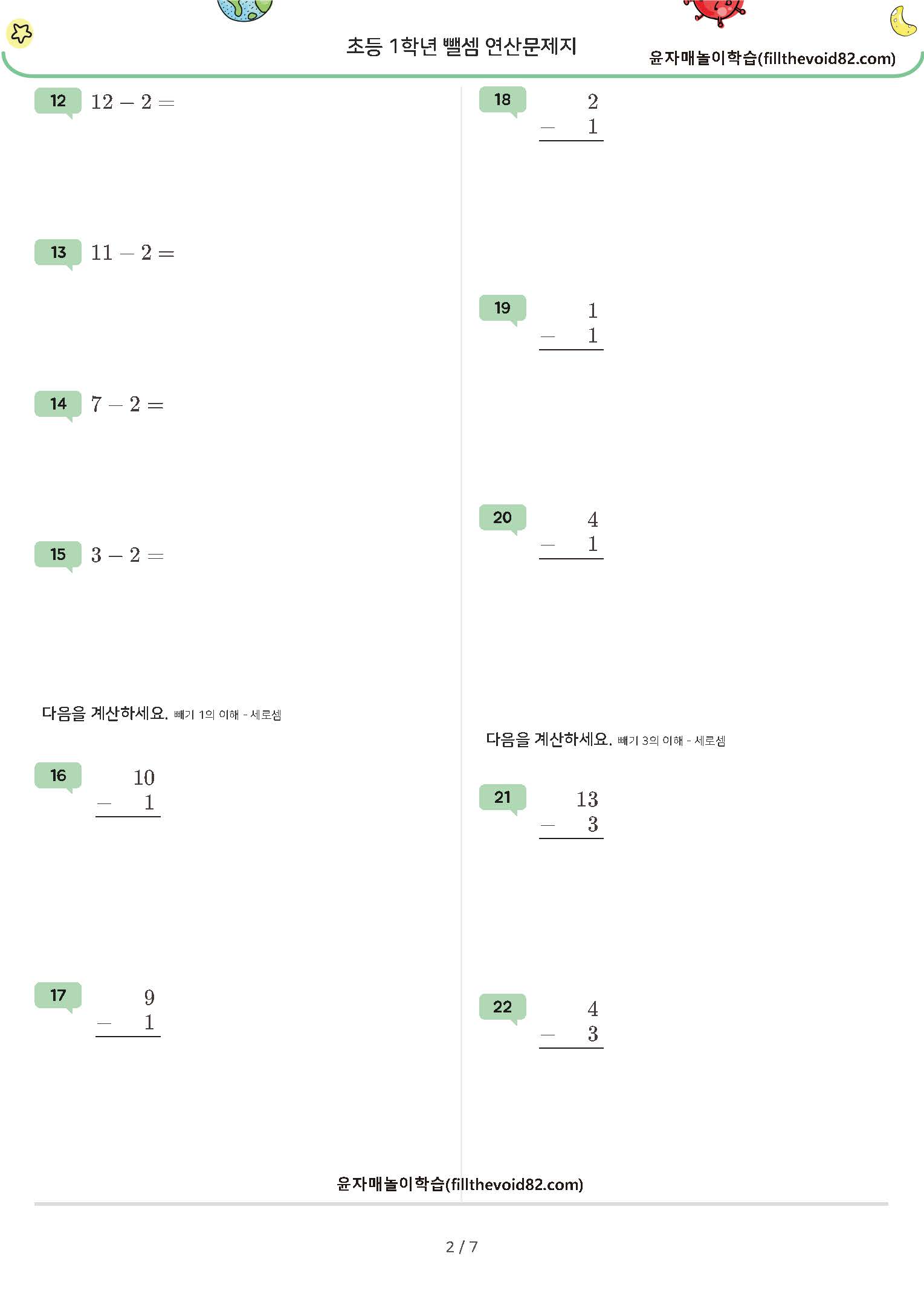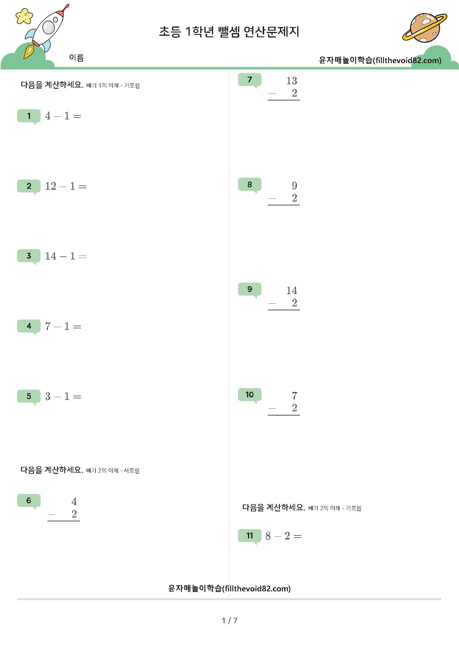 한자리 수 - (1~7), 두자리 수 - (1~7) 연산문제지입니다. (받아내림 있음)