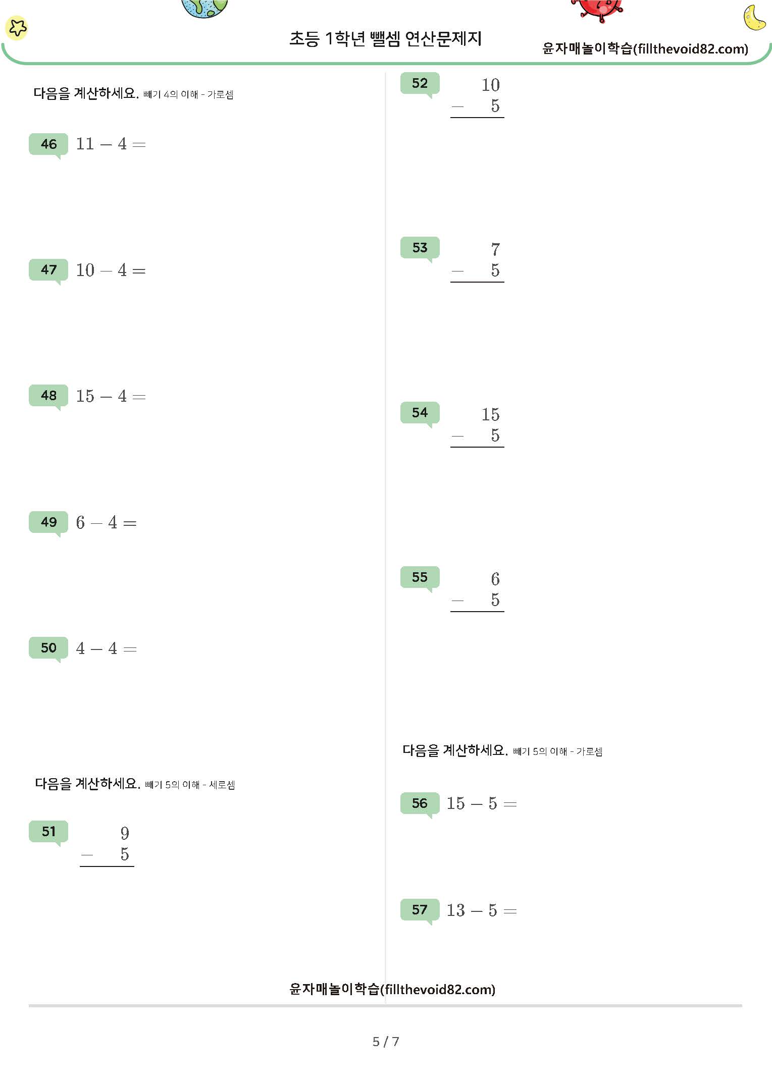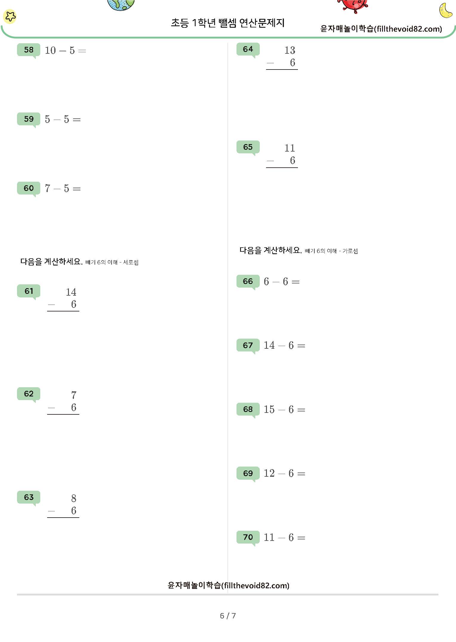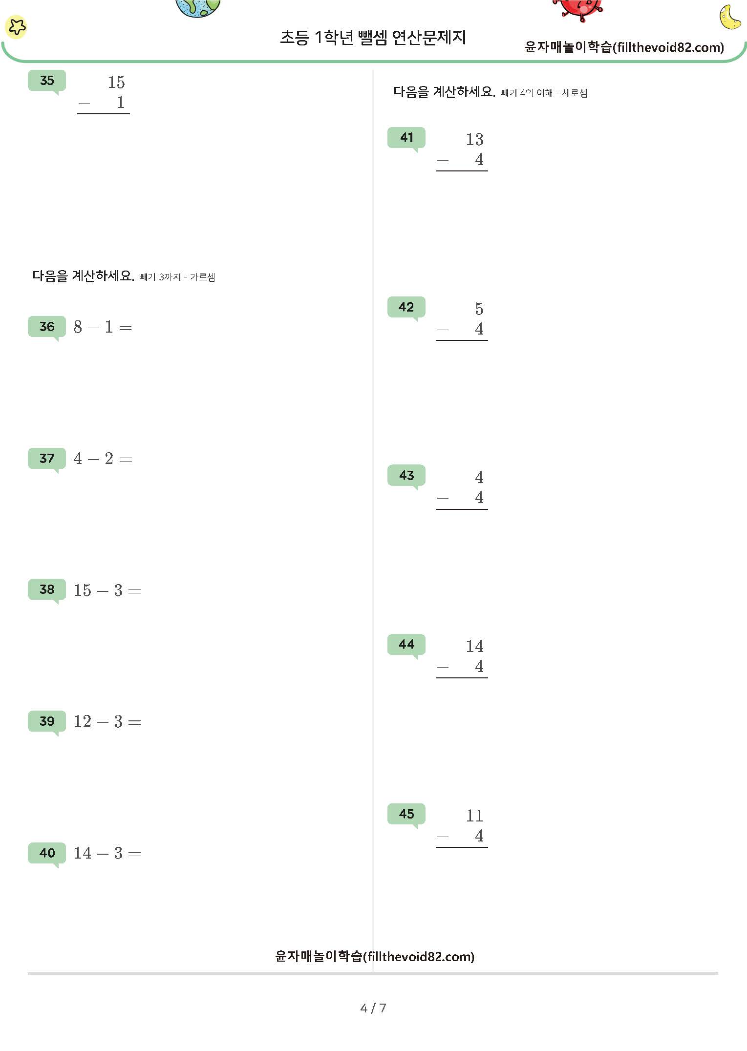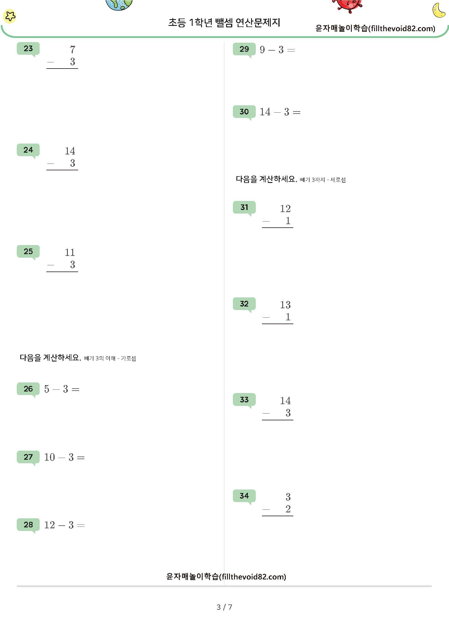 한자리 수 - (1~7), 두자리 수 - (1~7) 연산문제지입니다. (받아내림 있음)