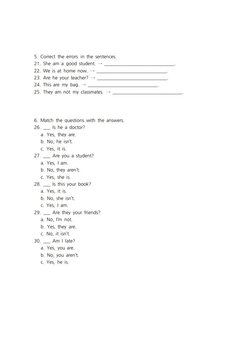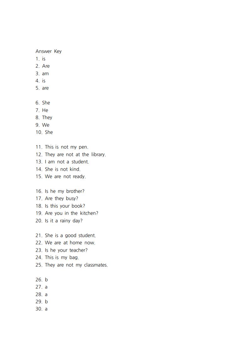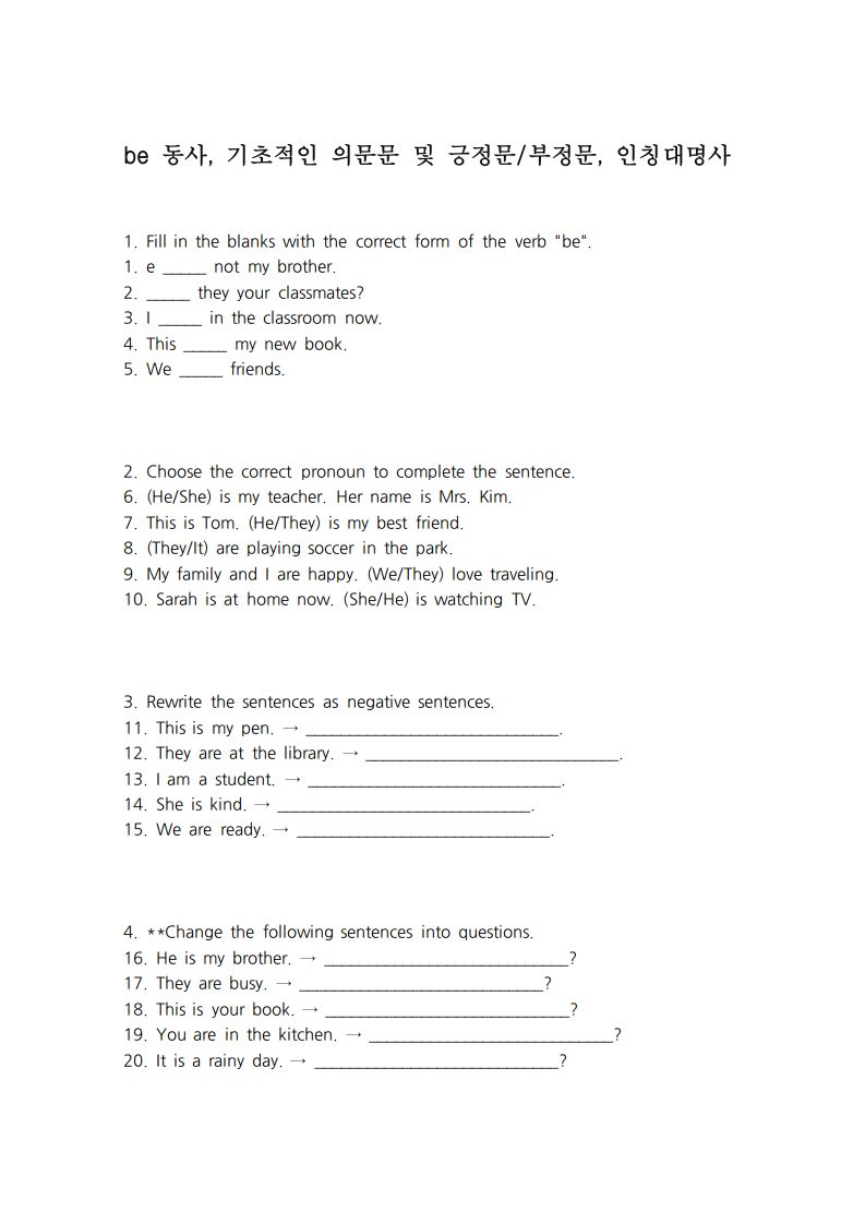 중학교 1학년 영어 교과서 1단원에서는 주로 다루는 문법 내용을 바탕으로 만든 문제들입니다. 보통 1단원에서는 be 동사, 기초적인 의문문 및 긍정문/부정문, 그리고 인칭대명사 등이 다뤄집니다.