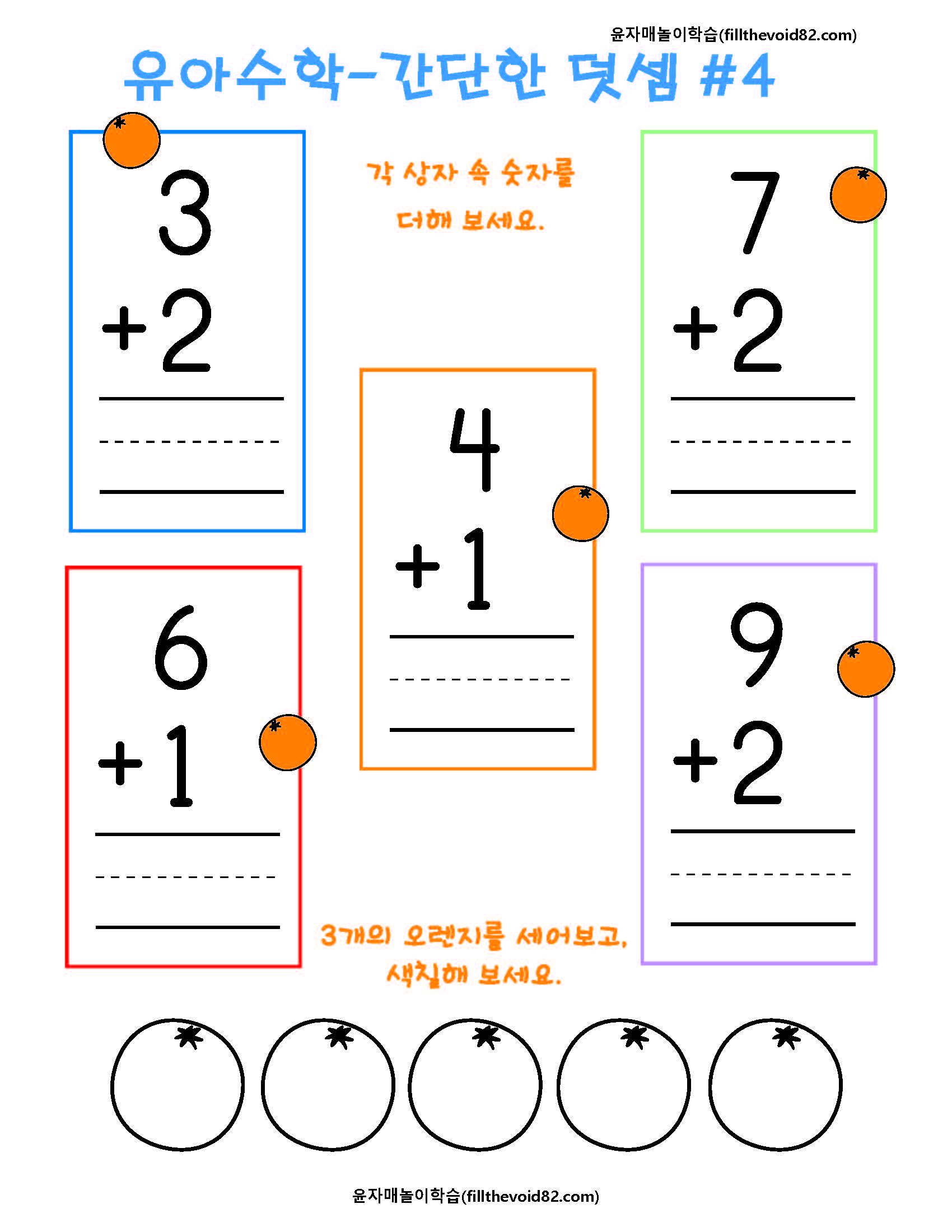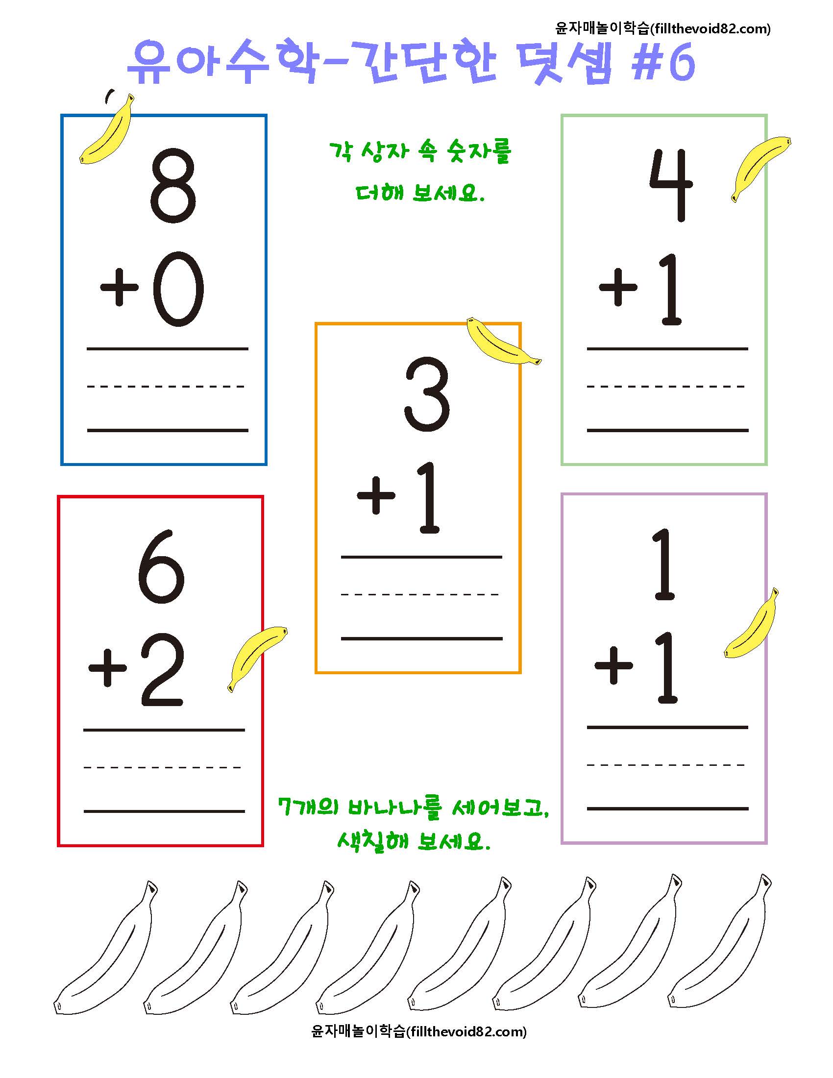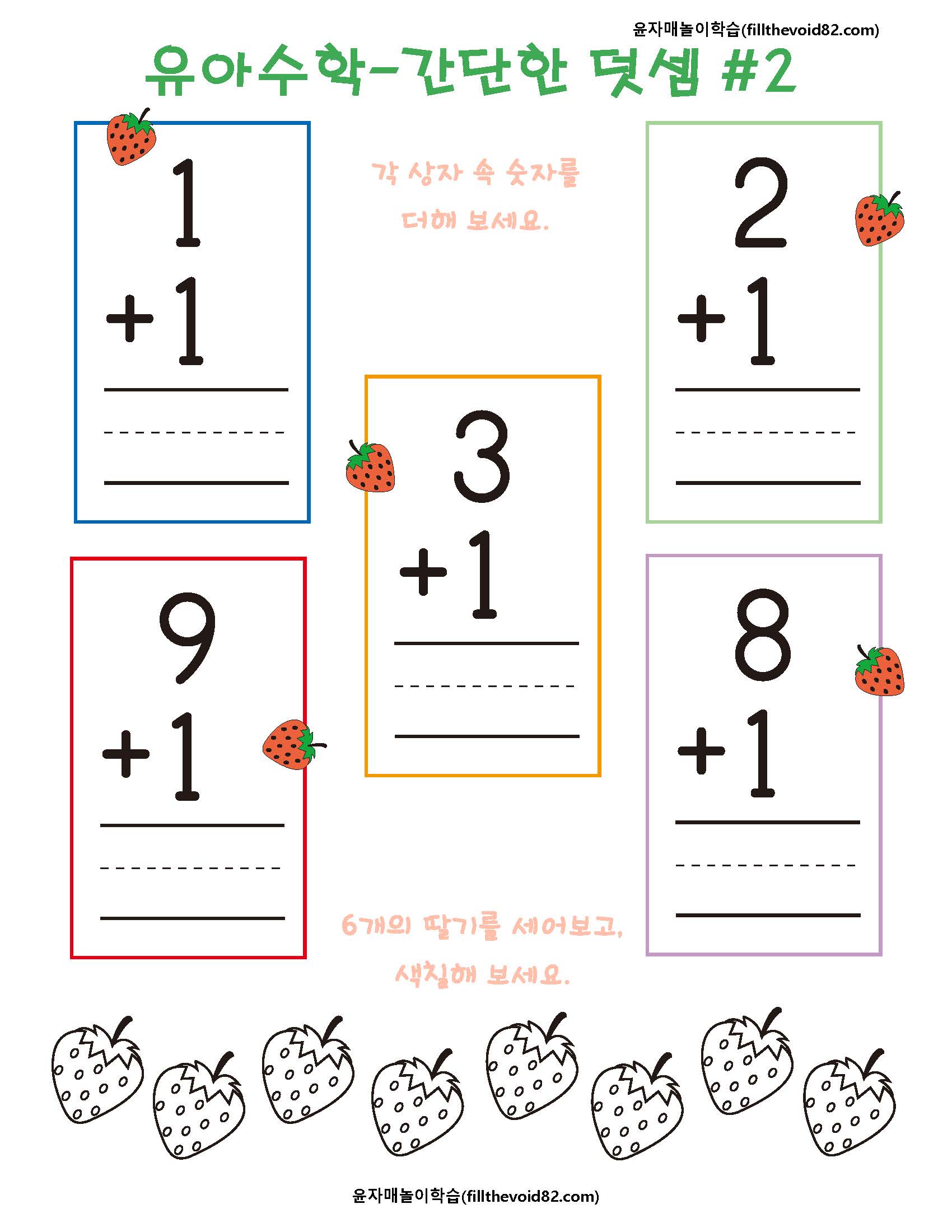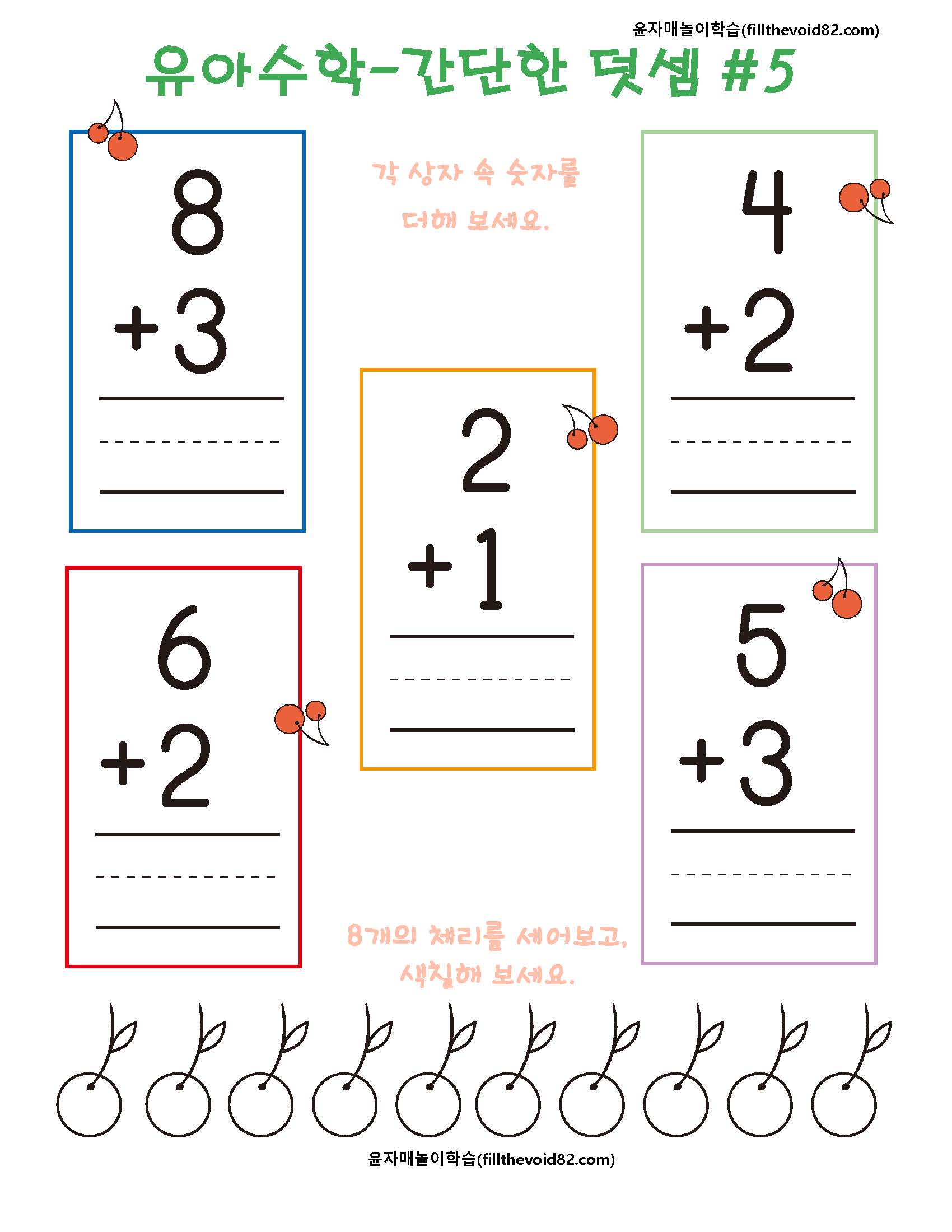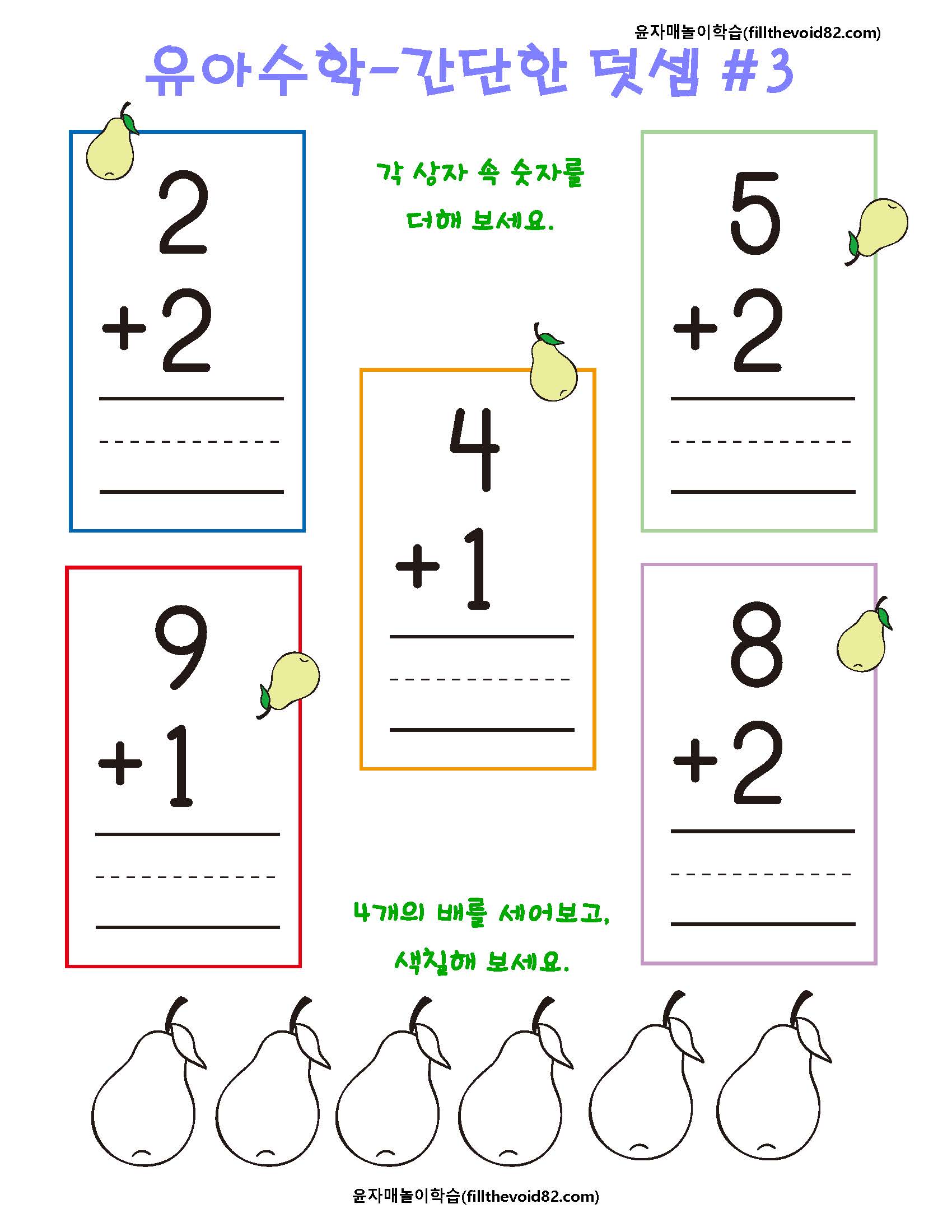 취학 전 아이들이 재밌게 할 수 있는 간단한 덧셈 워크지입니다.