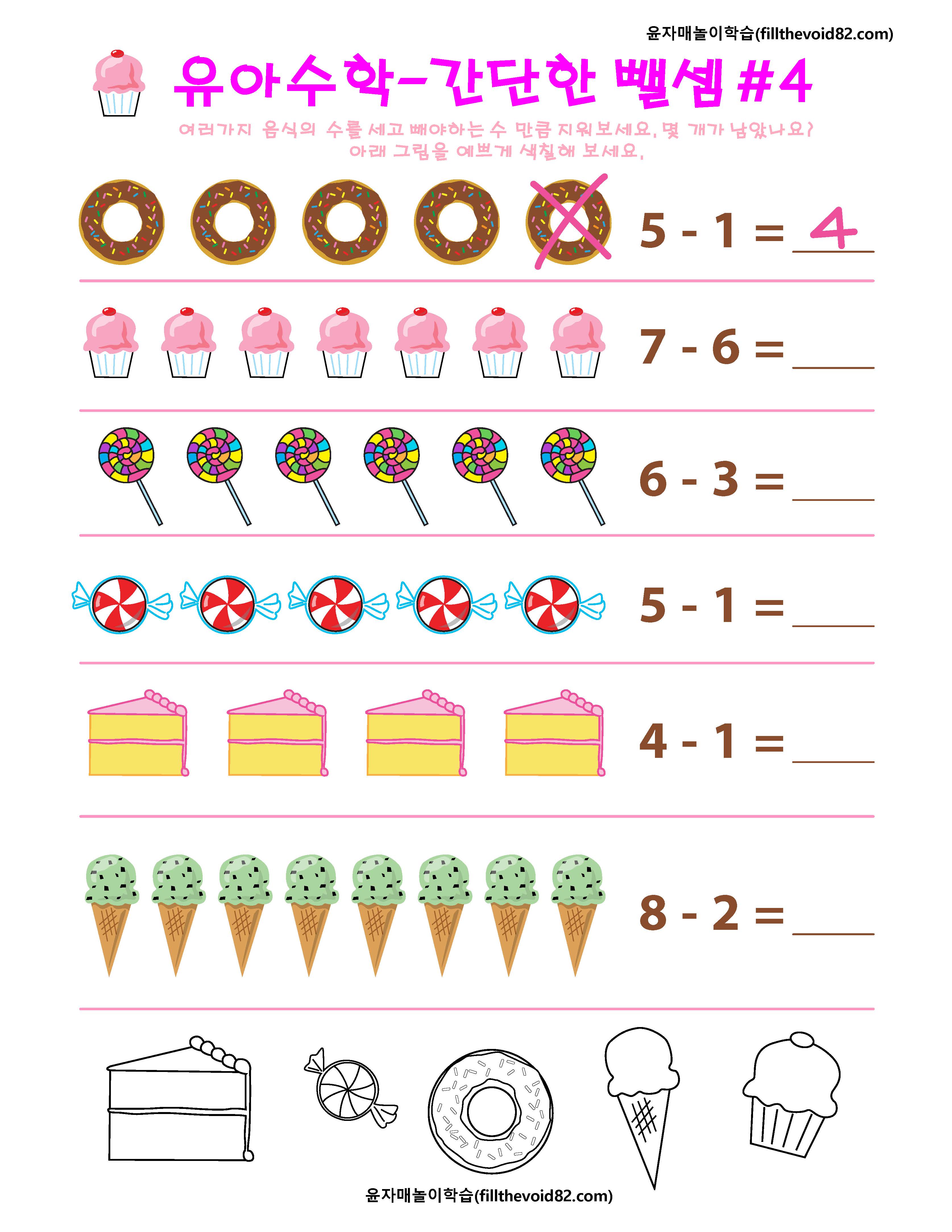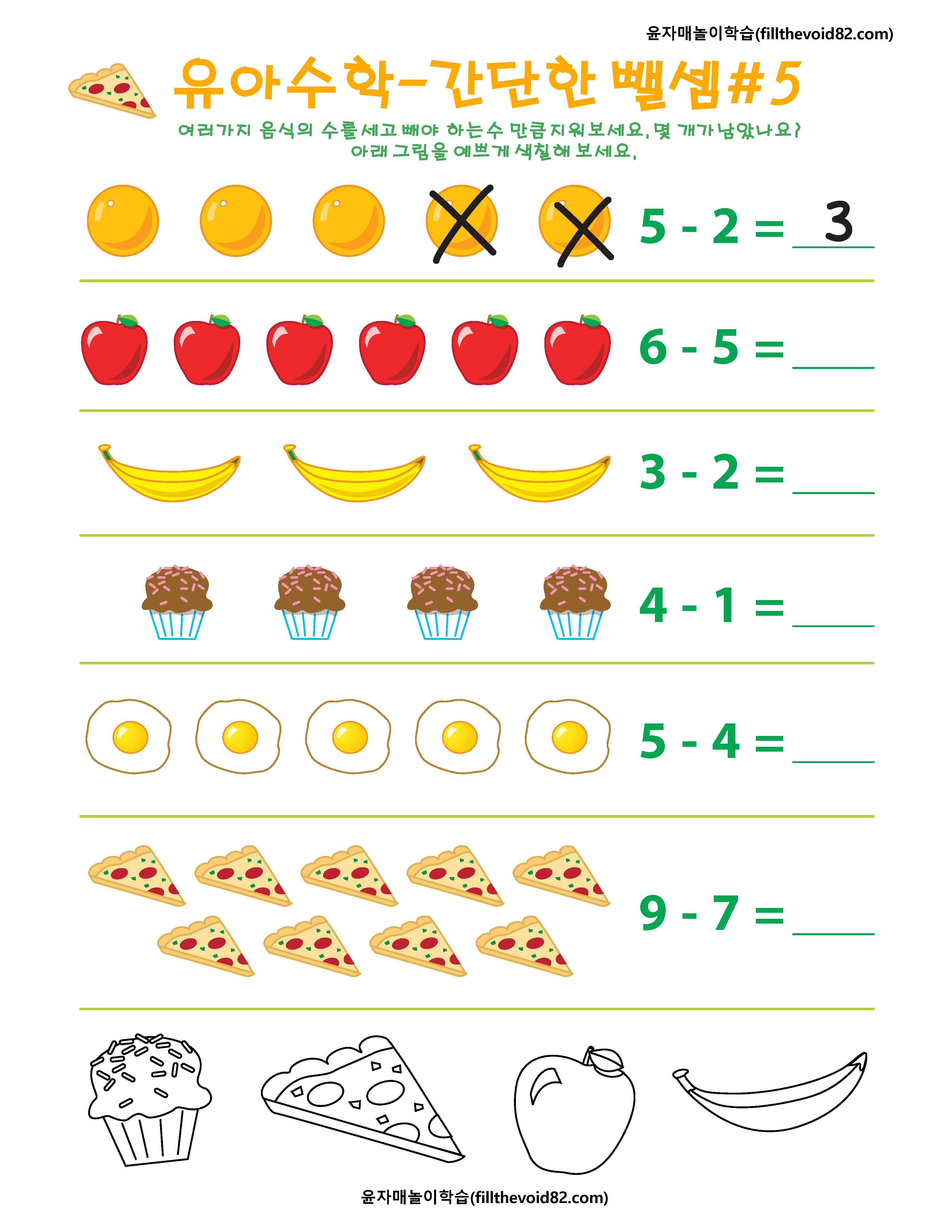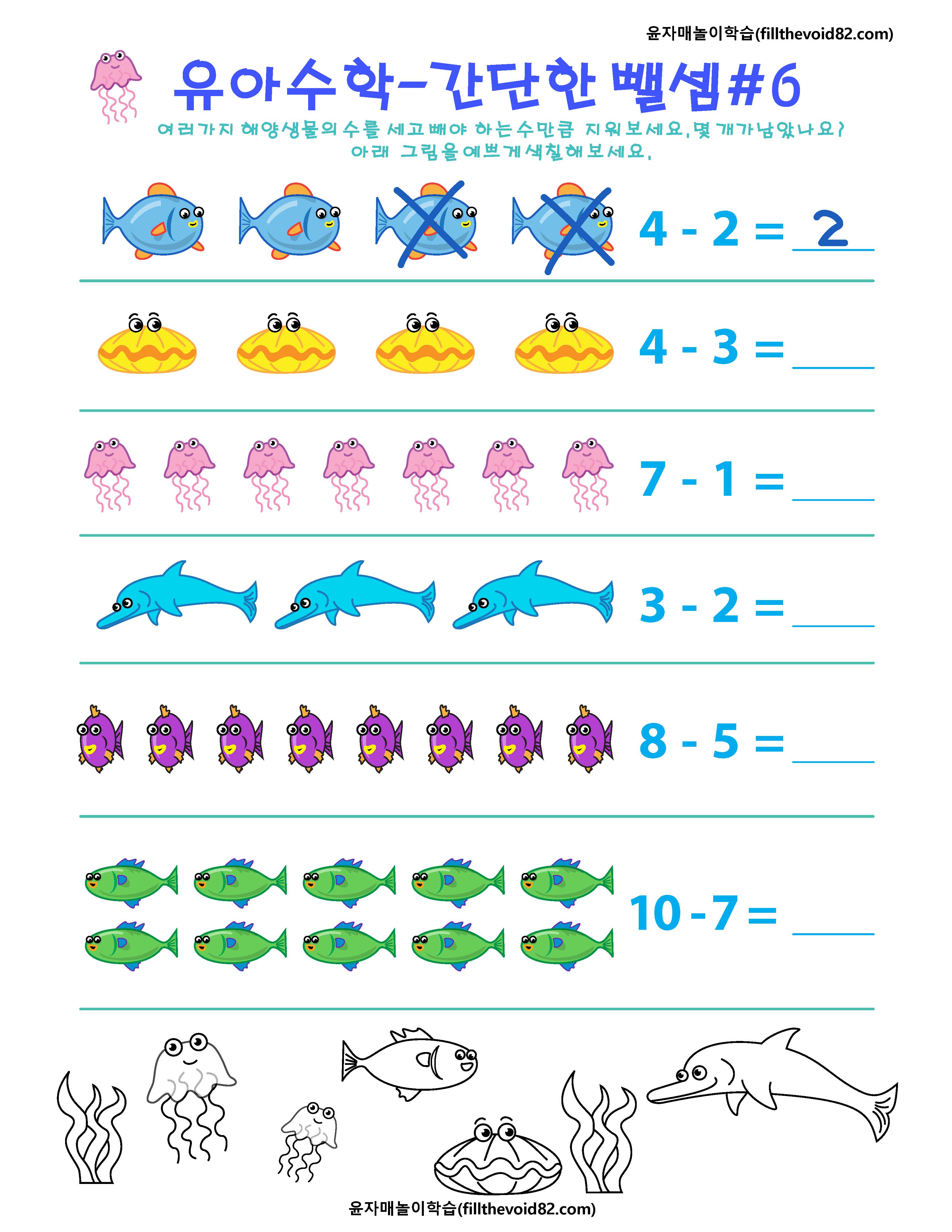 간단한 뺄셈을 그림으로 연습해 볼 수 있는 6개의 워크지입니다.