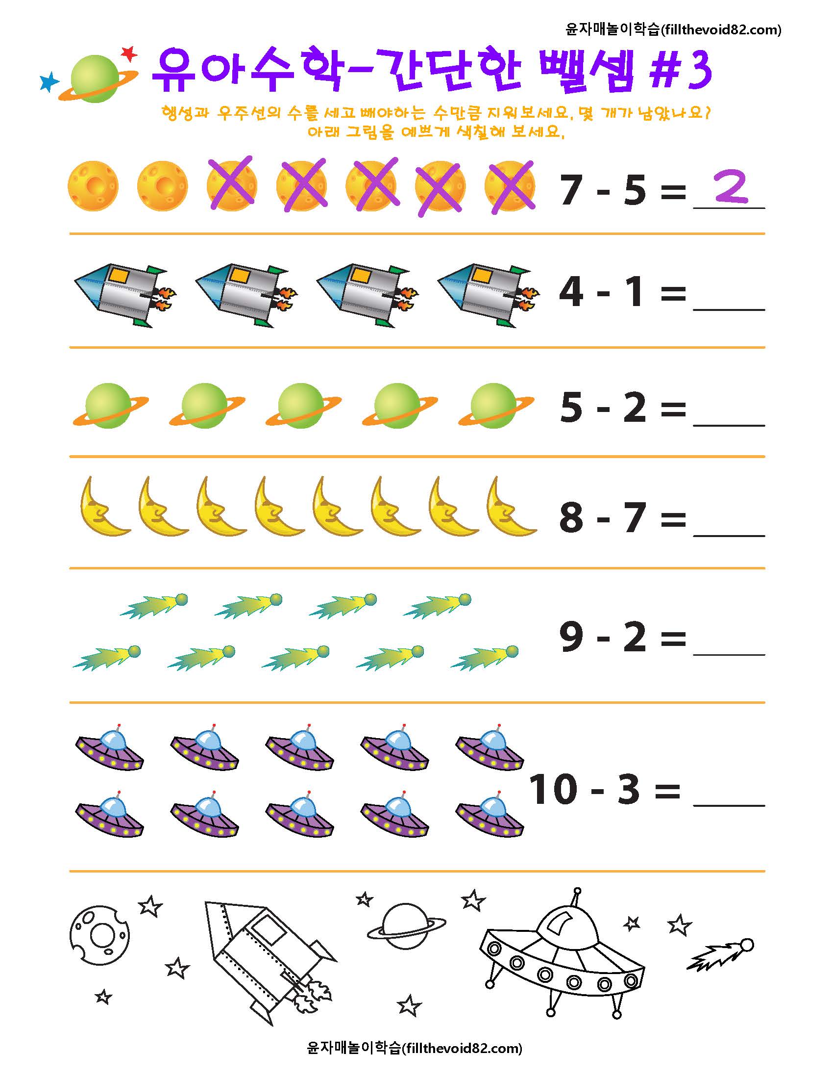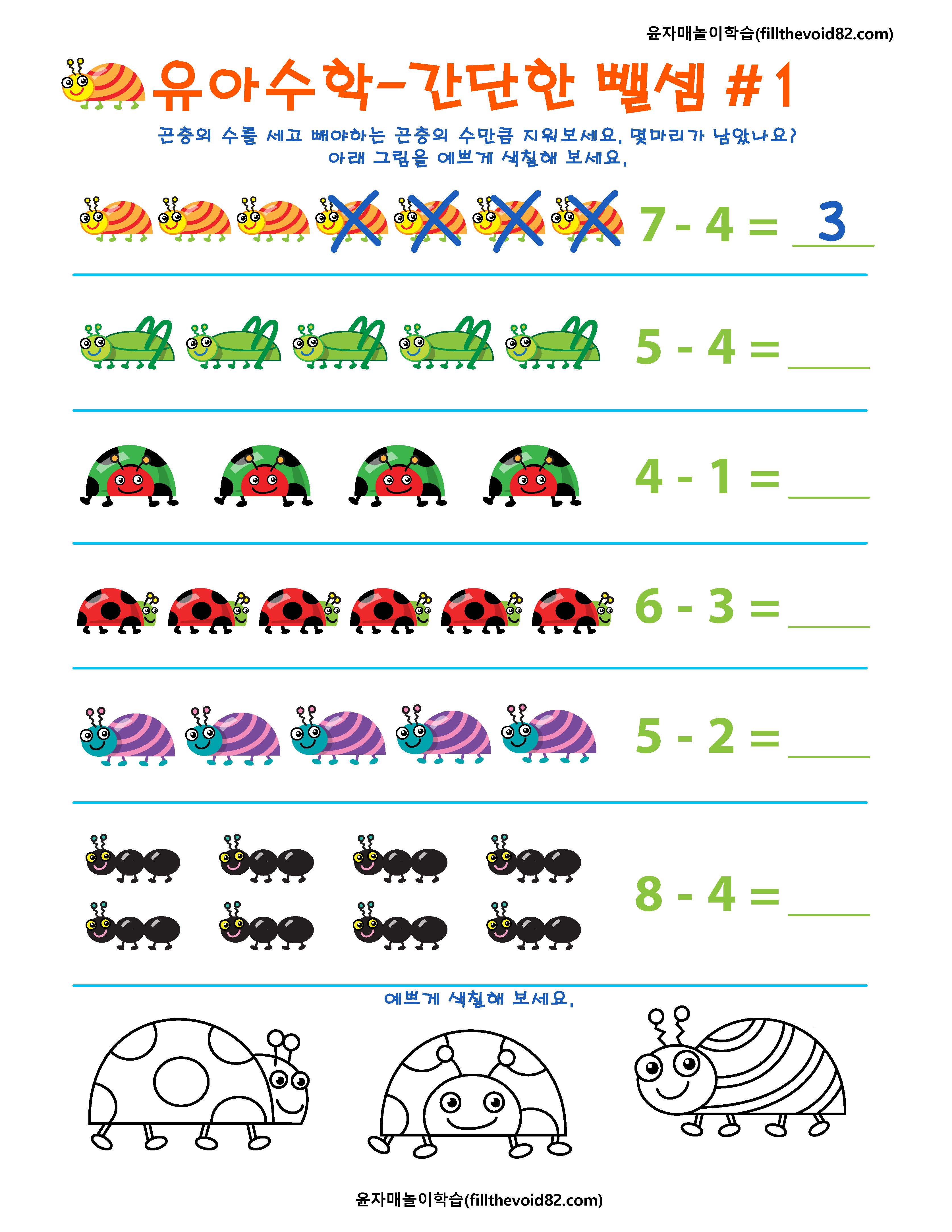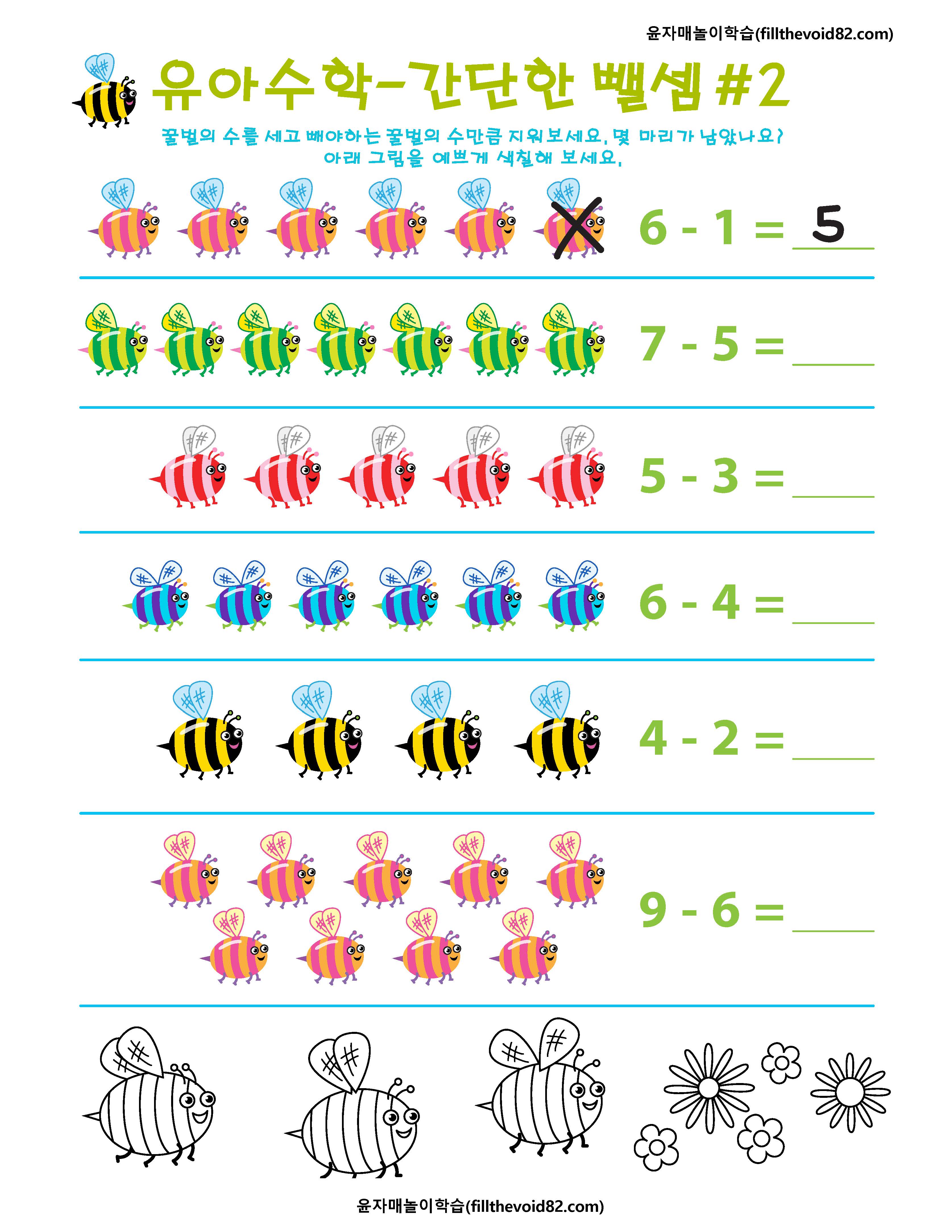 간단한 뺄셈을 그림으로 연습해 볼 수 있는 6개의 워크지입니다.