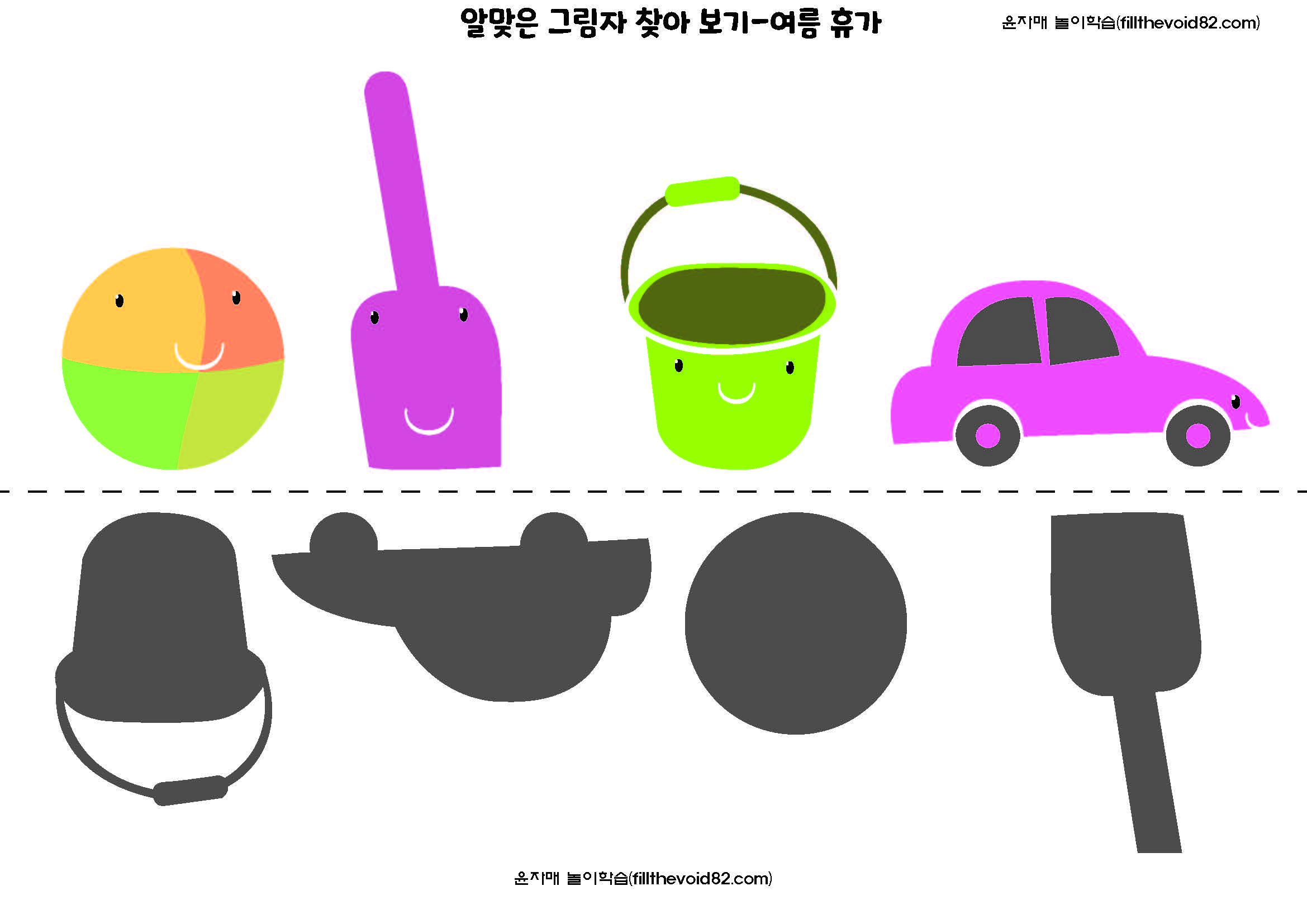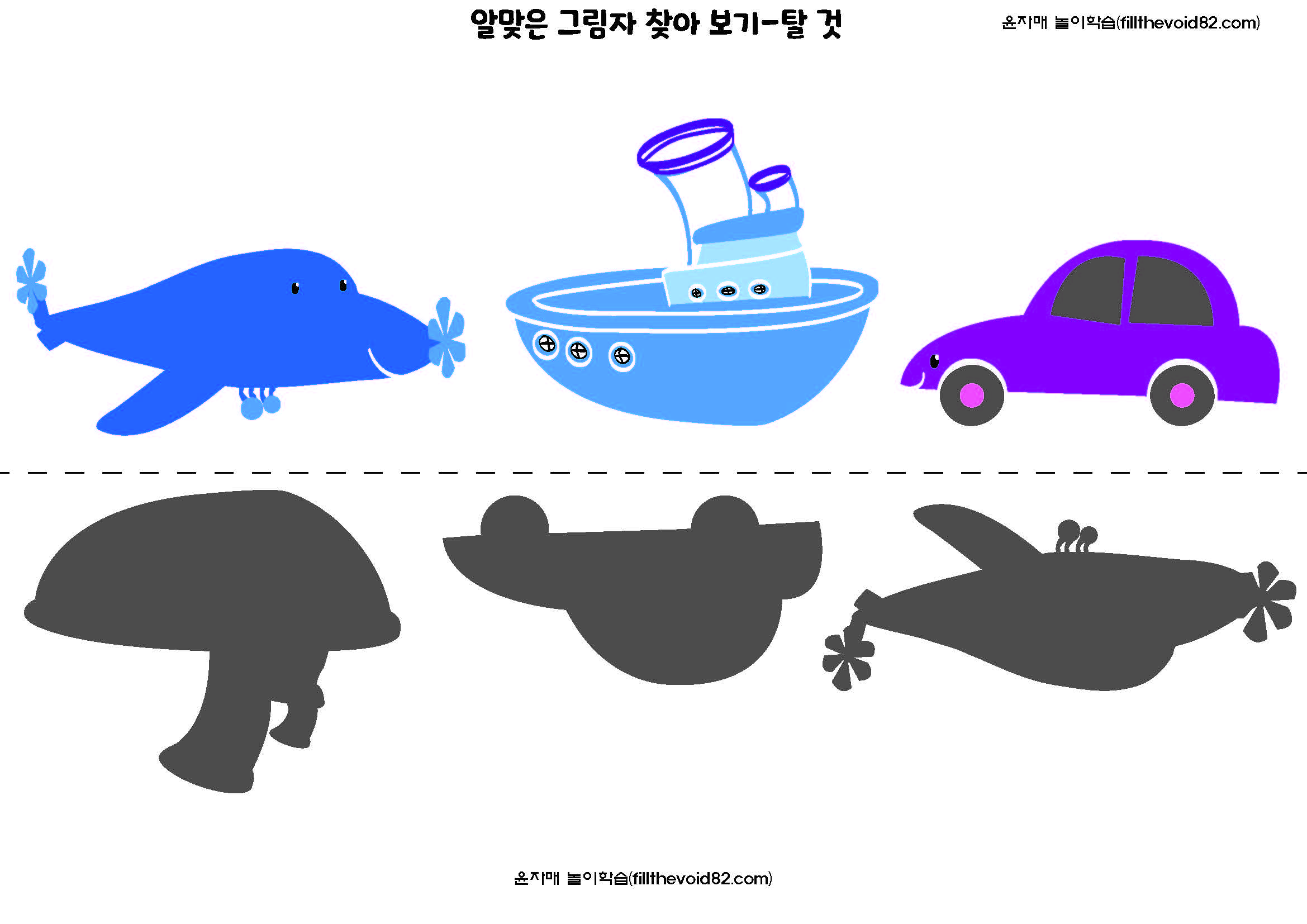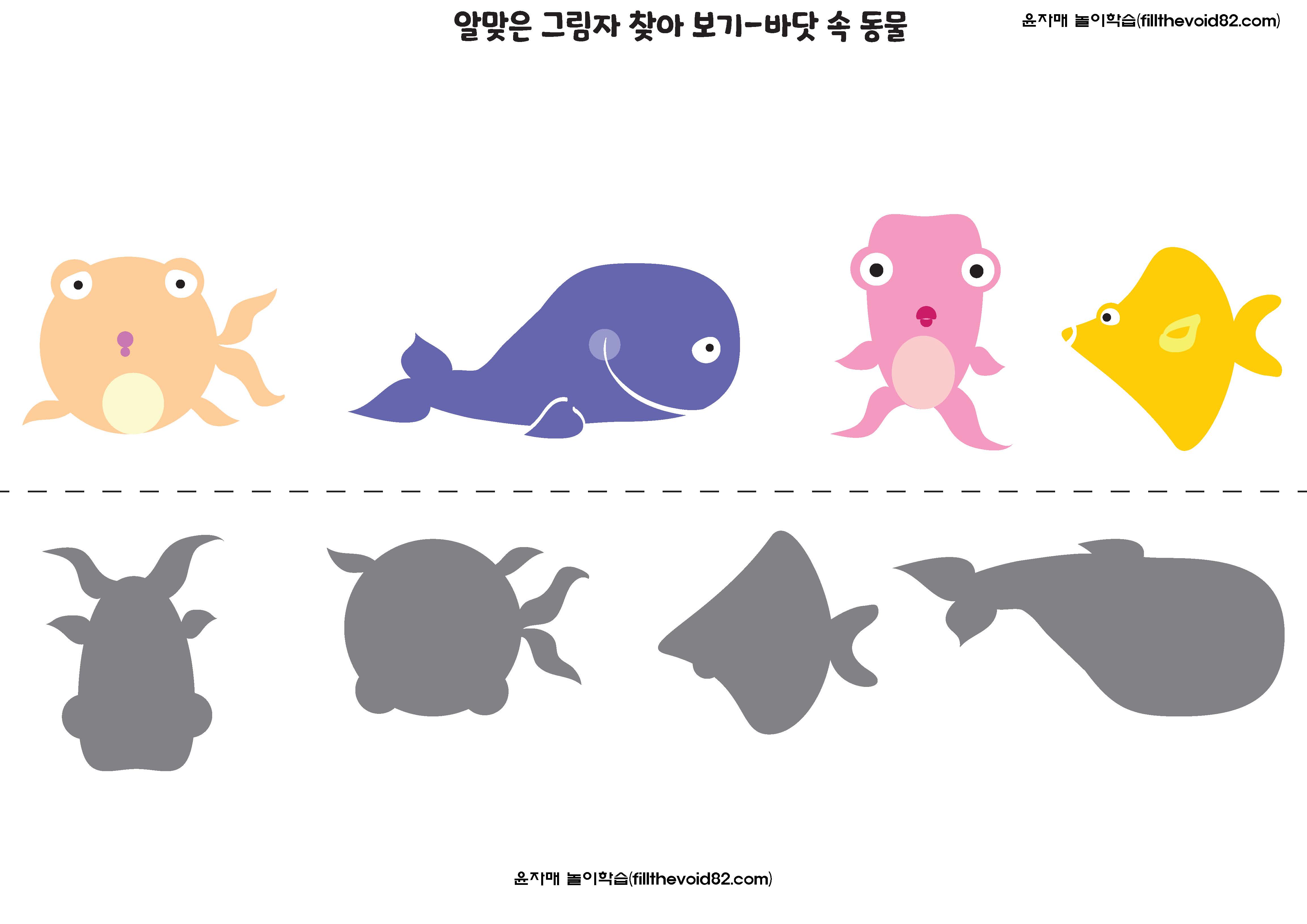 그림자를 보고 같은 모양의 그림을 찾아보는 활동지입니다. 유아들의 시각적 식별능력을 키워줄 수 있습니다.