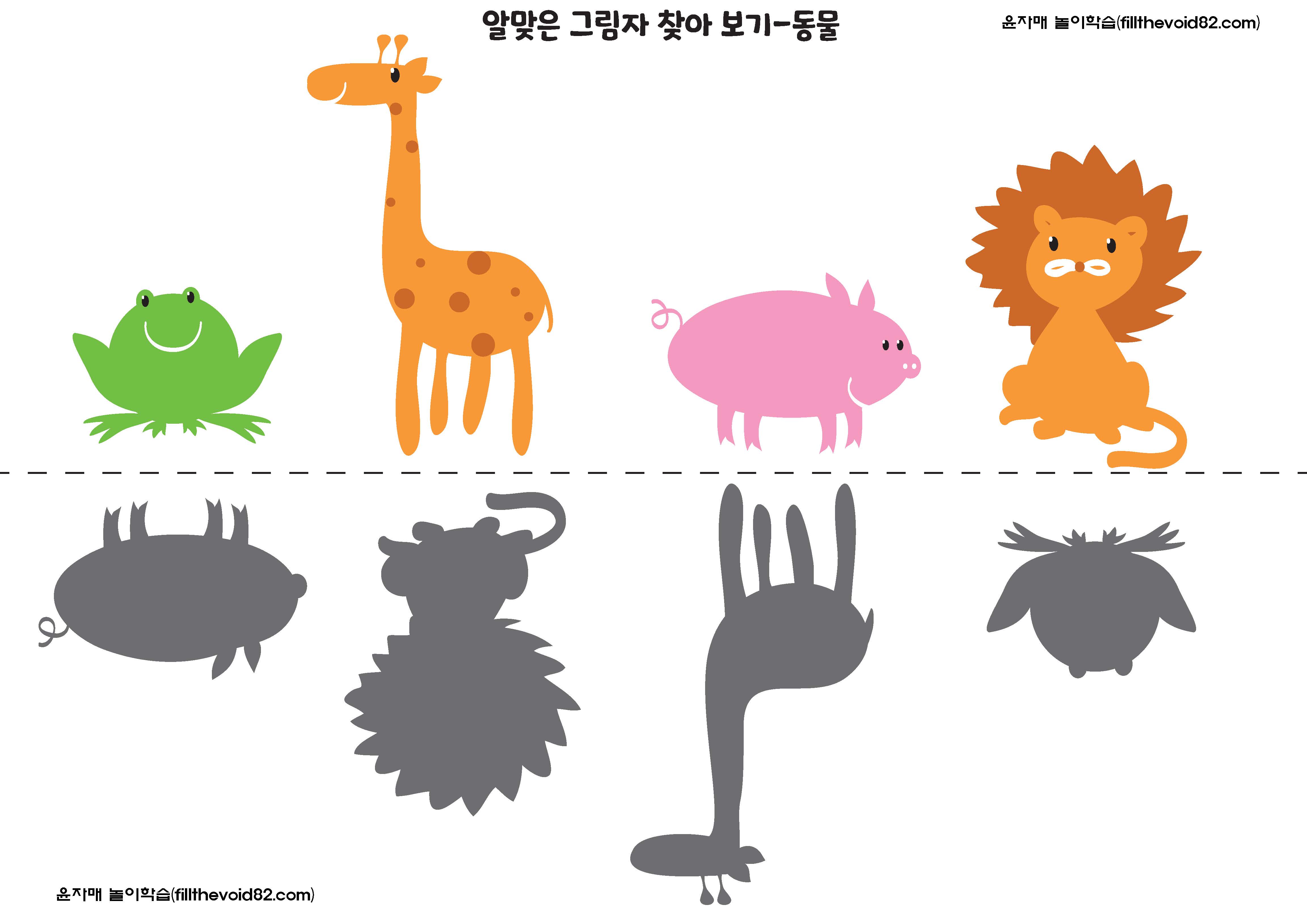 그림자를 보고 같은 모양의 그림을 찾아보는 활동지입니다. 유아들의 시각적 식별능력을 키워줄 수 있습니다.