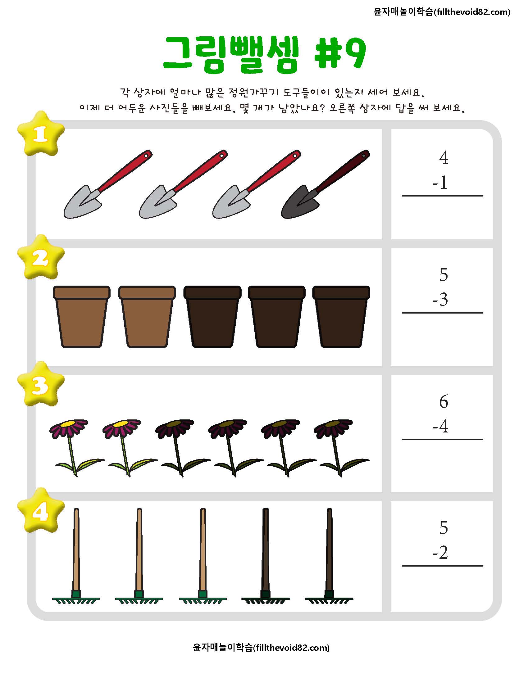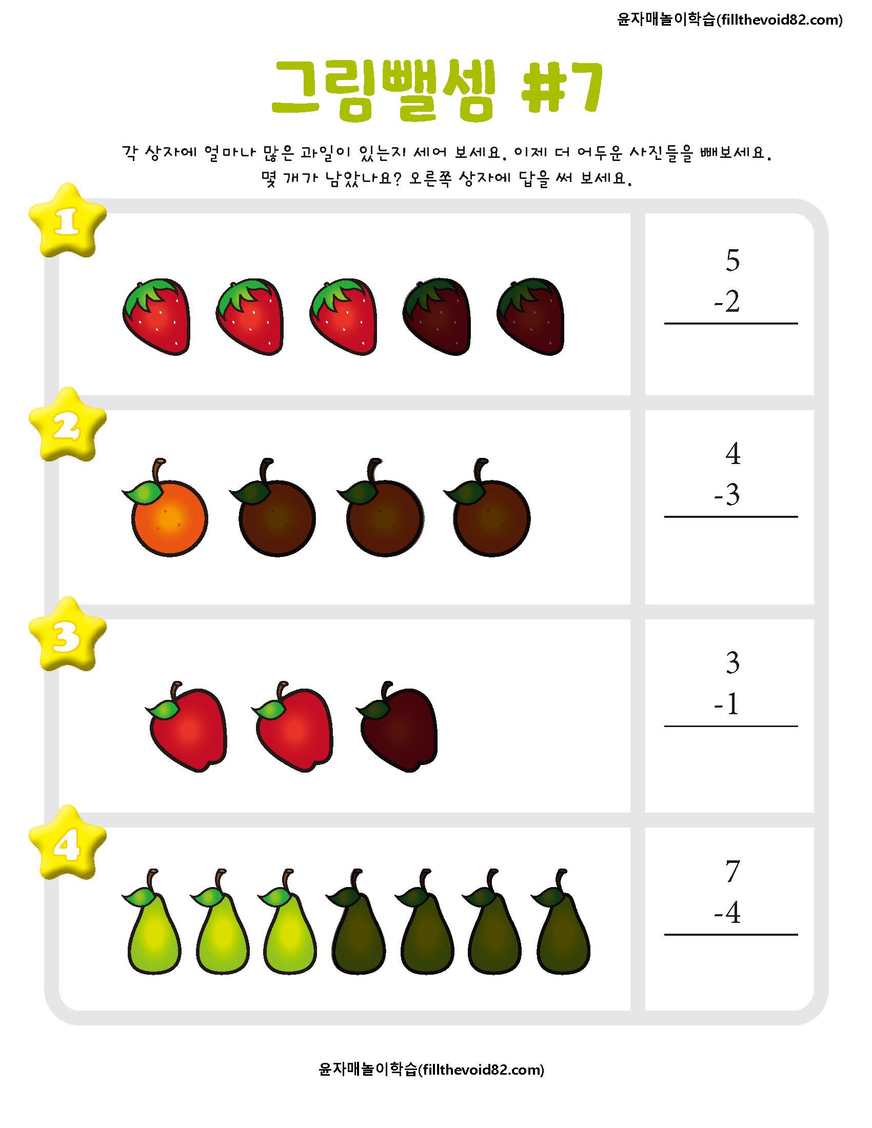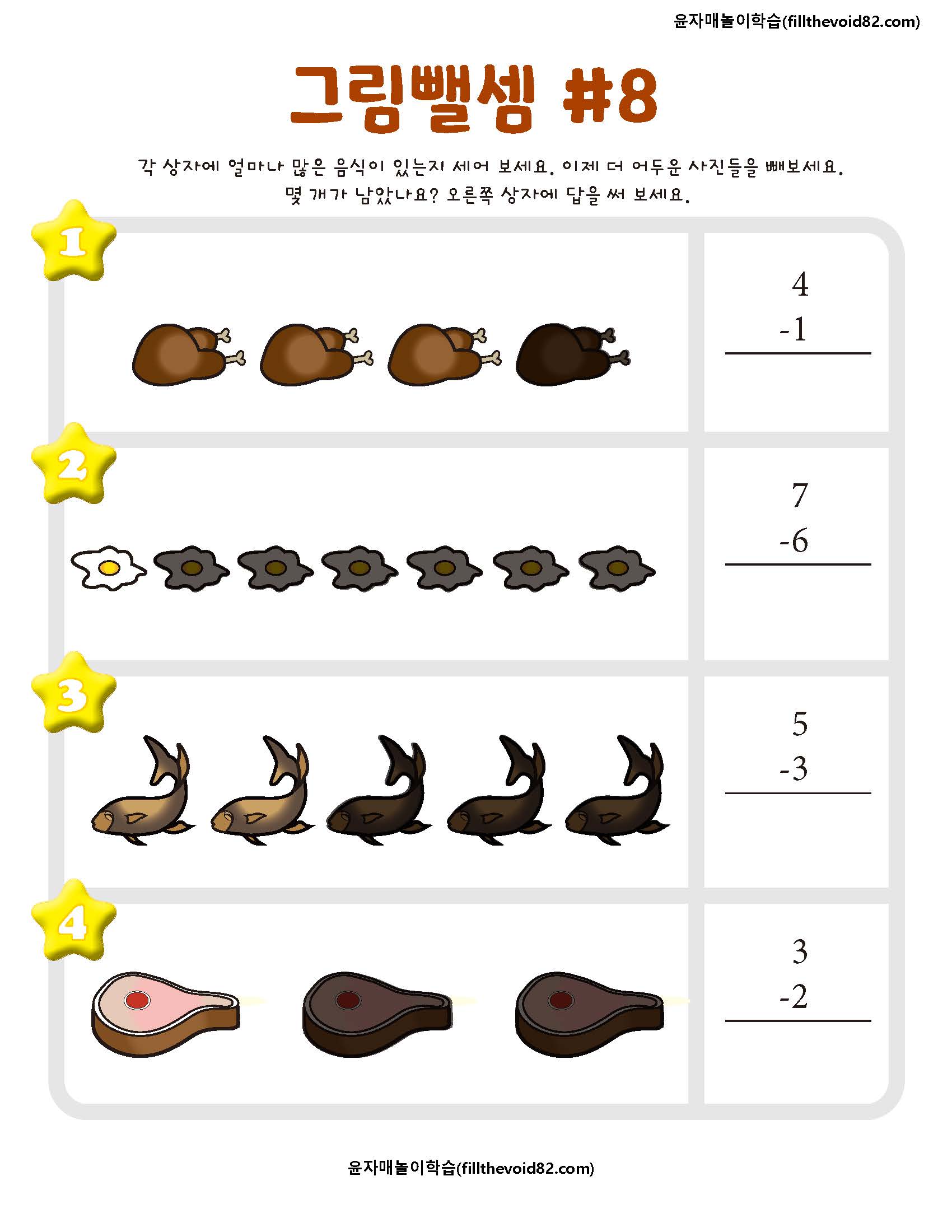 한 자리 수 뺄셈을 그림으로 학습할 수 있는 활동지입니다.