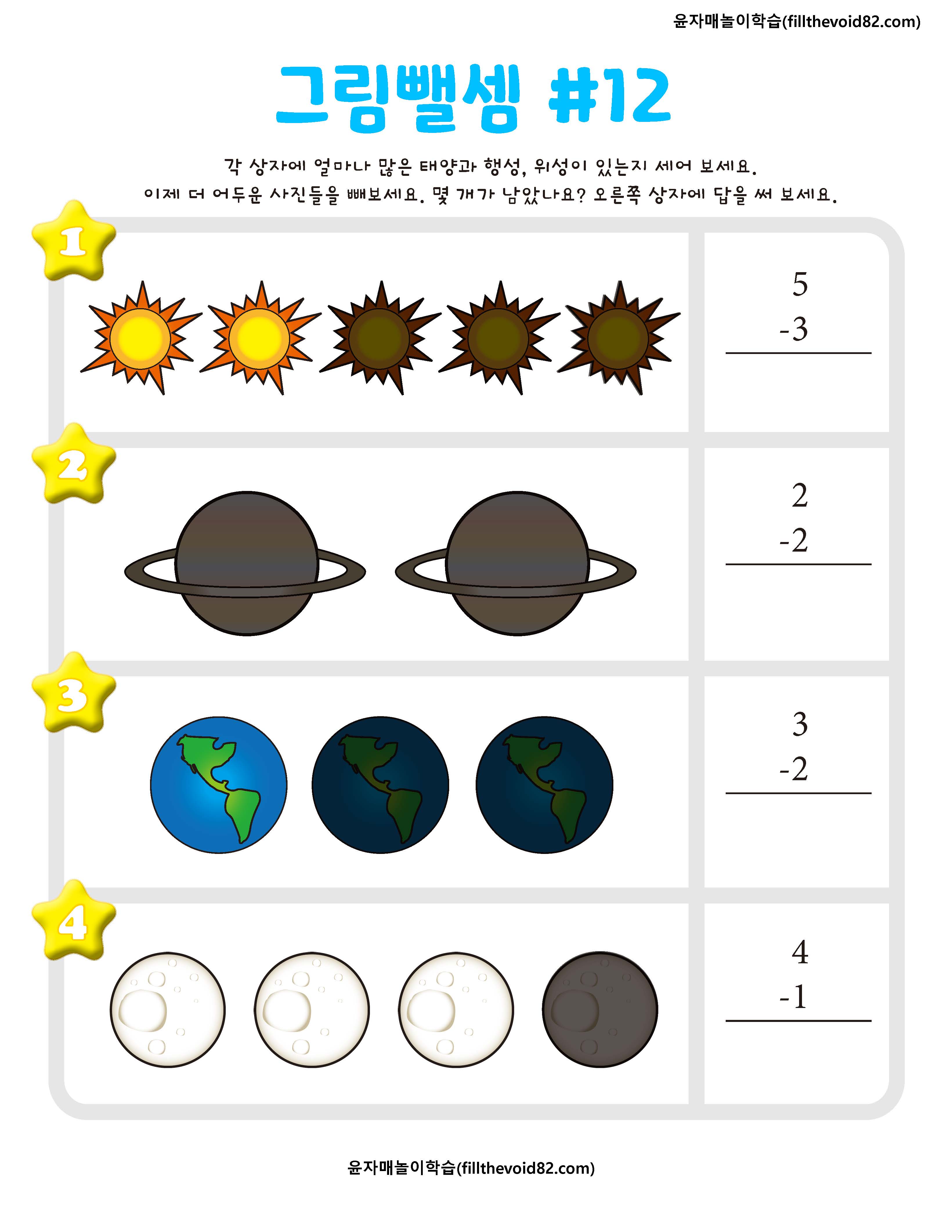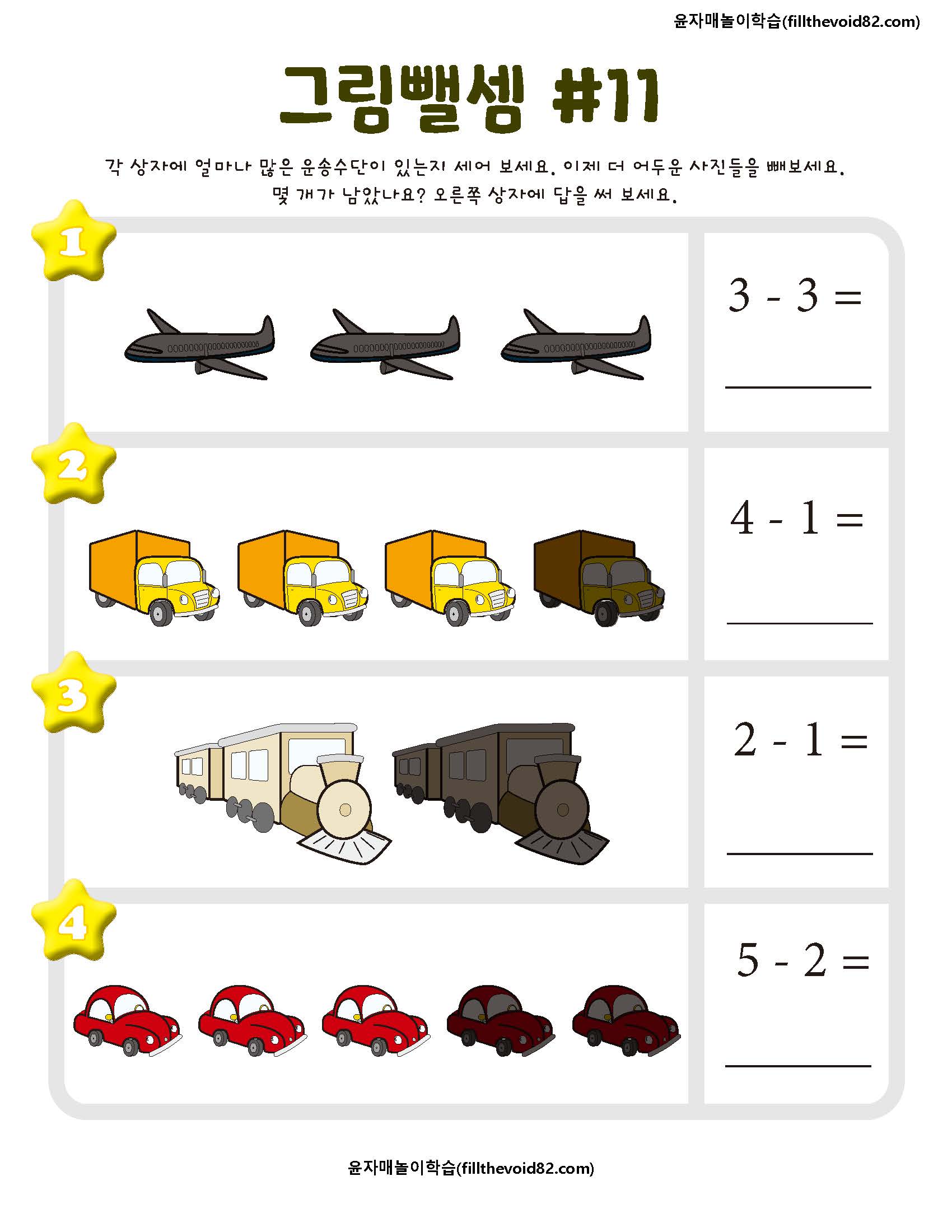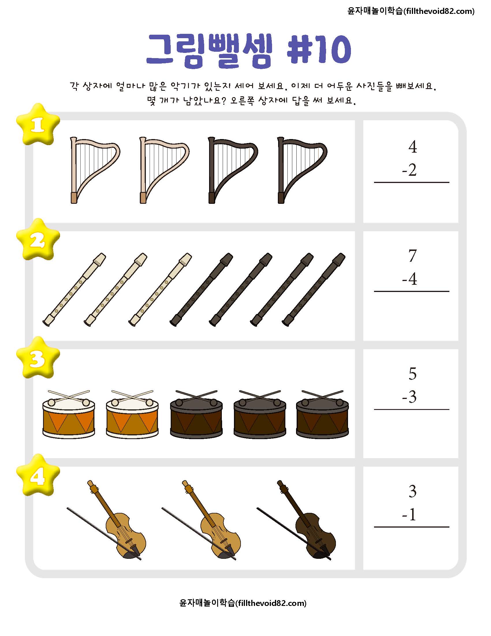 한 자리 수 뺄셈을 그림으로 학습할 수 있는 활동지입니다.