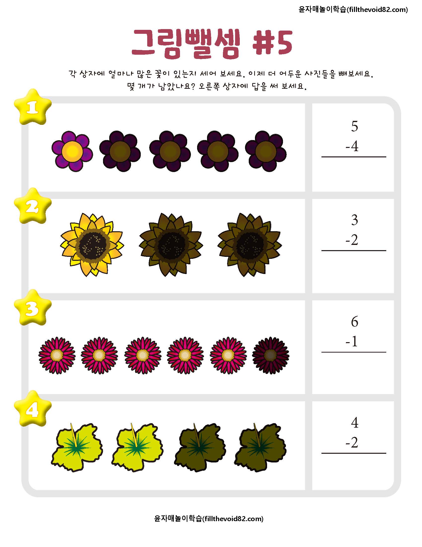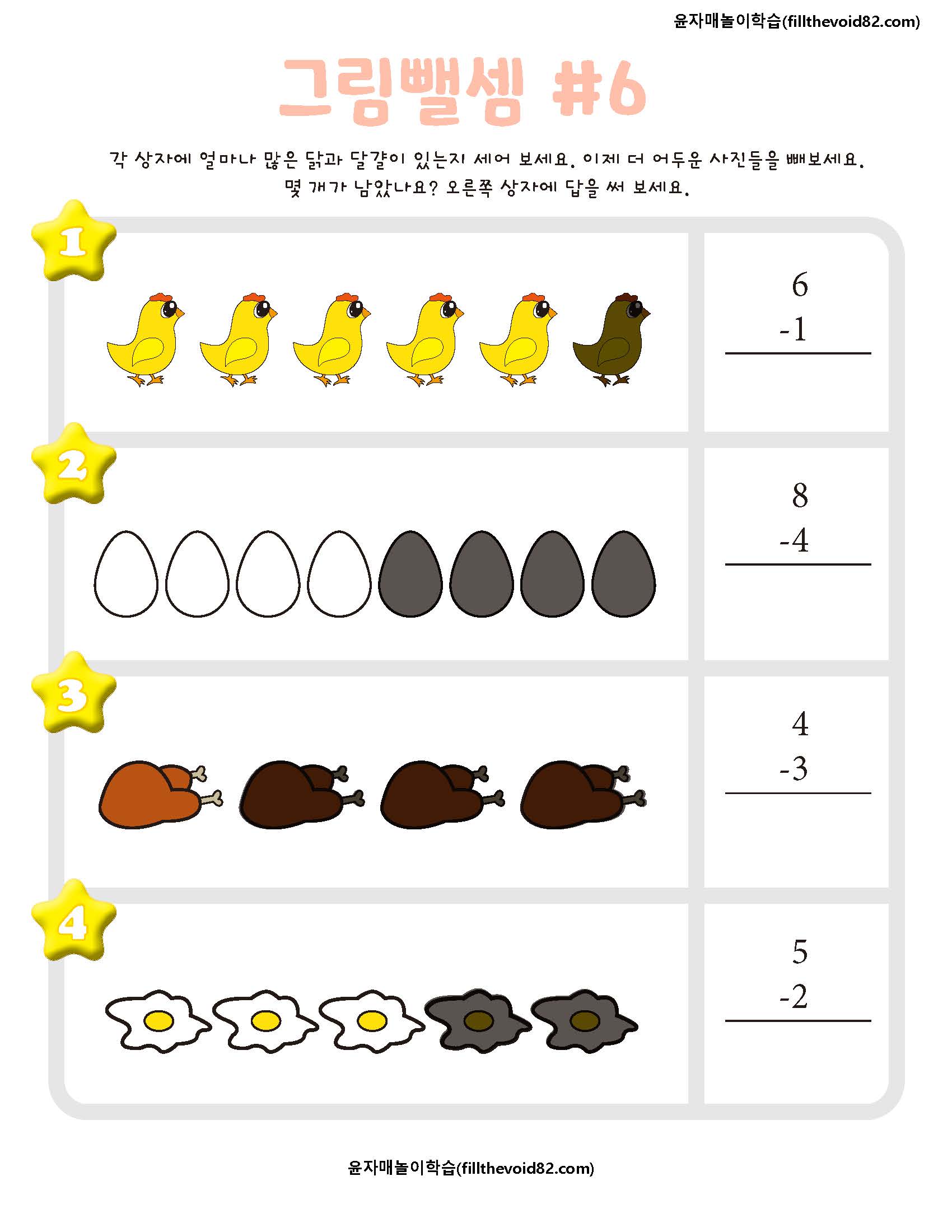 한 자리 수 뺄셈을 그림으로 학습할 수 있는 활동지입니다.