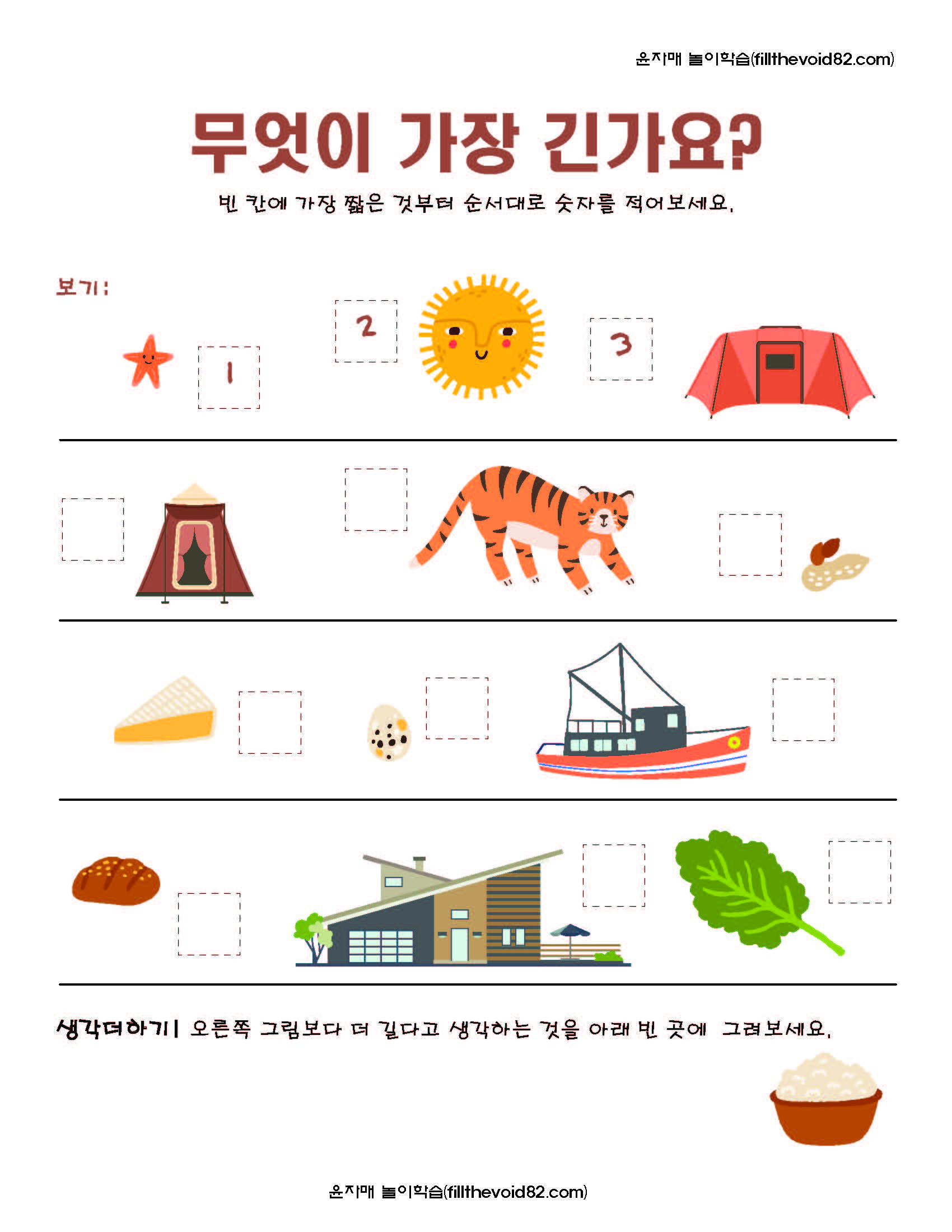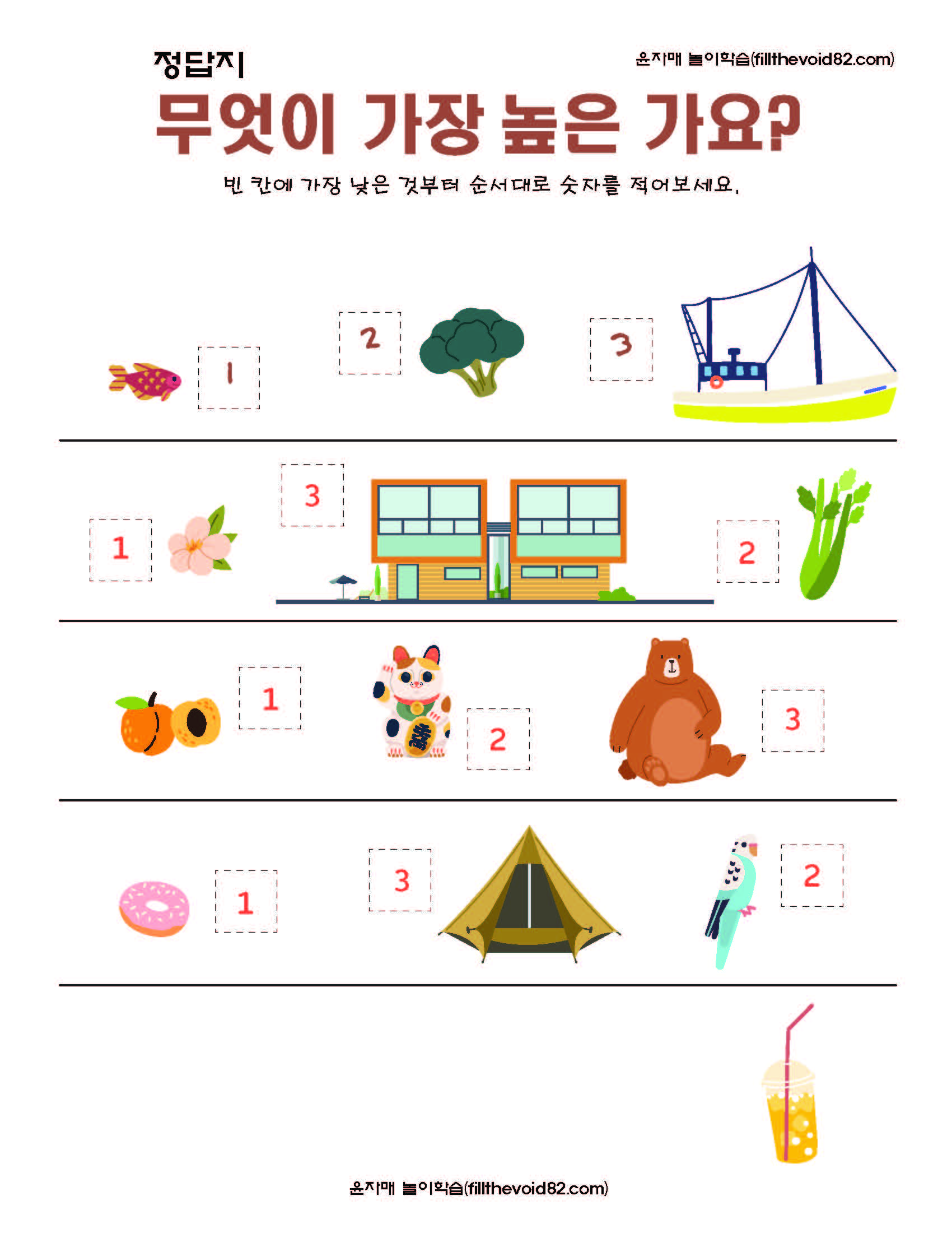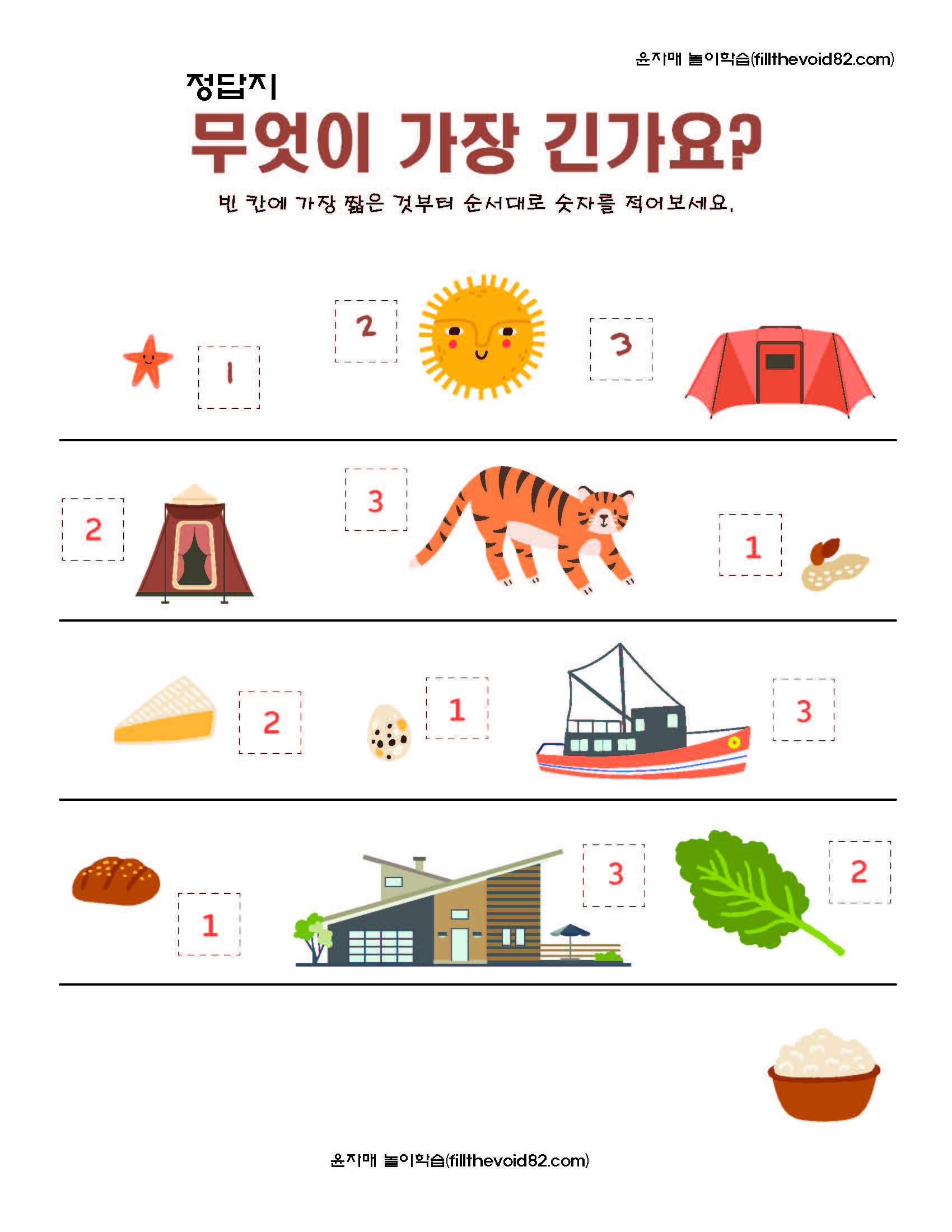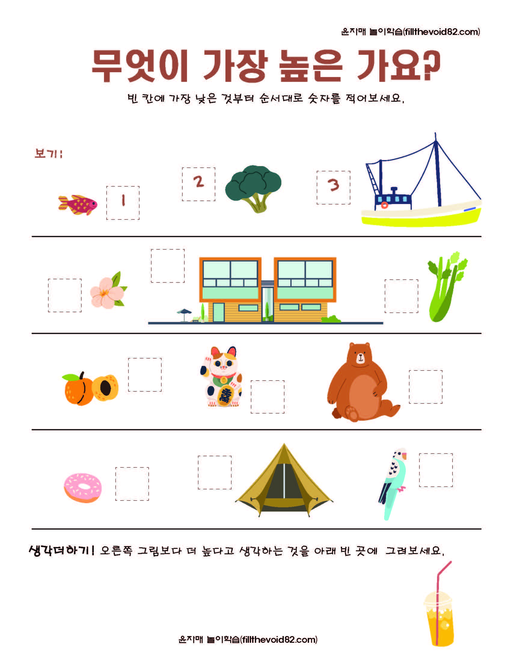 길이와 무게 높이를 비교해보는 유아수학 워크지 입니다.