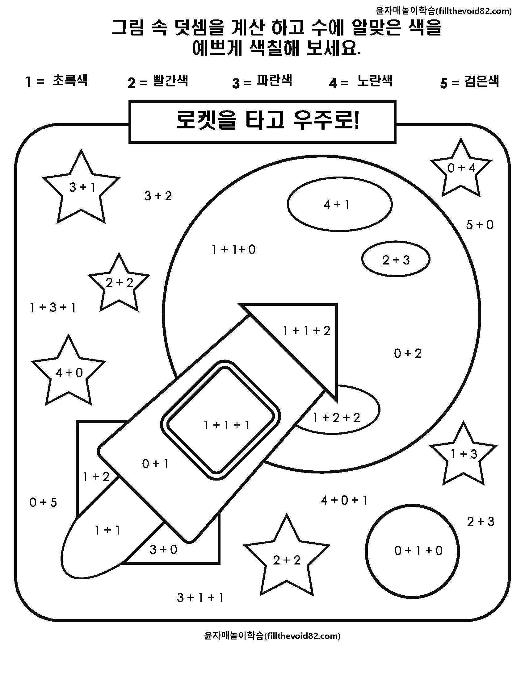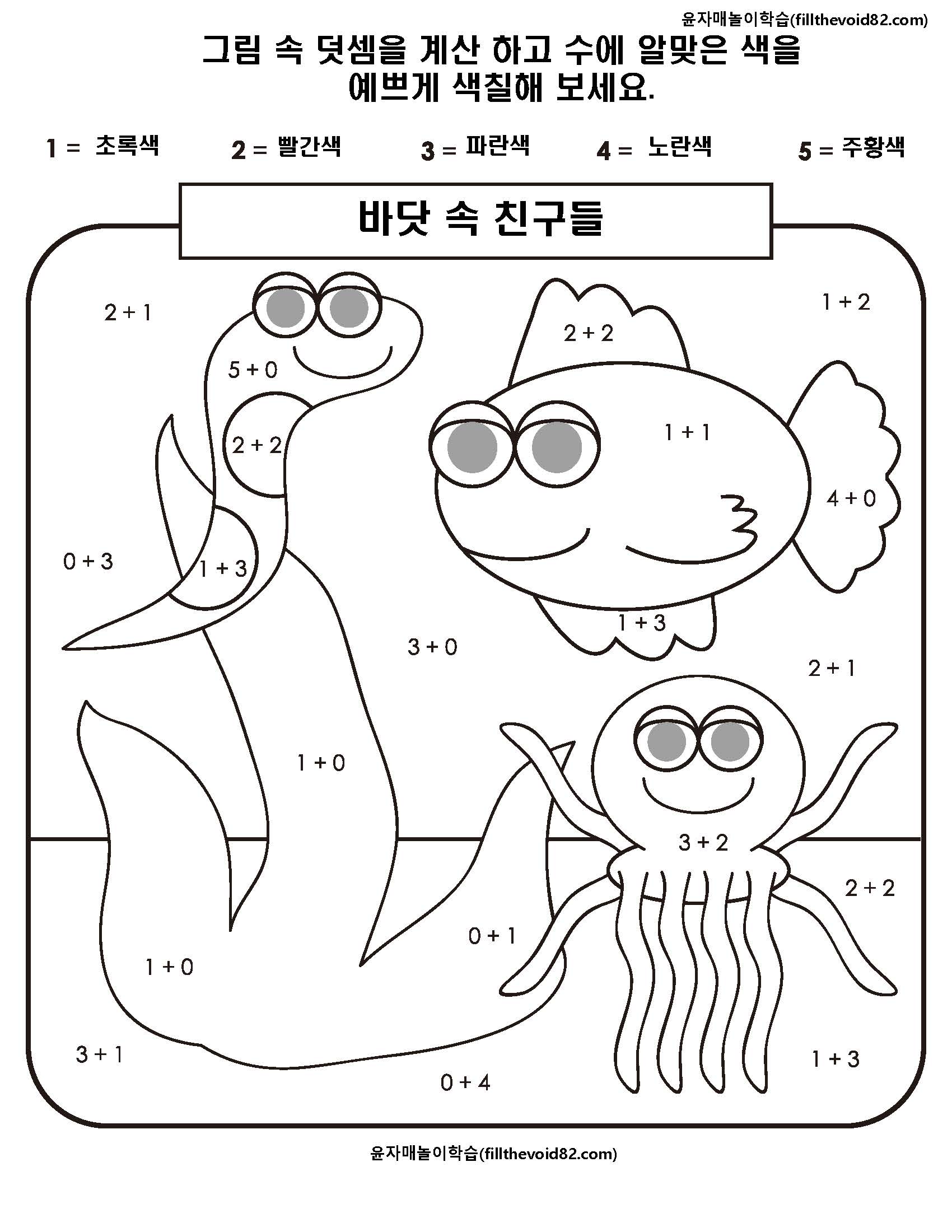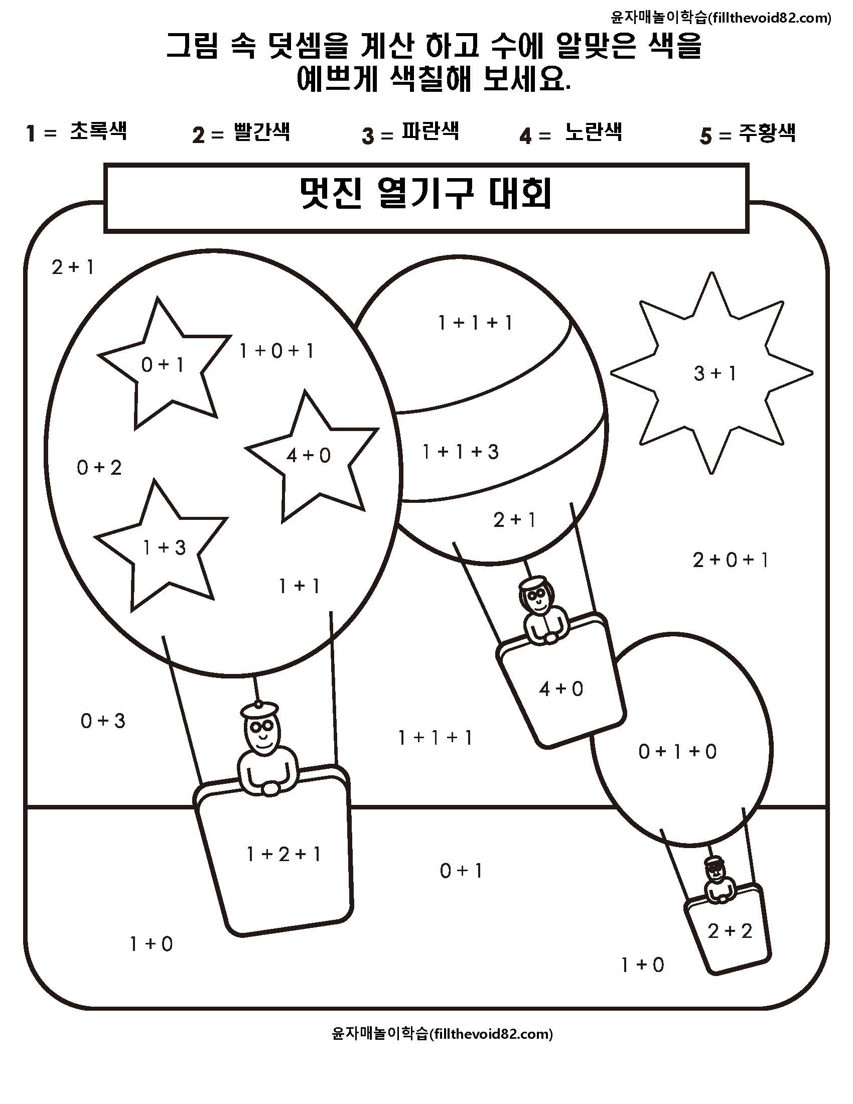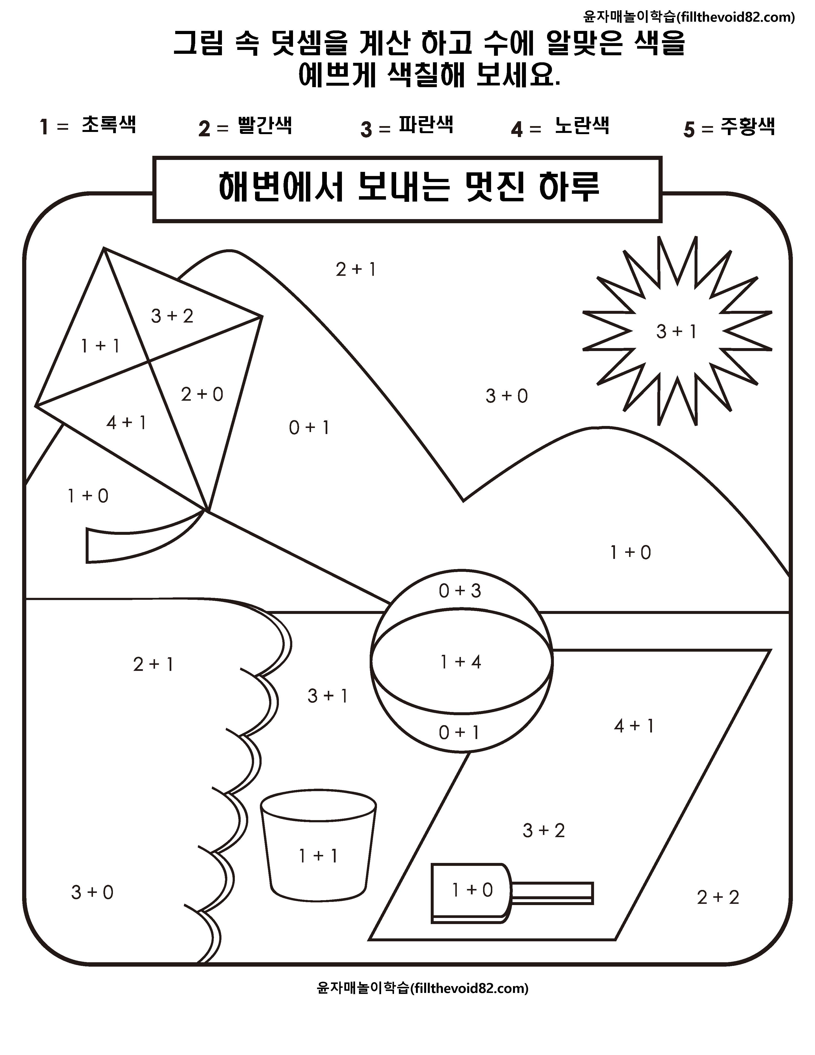 간단한 덧셈을 하고 수에 맞는 색깔로 색칠하는 활동지입니다.