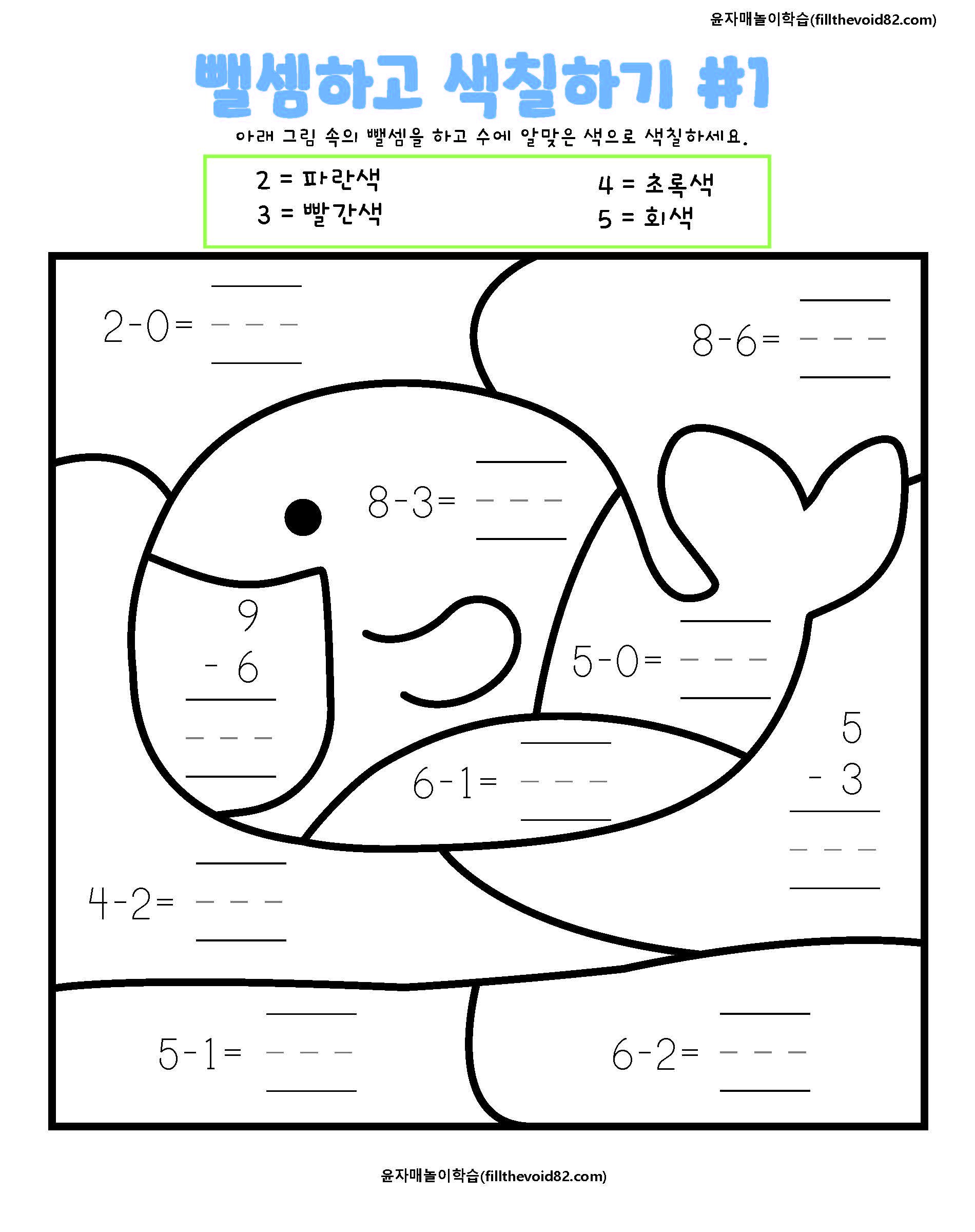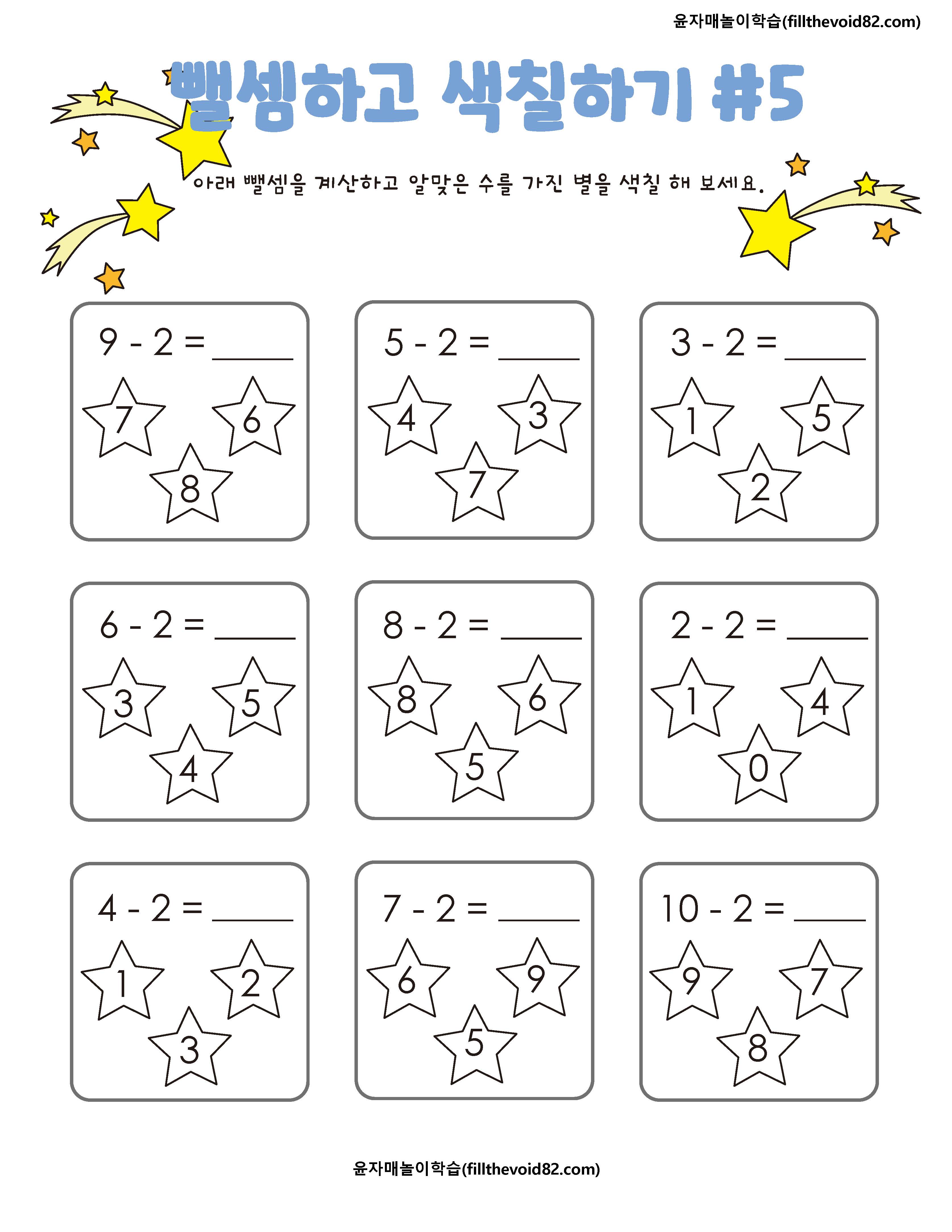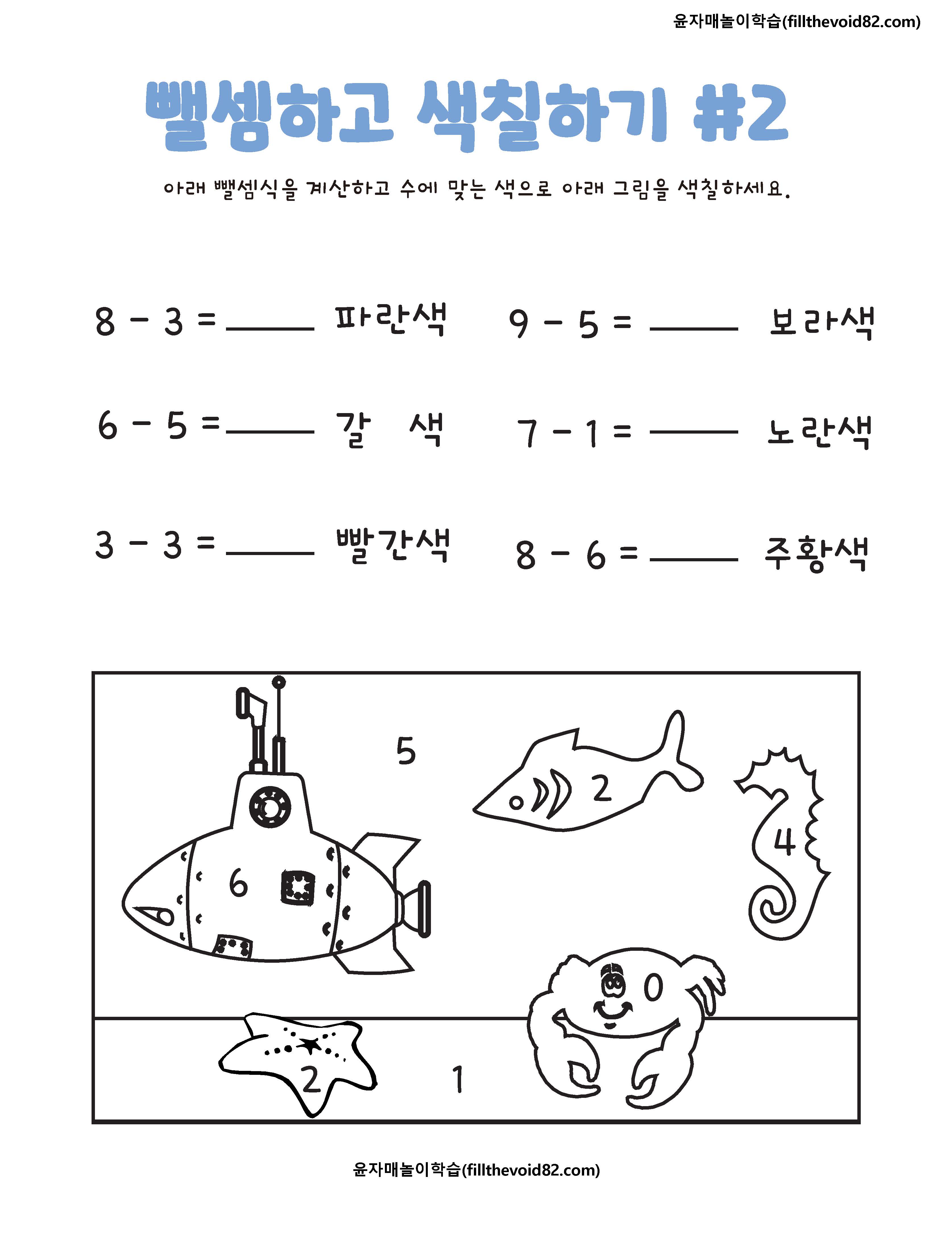 한자리 수 뺄셈을 하고 수에 맞는 색으로 그림을 색칠해 보는 활동지입니다.
