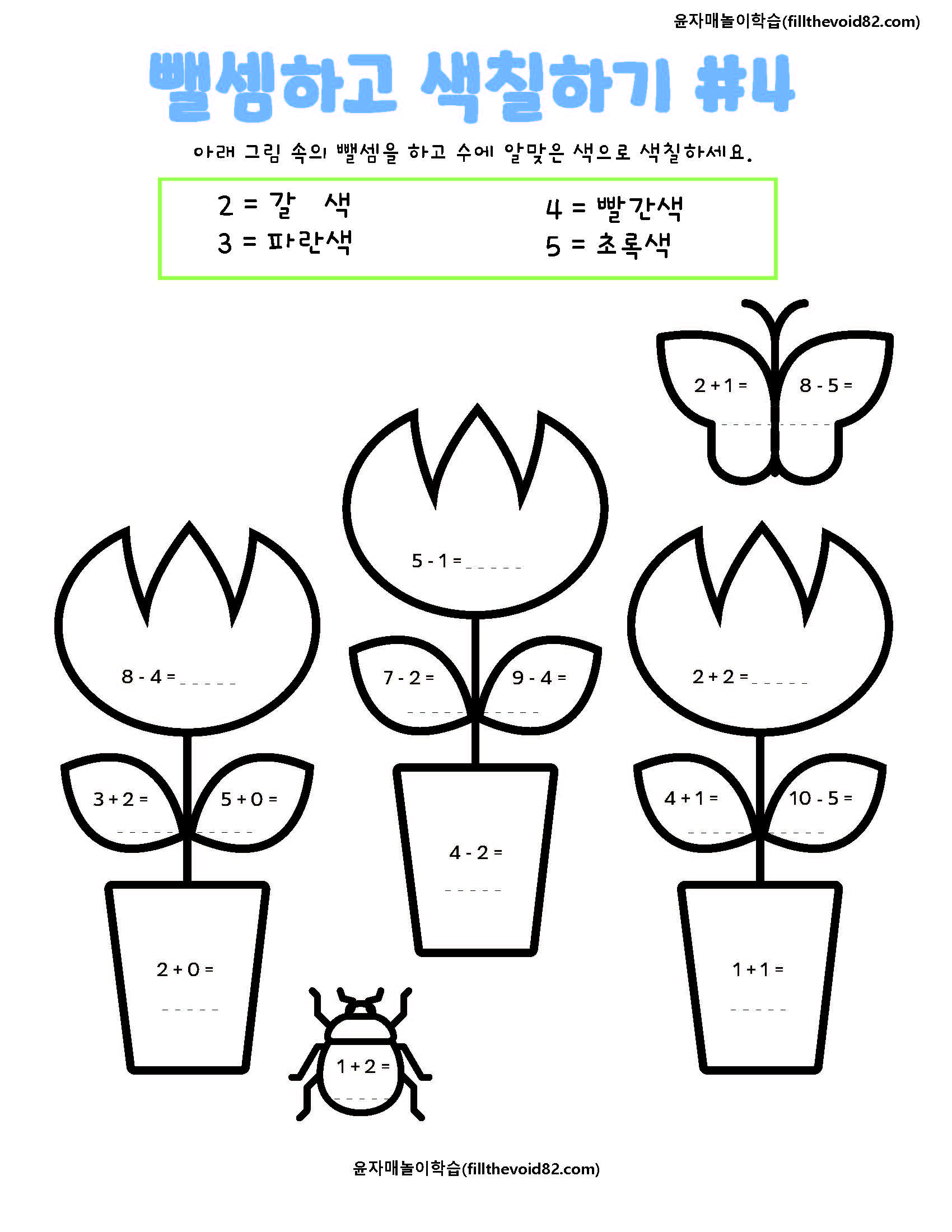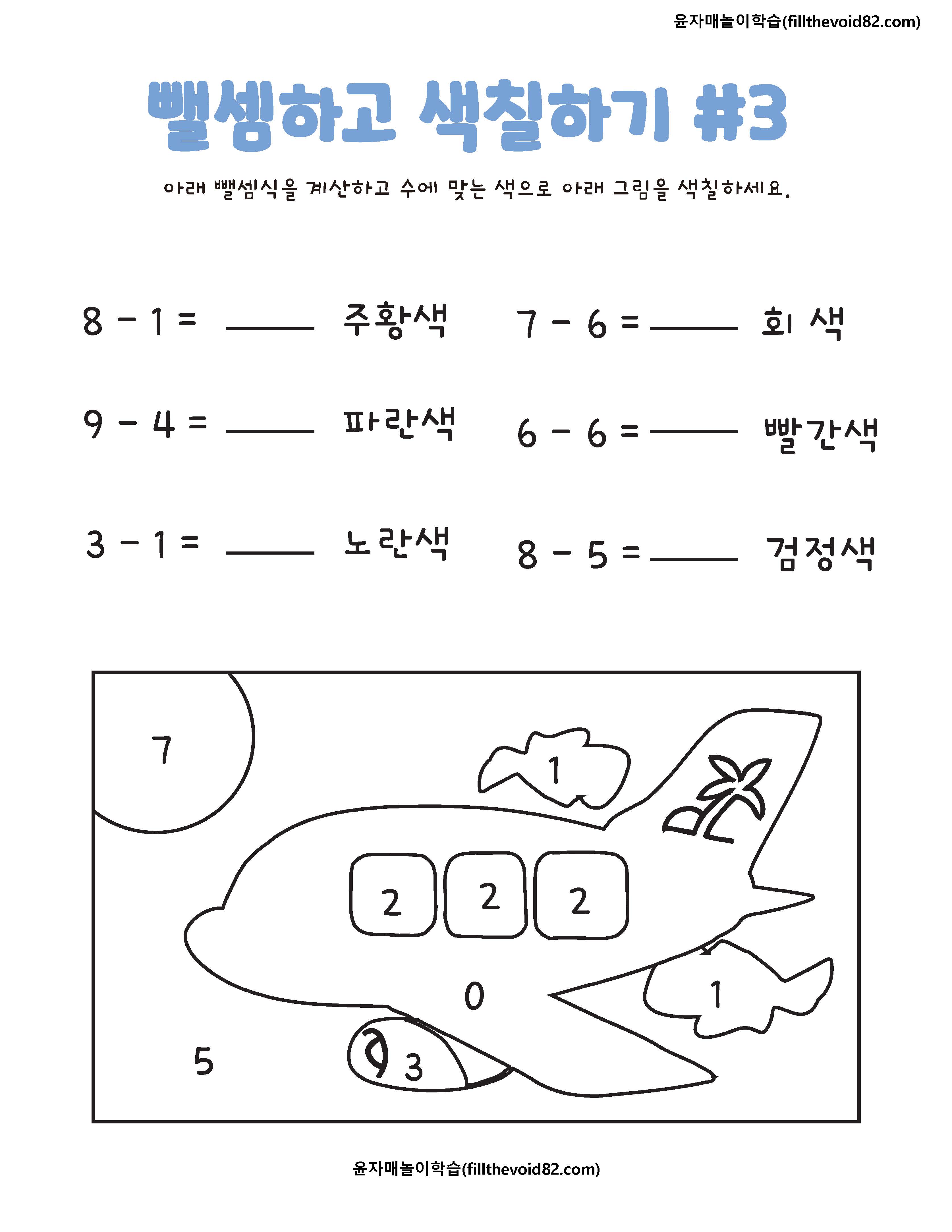 한자리 수 뺄셈을 하고 수에 맞는 색으로 그림을 색칠해 보는 활동지입니다.