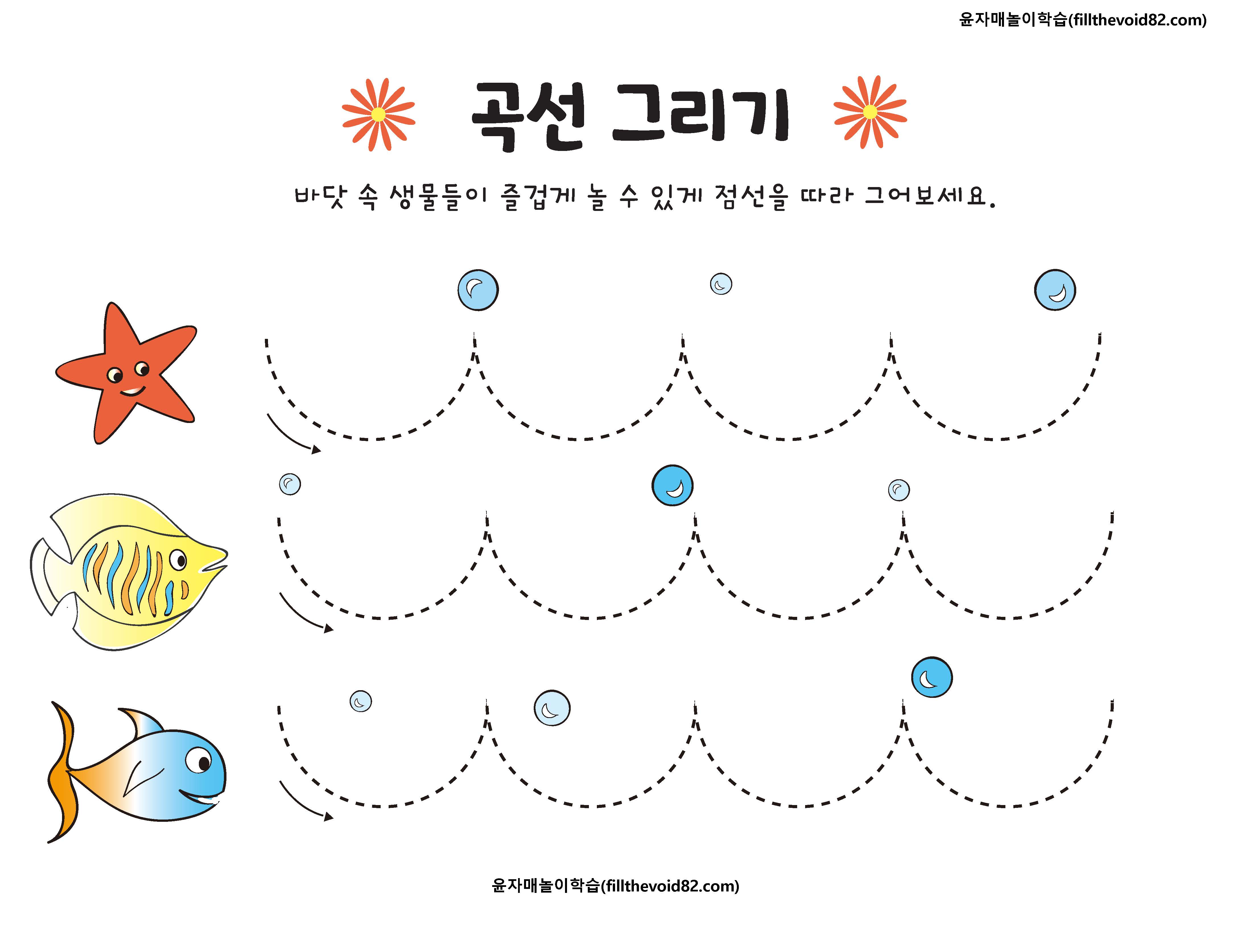 유아들의 손 힘을 기를 수 있는 선 따라 그리기 활동지입니다.(곡선)