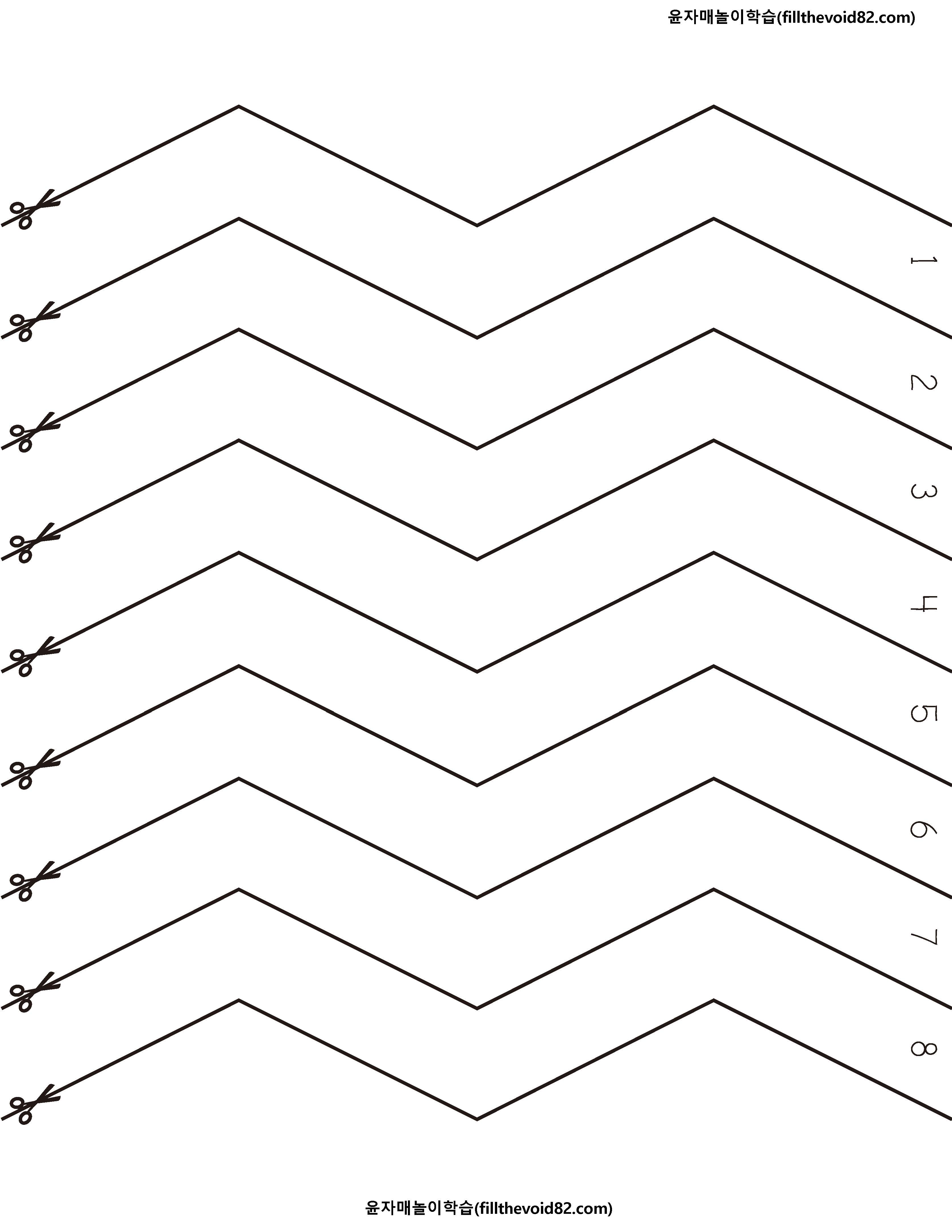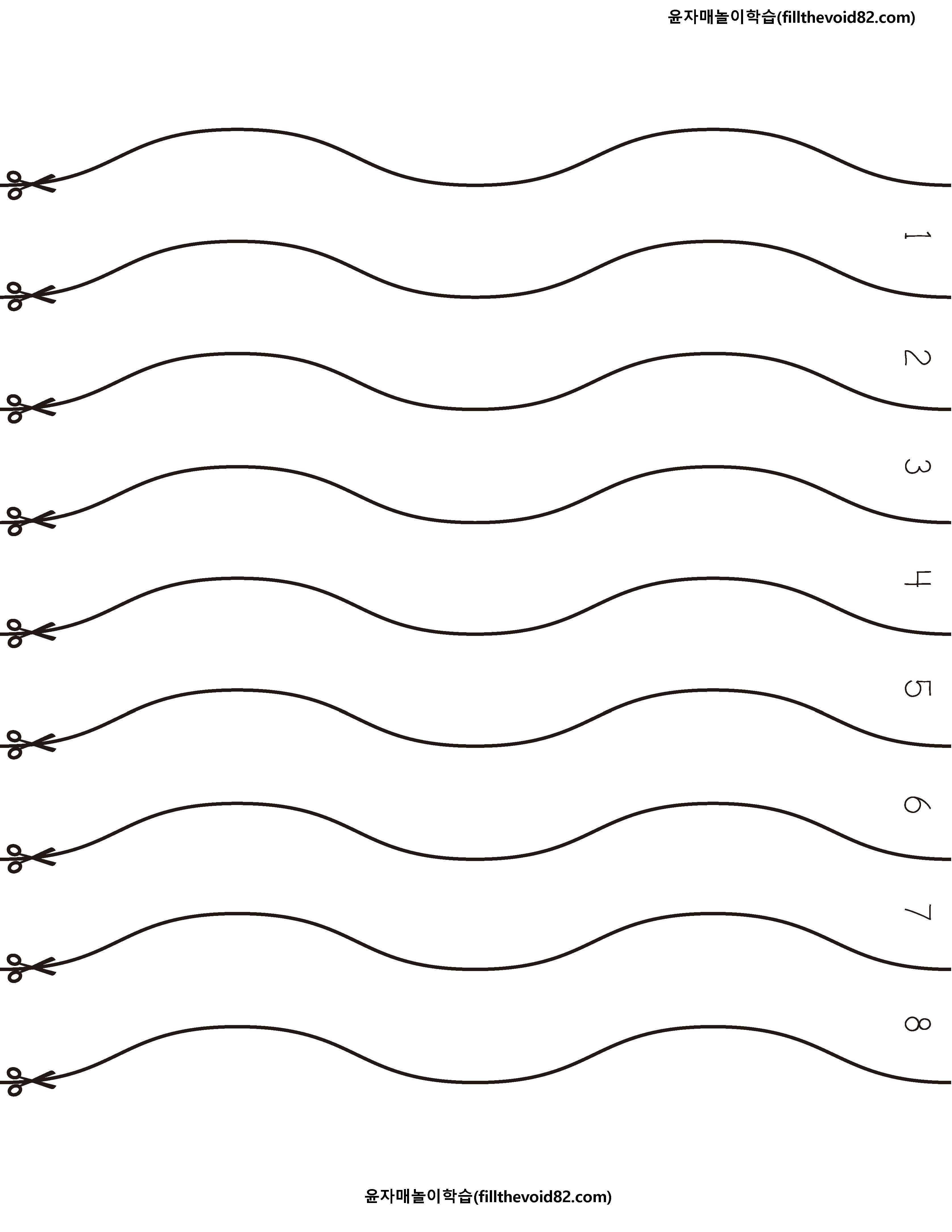 유아들의 손 힘을 기를 수 있는 선 따라 자르기 활동지입니다.