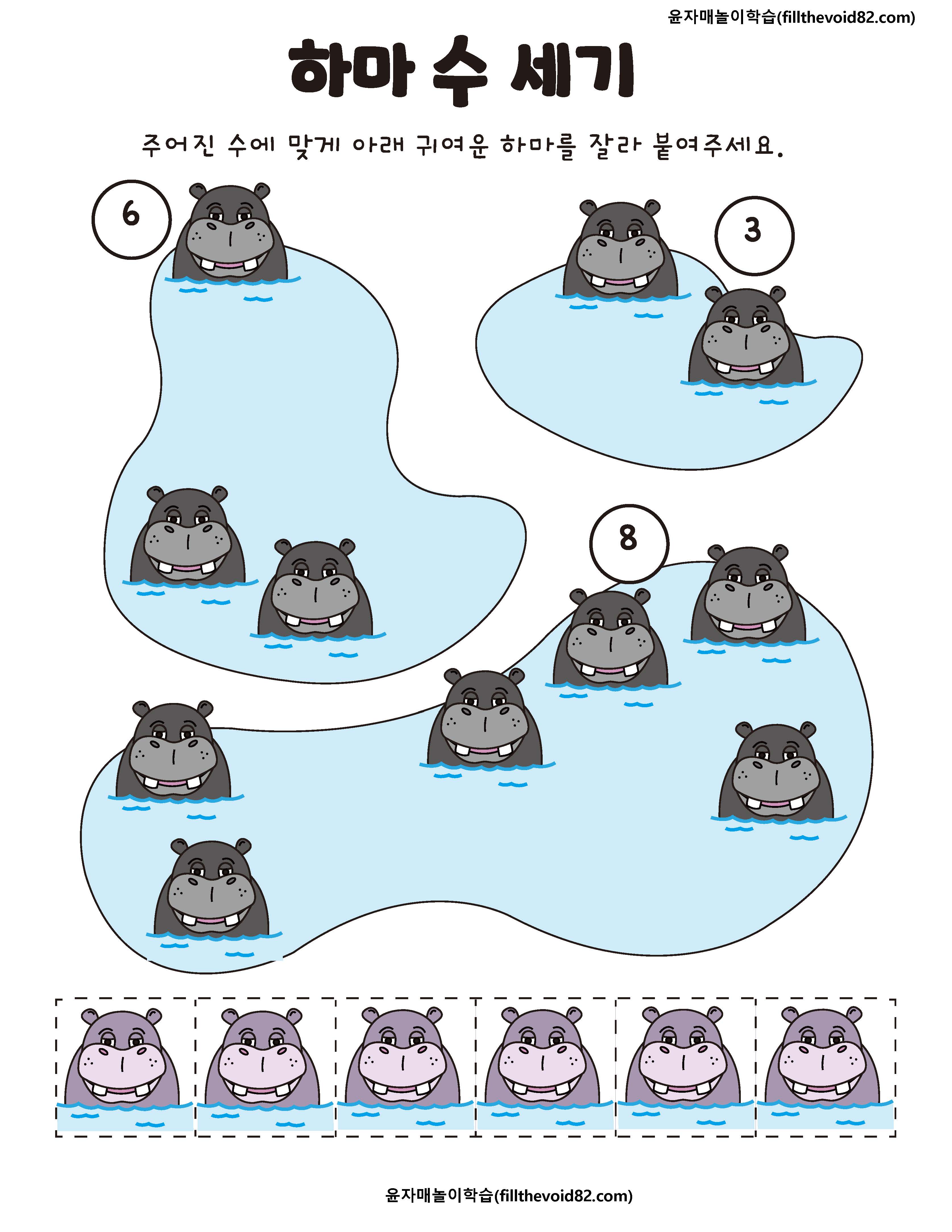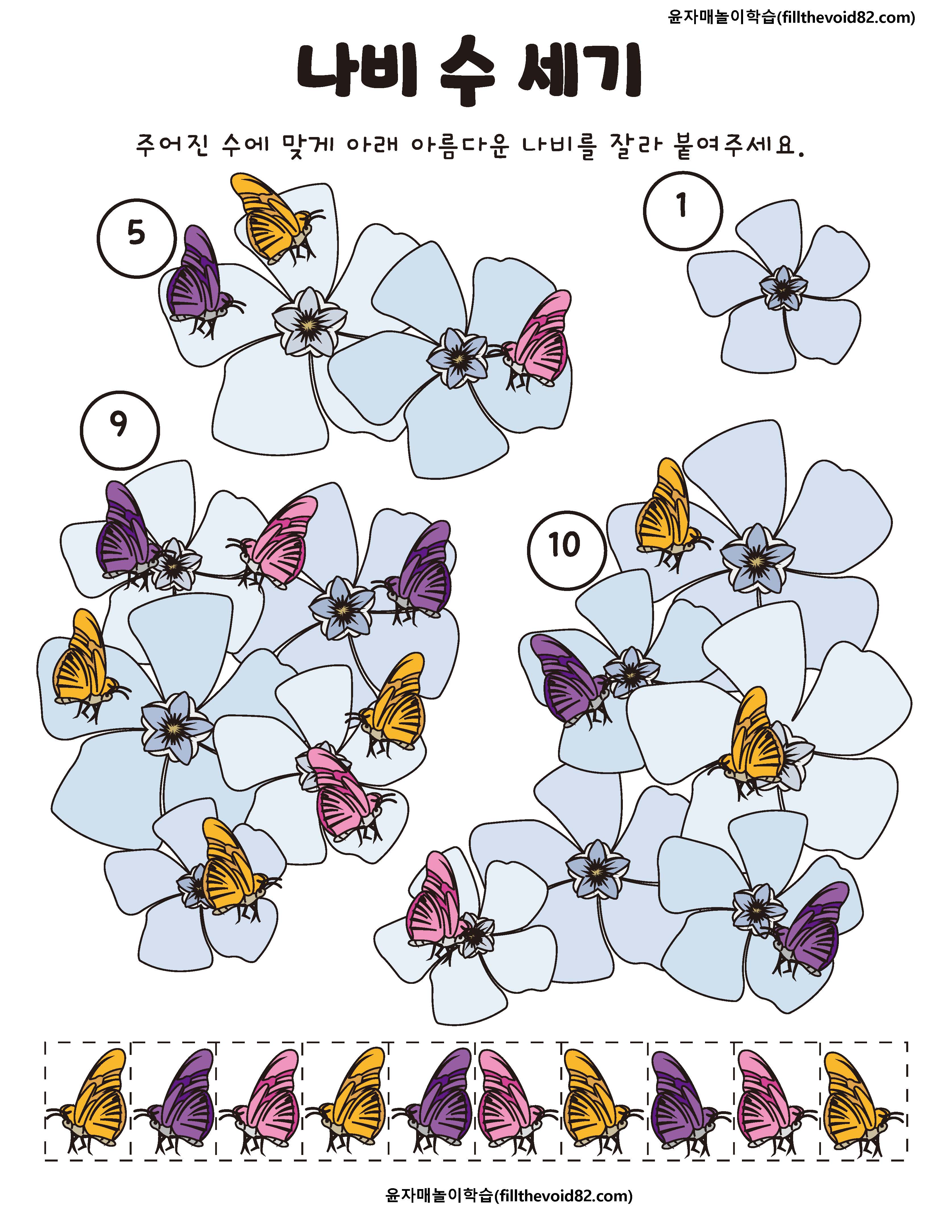 주어진 수에 맞게 잘라 붙이며 덧셈을 학습할 수 있는 활동지입니다.