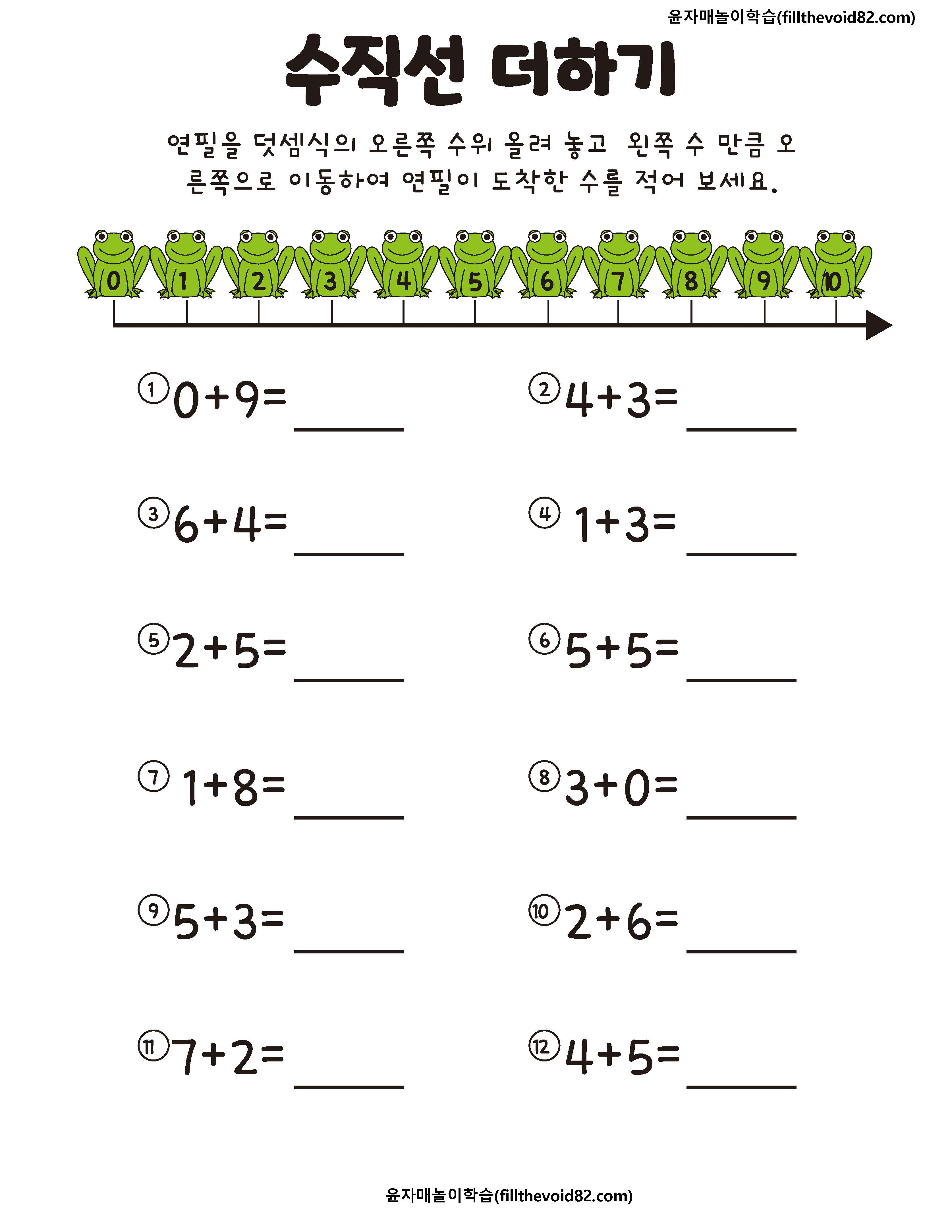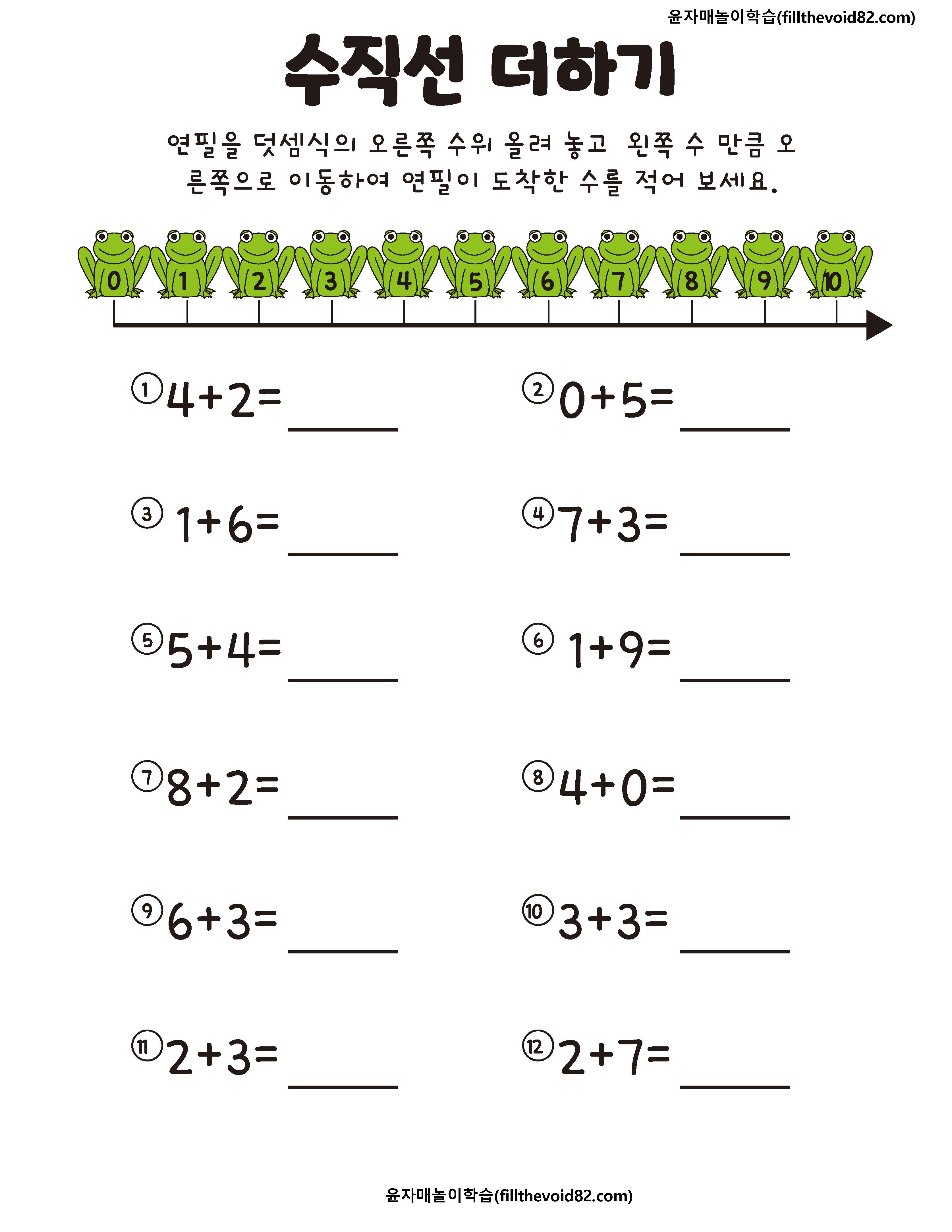 개구리가 그려진 수직선을 보고 덧셈을 학습하는 활동지입니다.