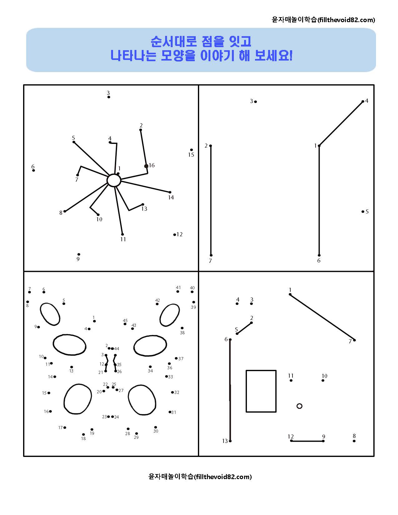 숫자 순서대로 점을 잇고 나타나는 모양을 이야기 해보는 모양 익히기 활동지입니다.