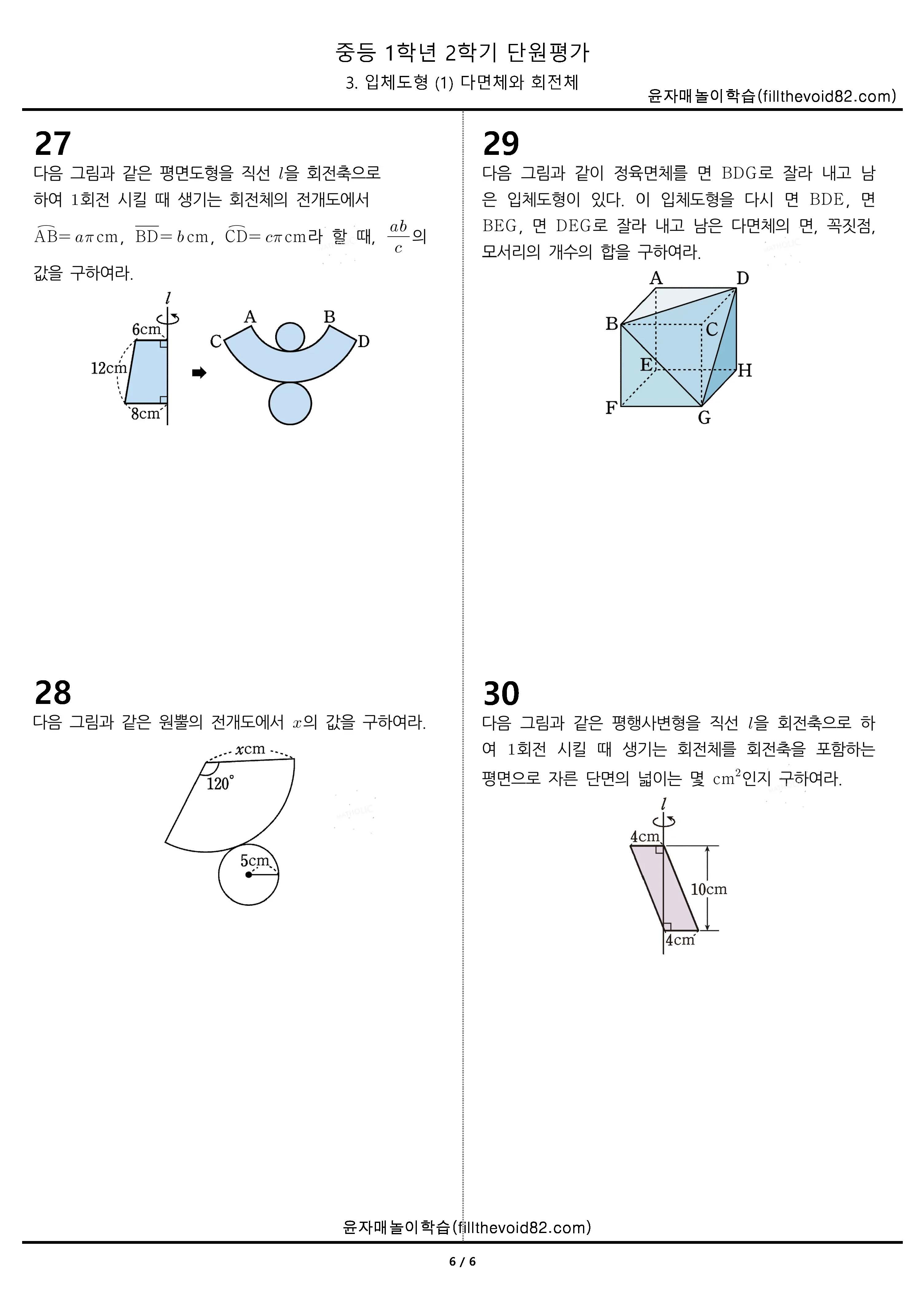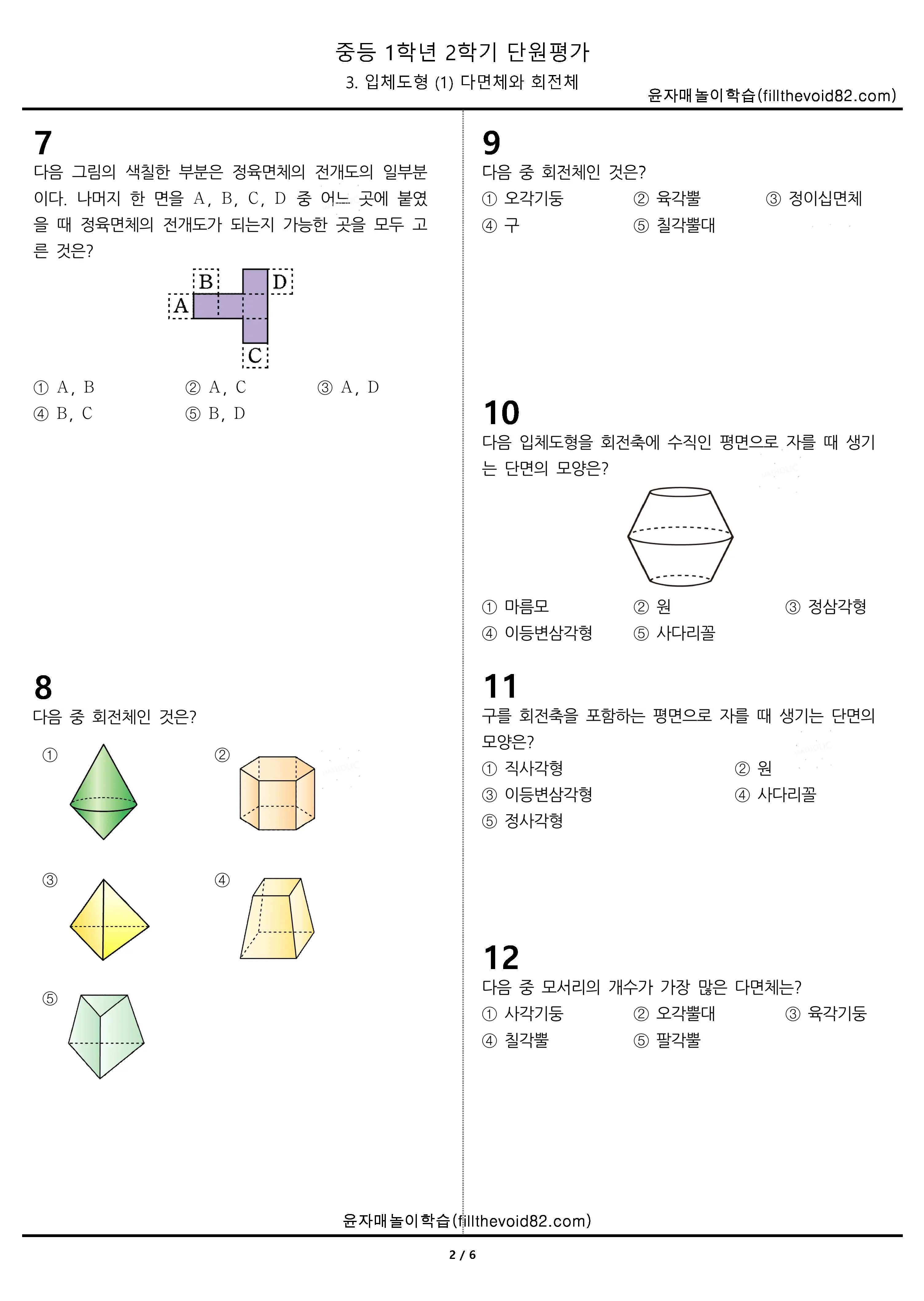 중등무료학습지)중등단원평가) 중등1학년 2학기 3.입체도형(1)다면체와 회전체