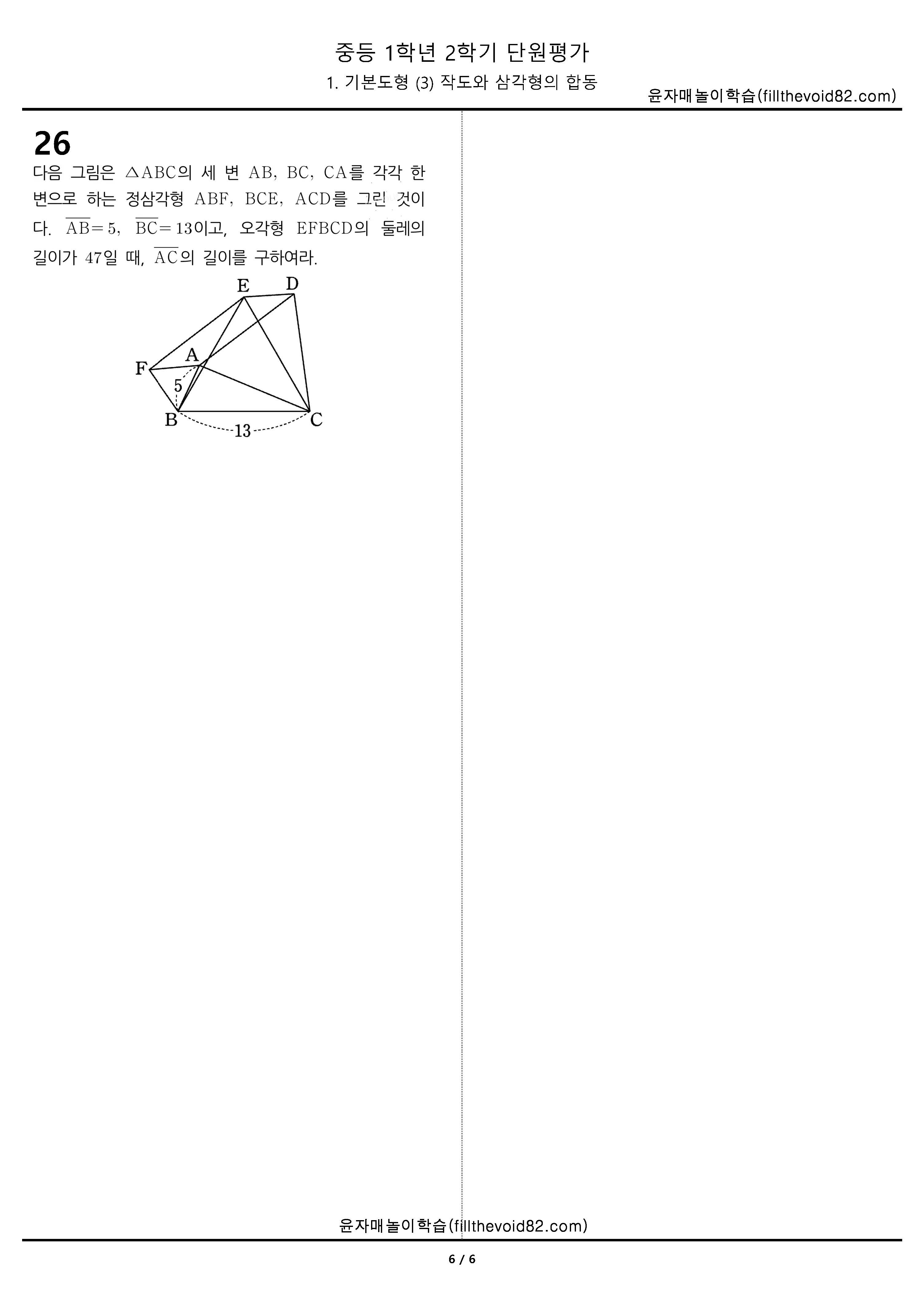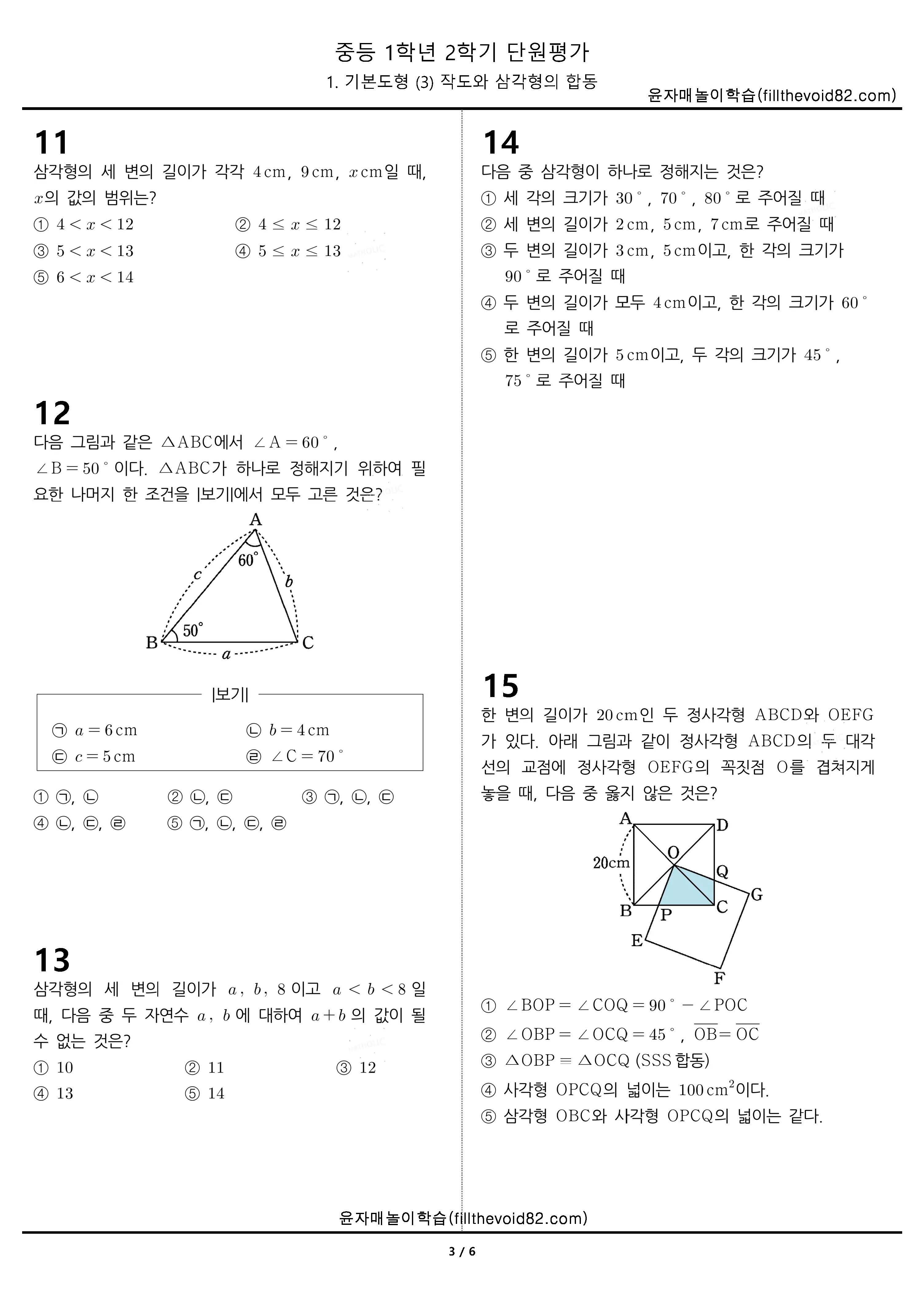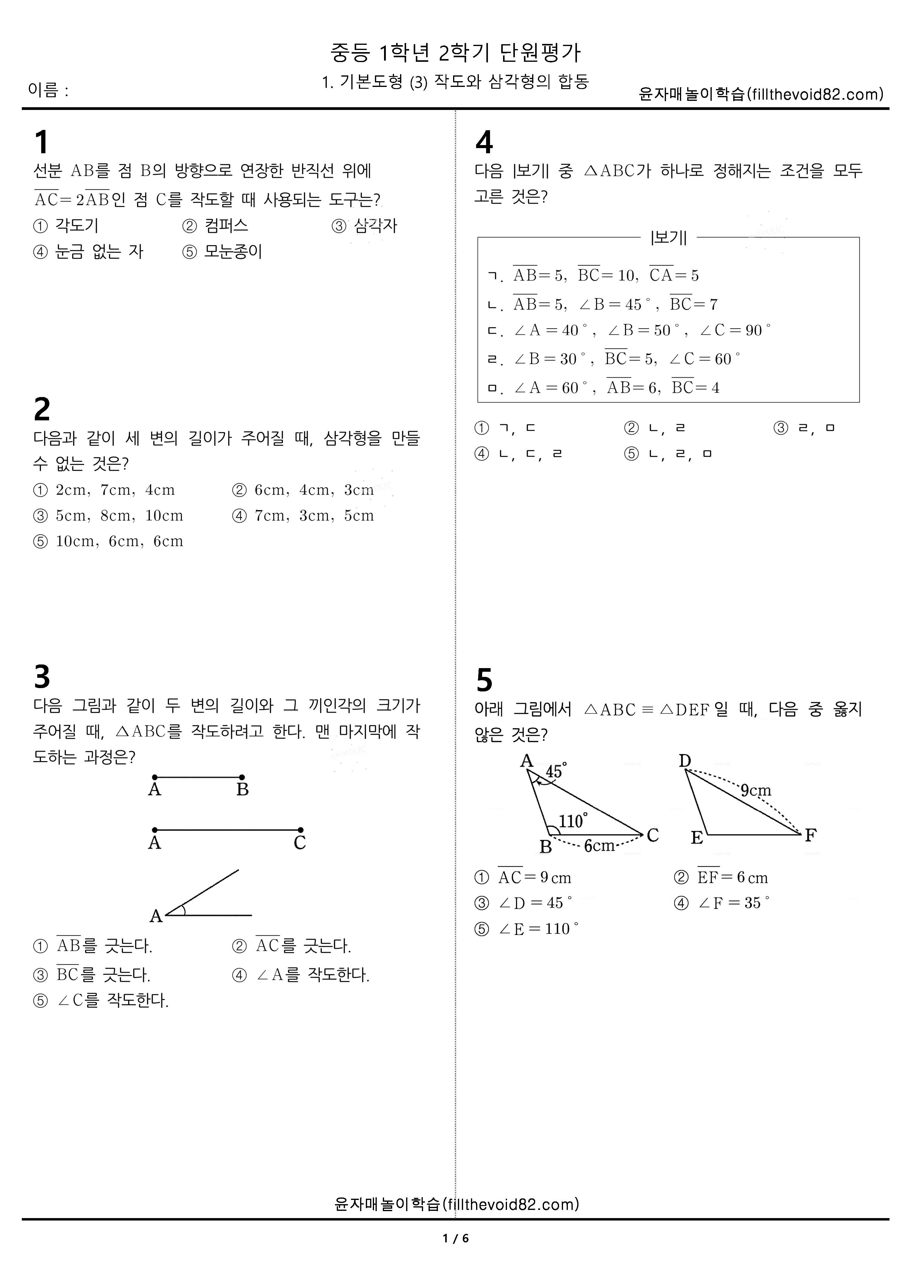 중등무료학습지) 중등단원평가) 중등 1학년 2학기 1. 기본도형 (3) 작도와 삼각형의 합동