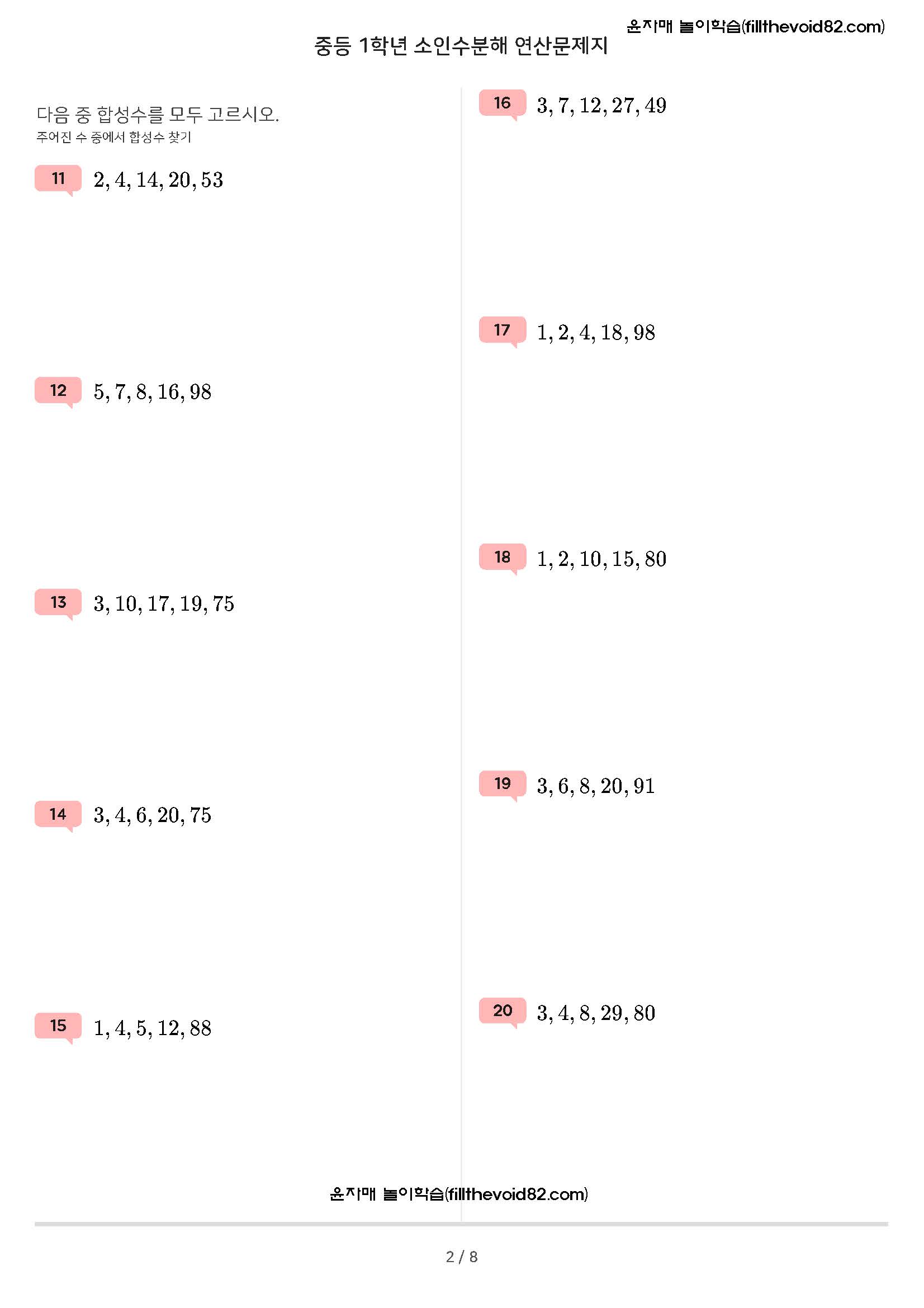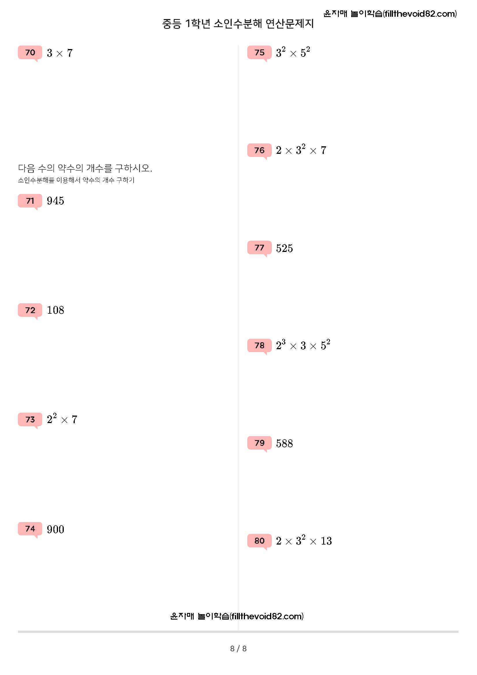 소인수분해를 연습하고 익힐 수 있는 난이도 하, 80문제 연산문제지입니다