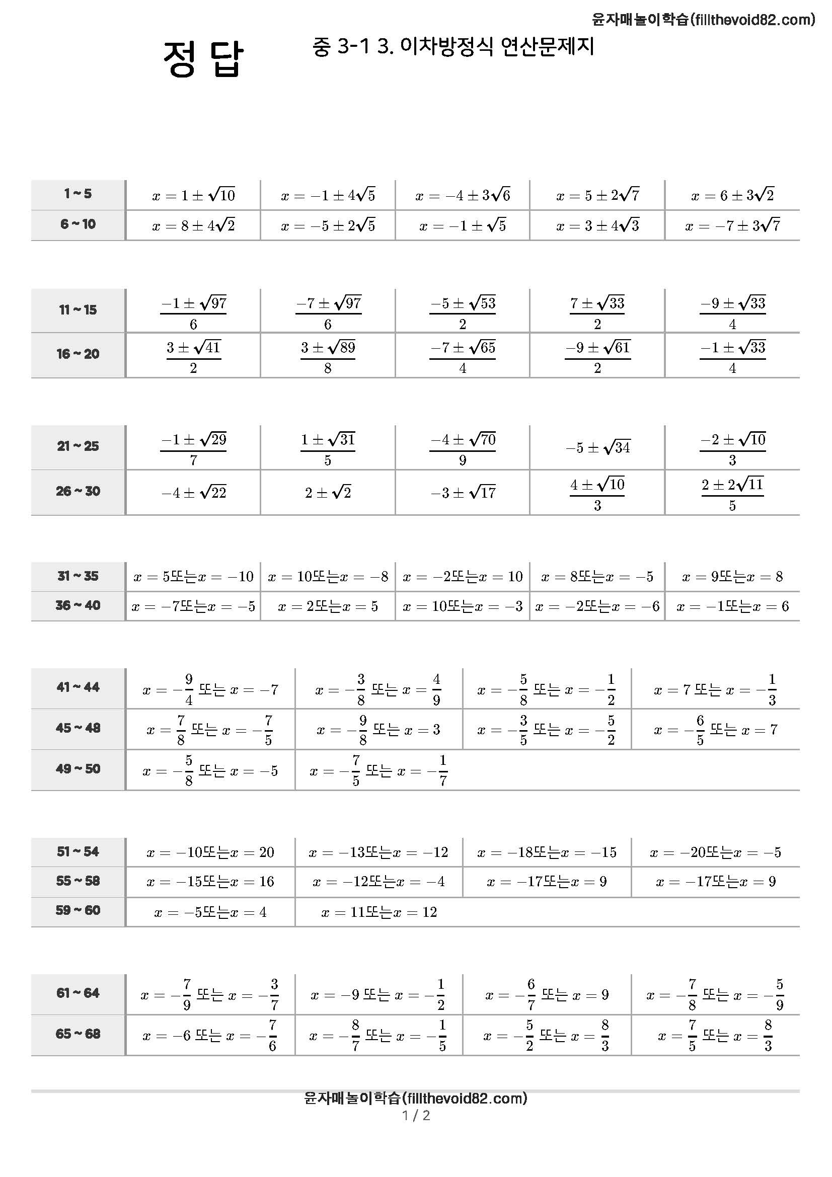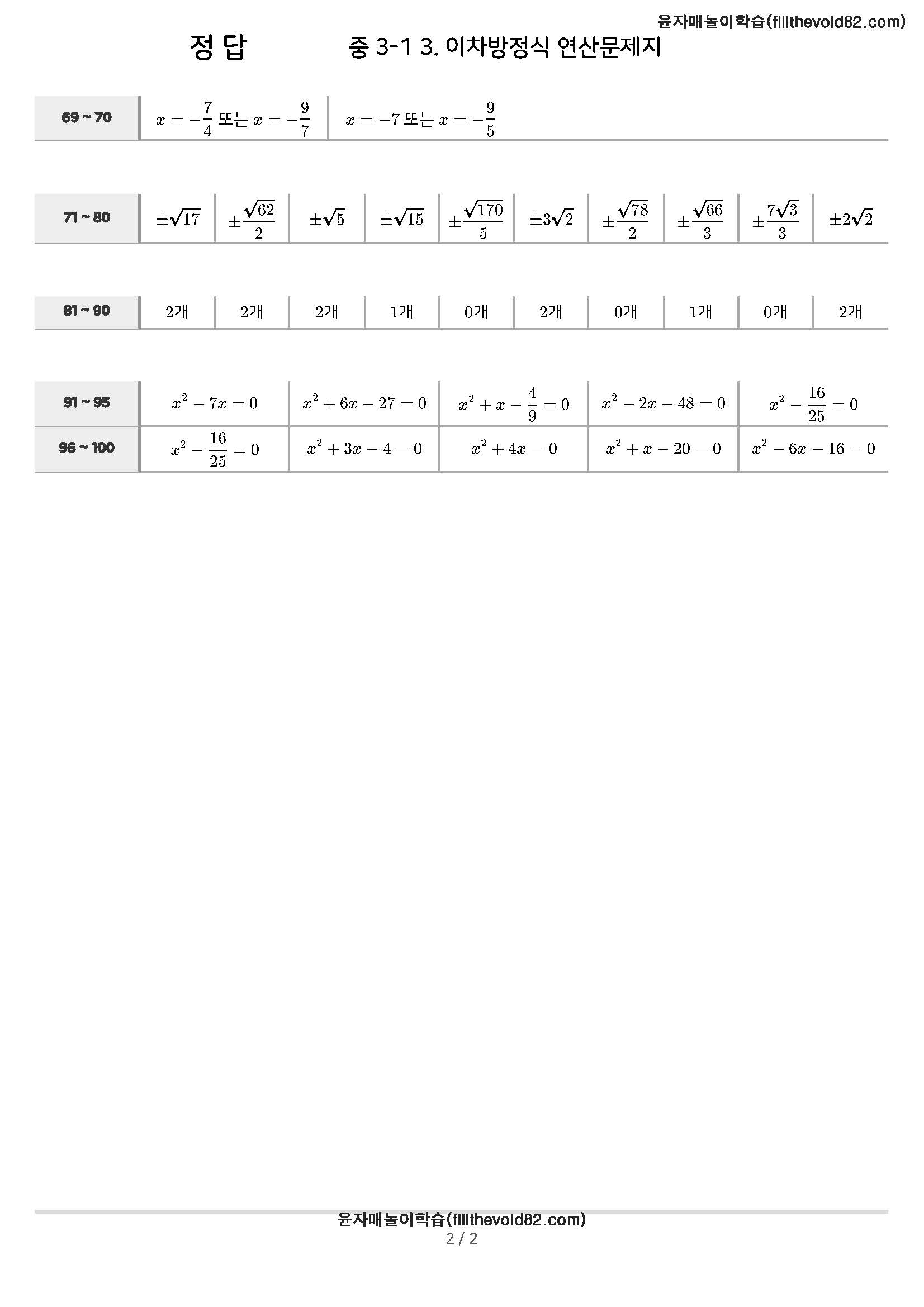 중등 3학년 1학기 이차방정식 해를 구하는 연습을 할 수 있는 연산문제 100개입니다.