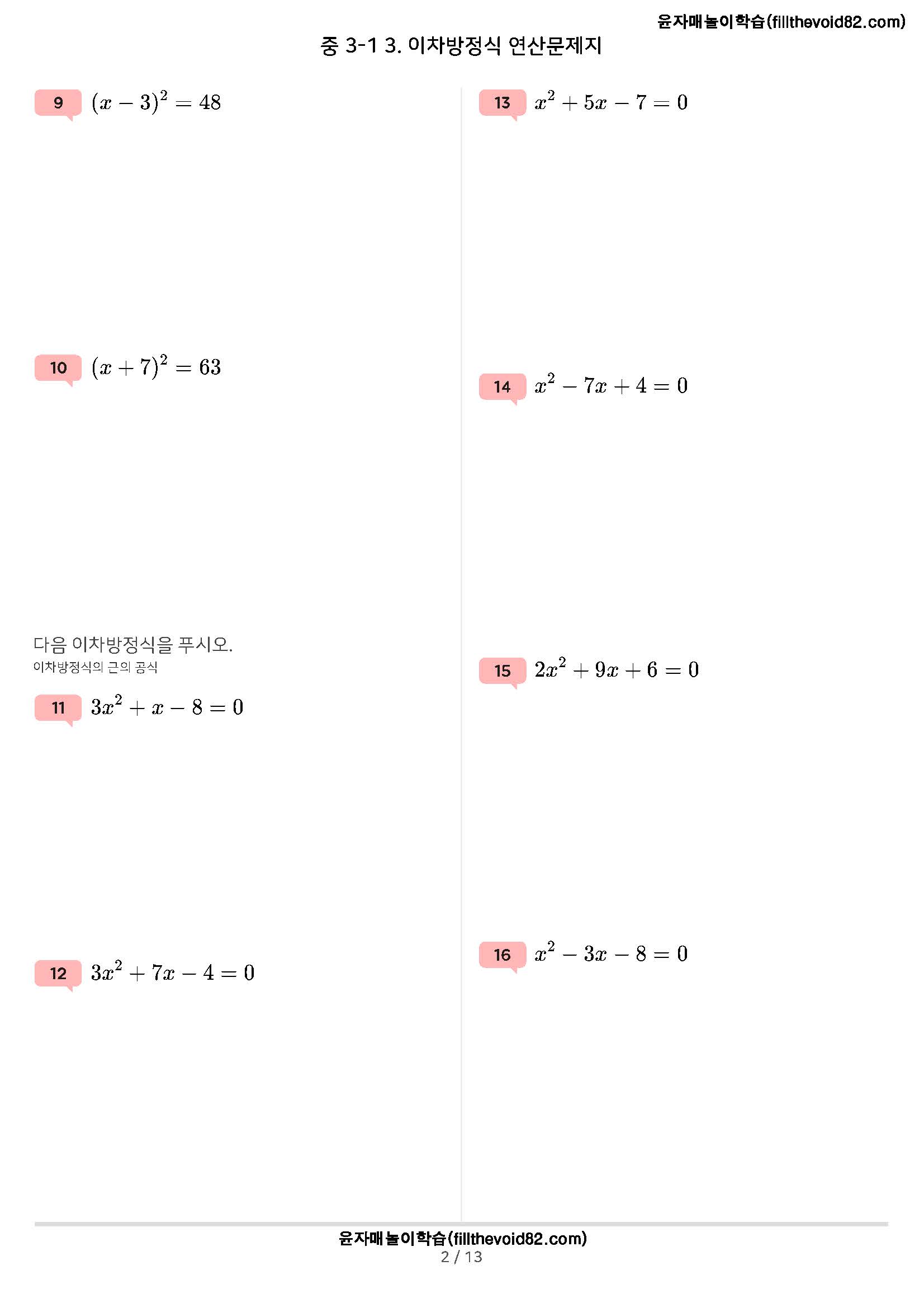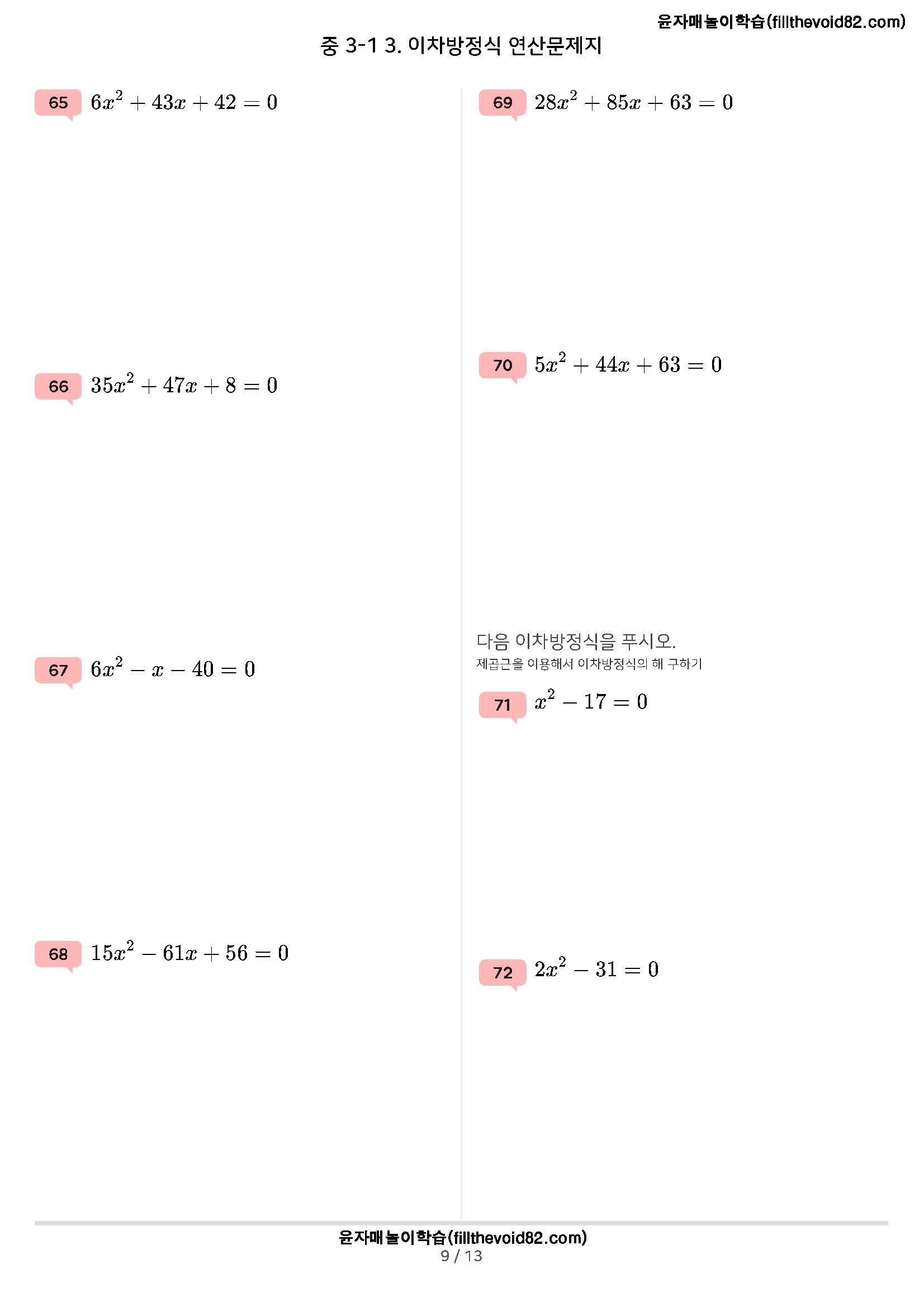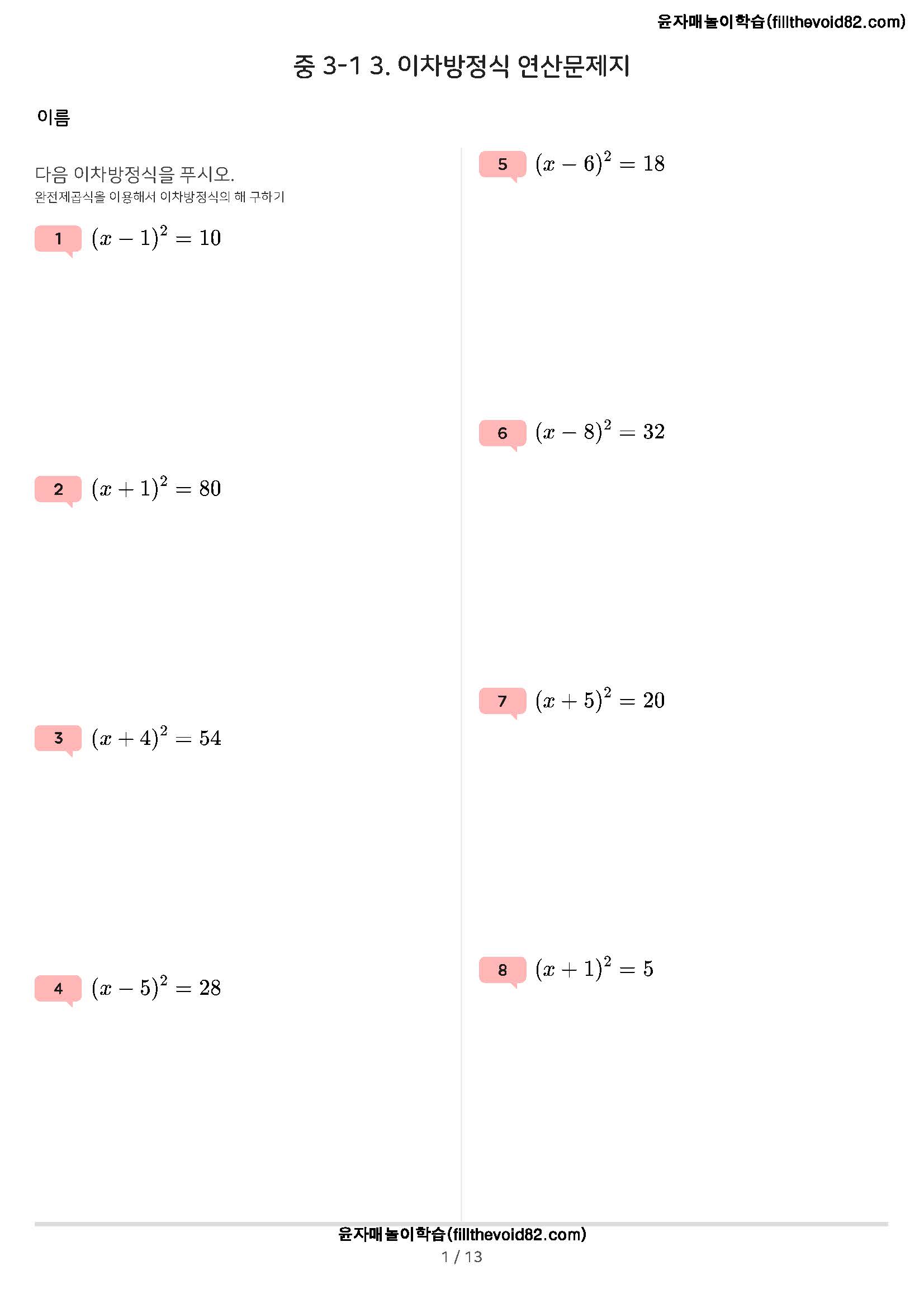중등 3학년 1학기-3. 이차방정식 연산문제지