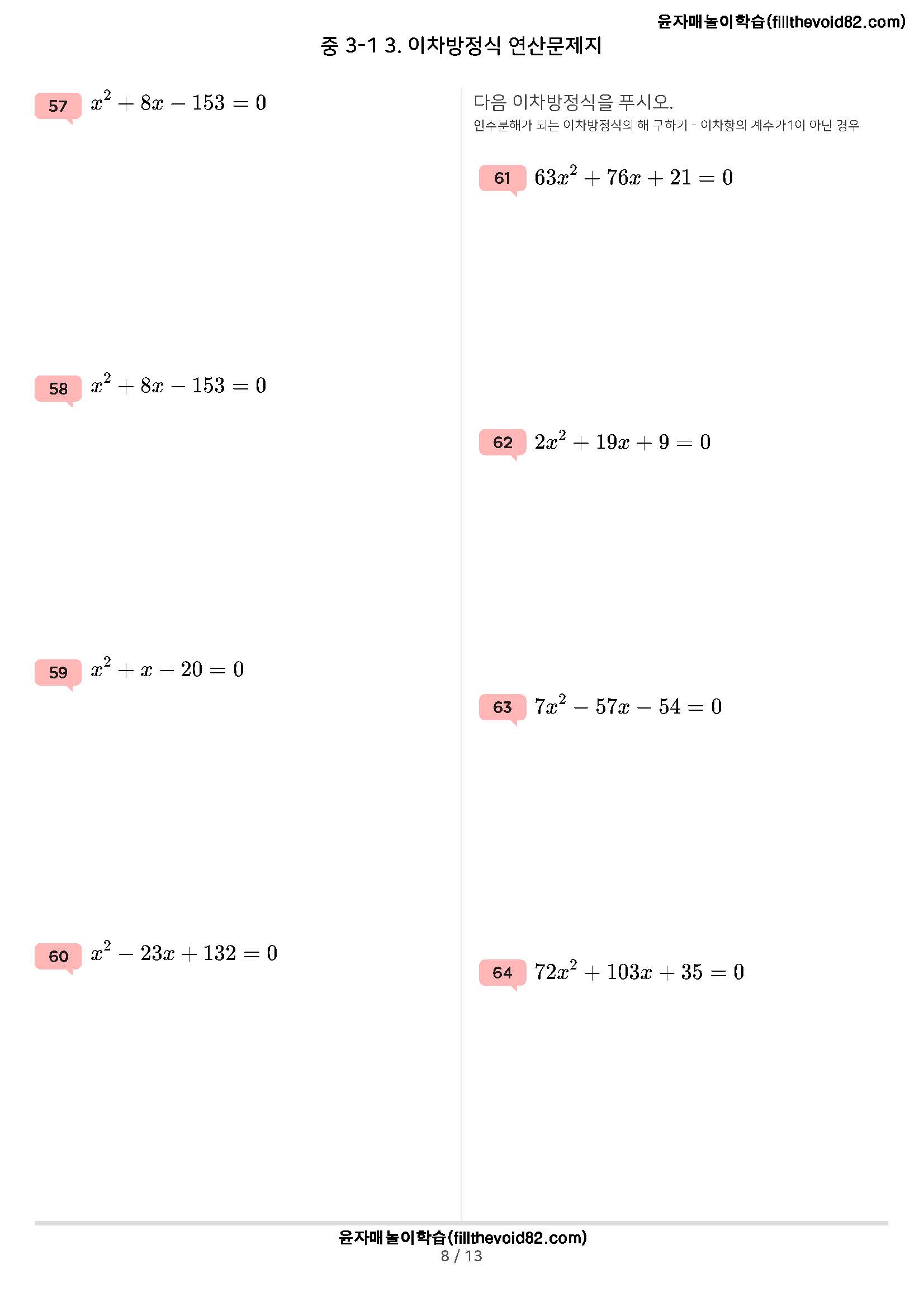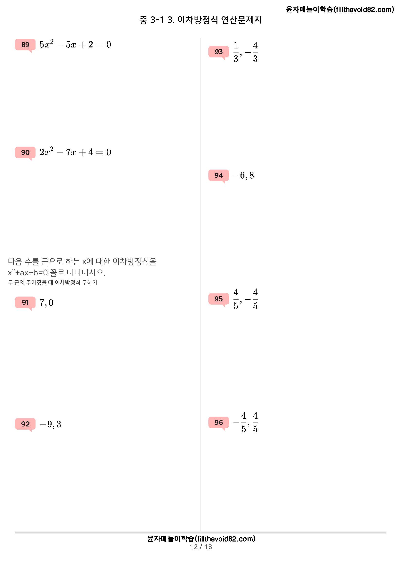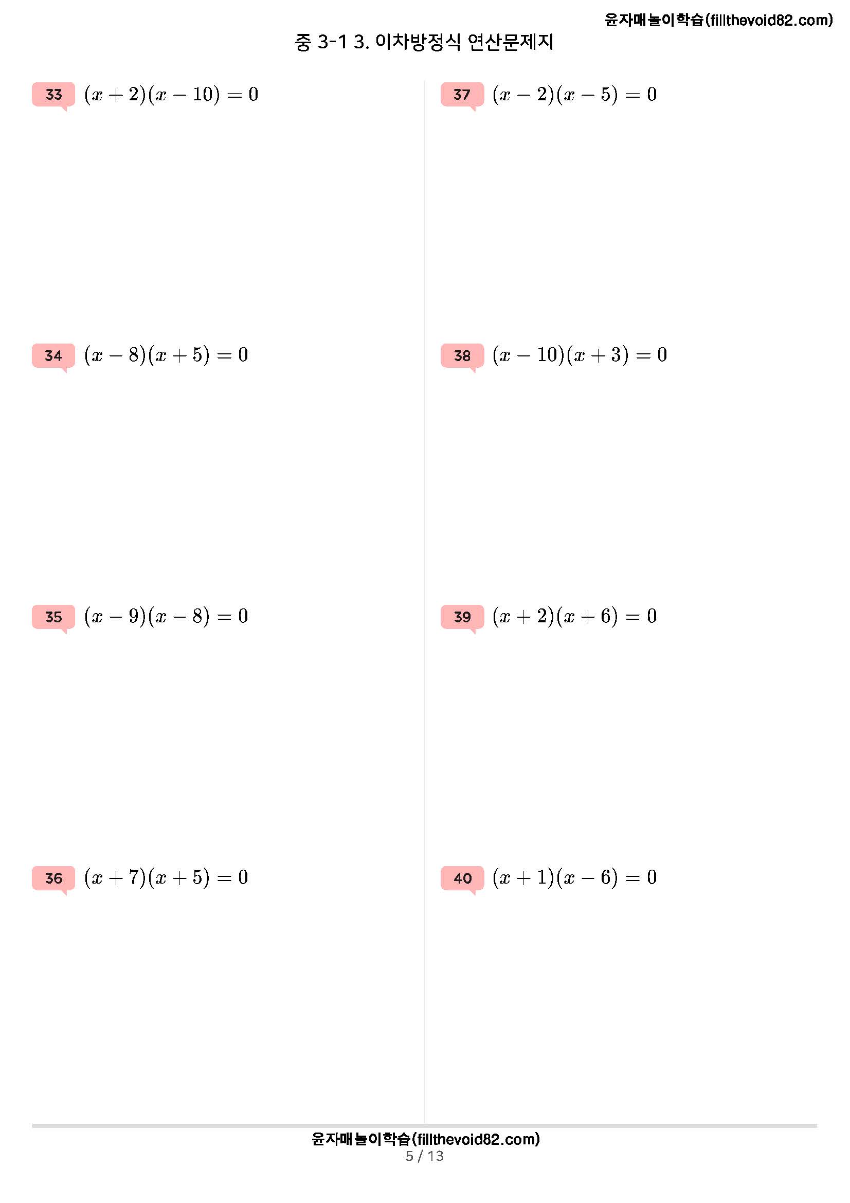 중등 3학년 1학기-3. 이차방정식 연산문제지