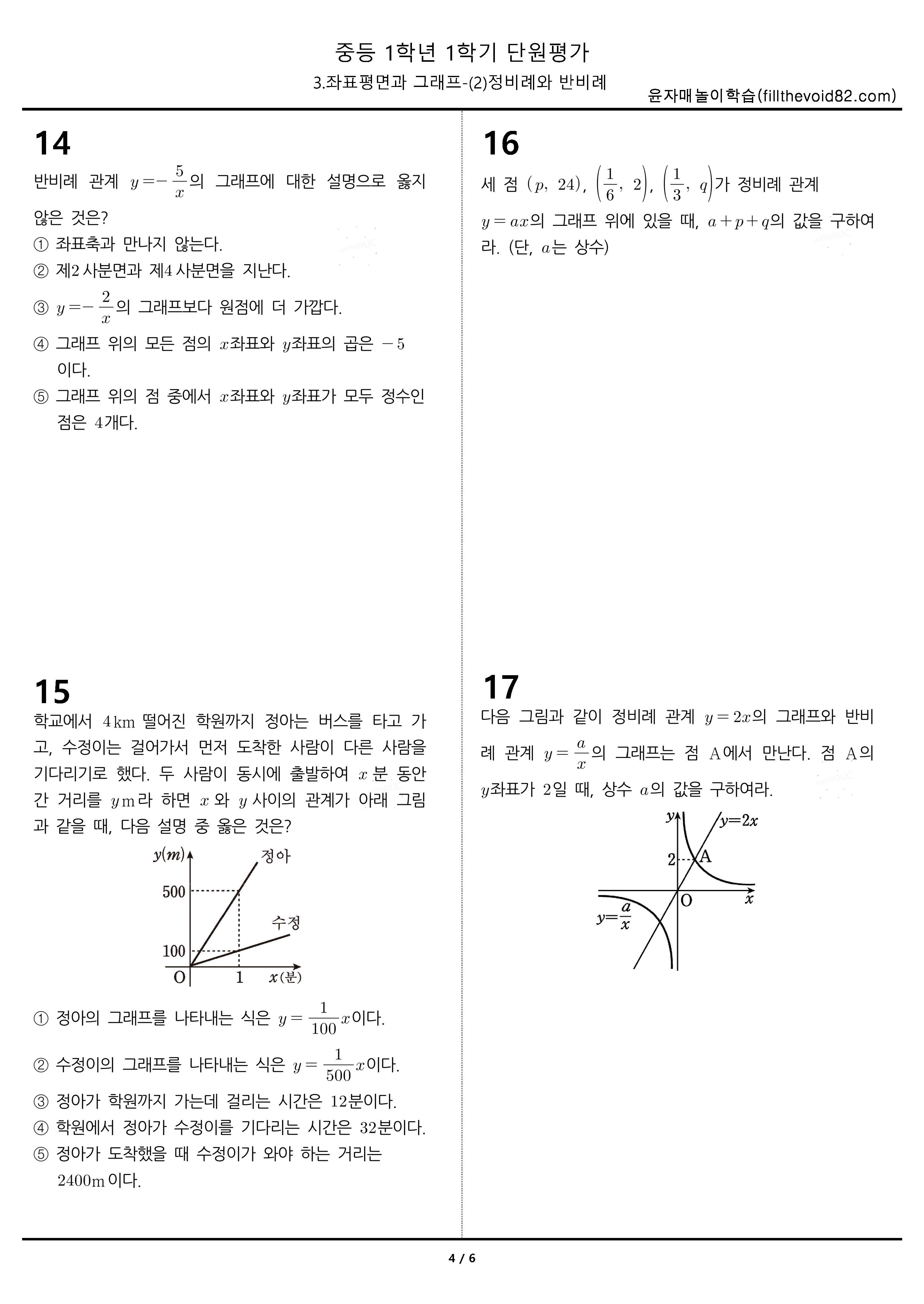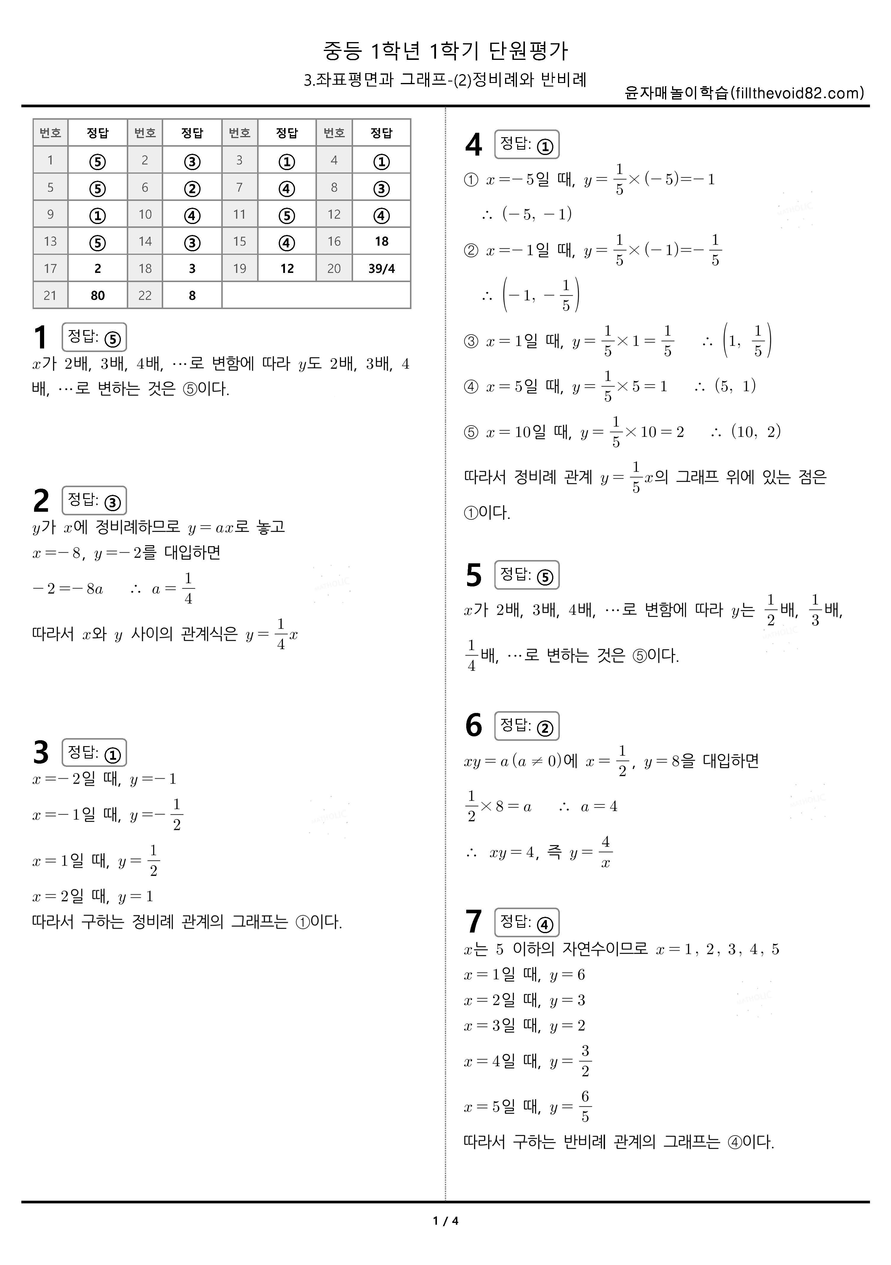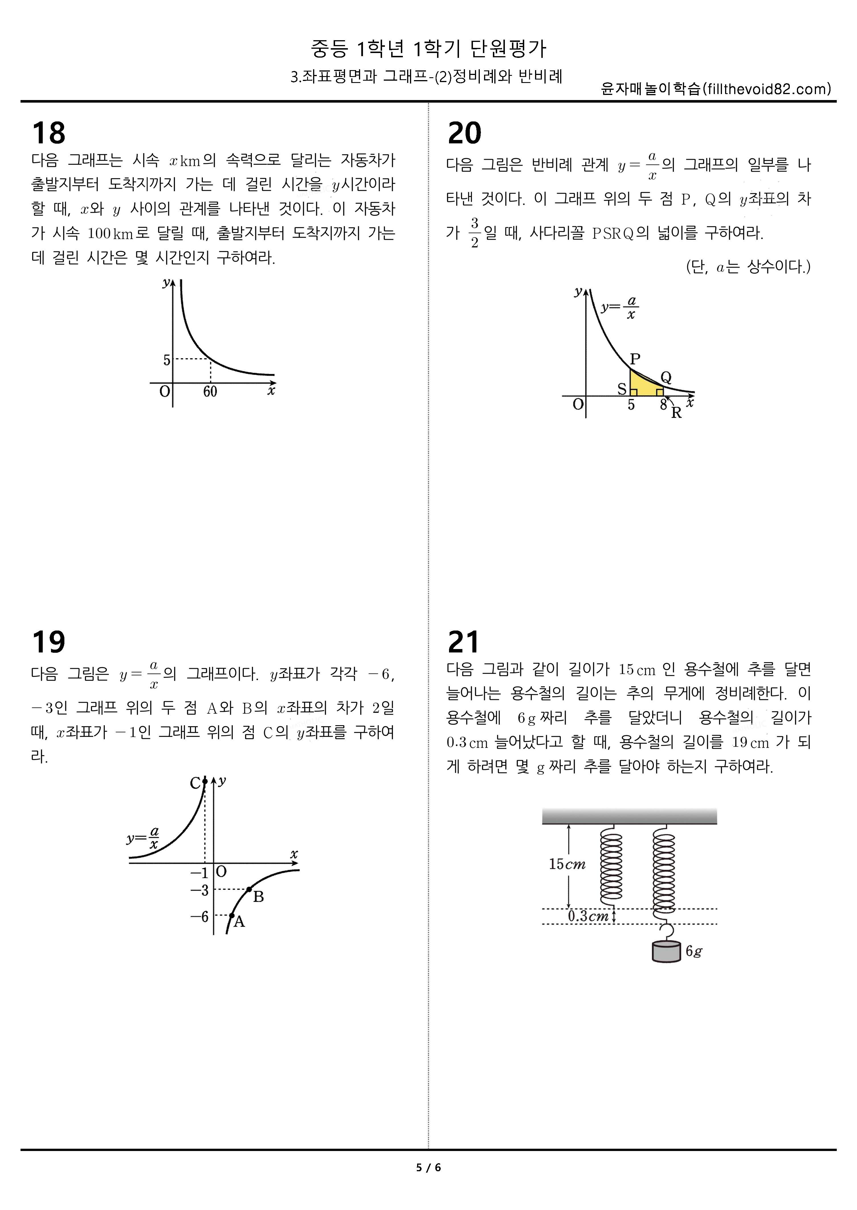 중등 1학년 1학기 좌표평면과 그래프 단원의 정비례와 반비례, 22문제입니다