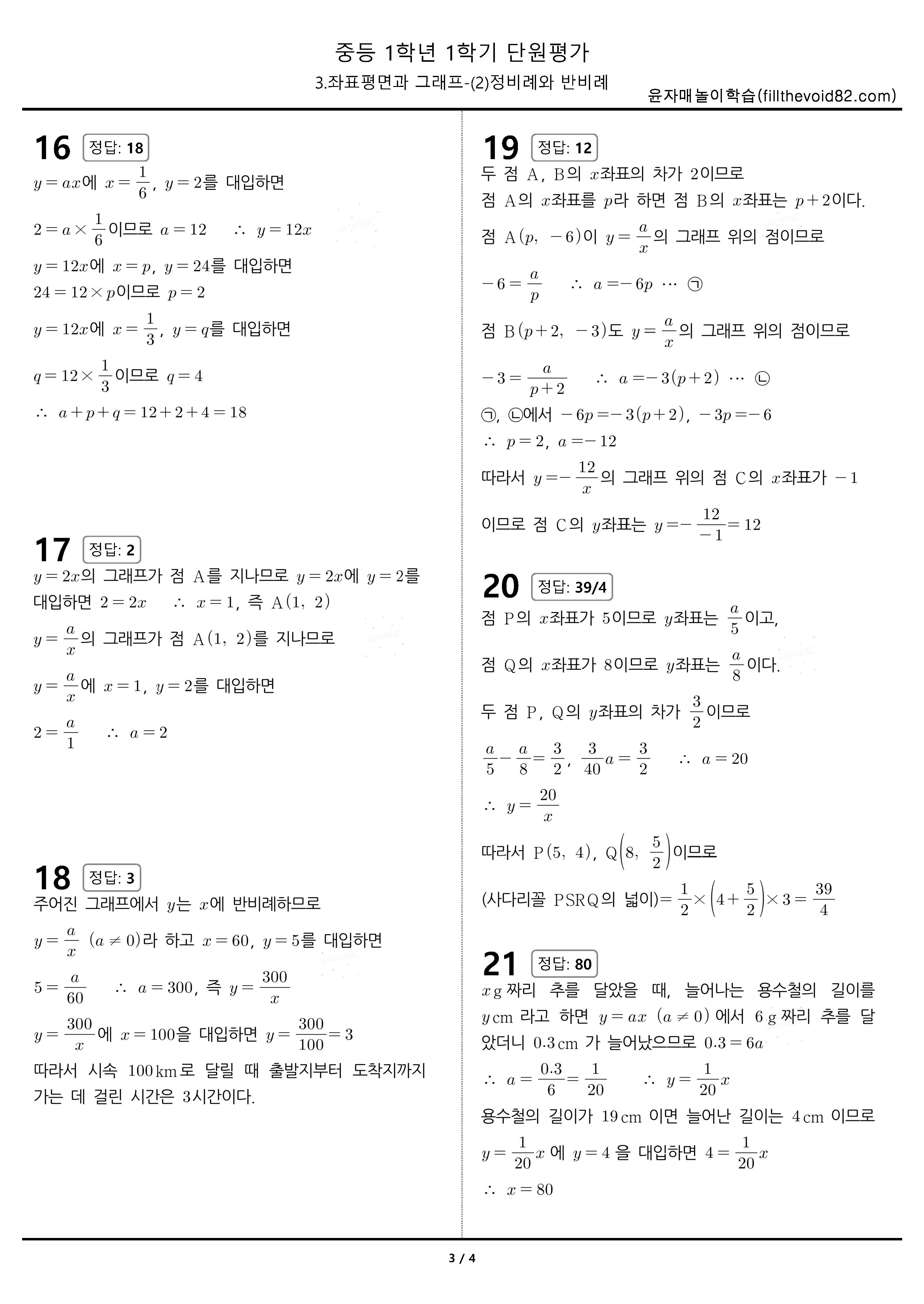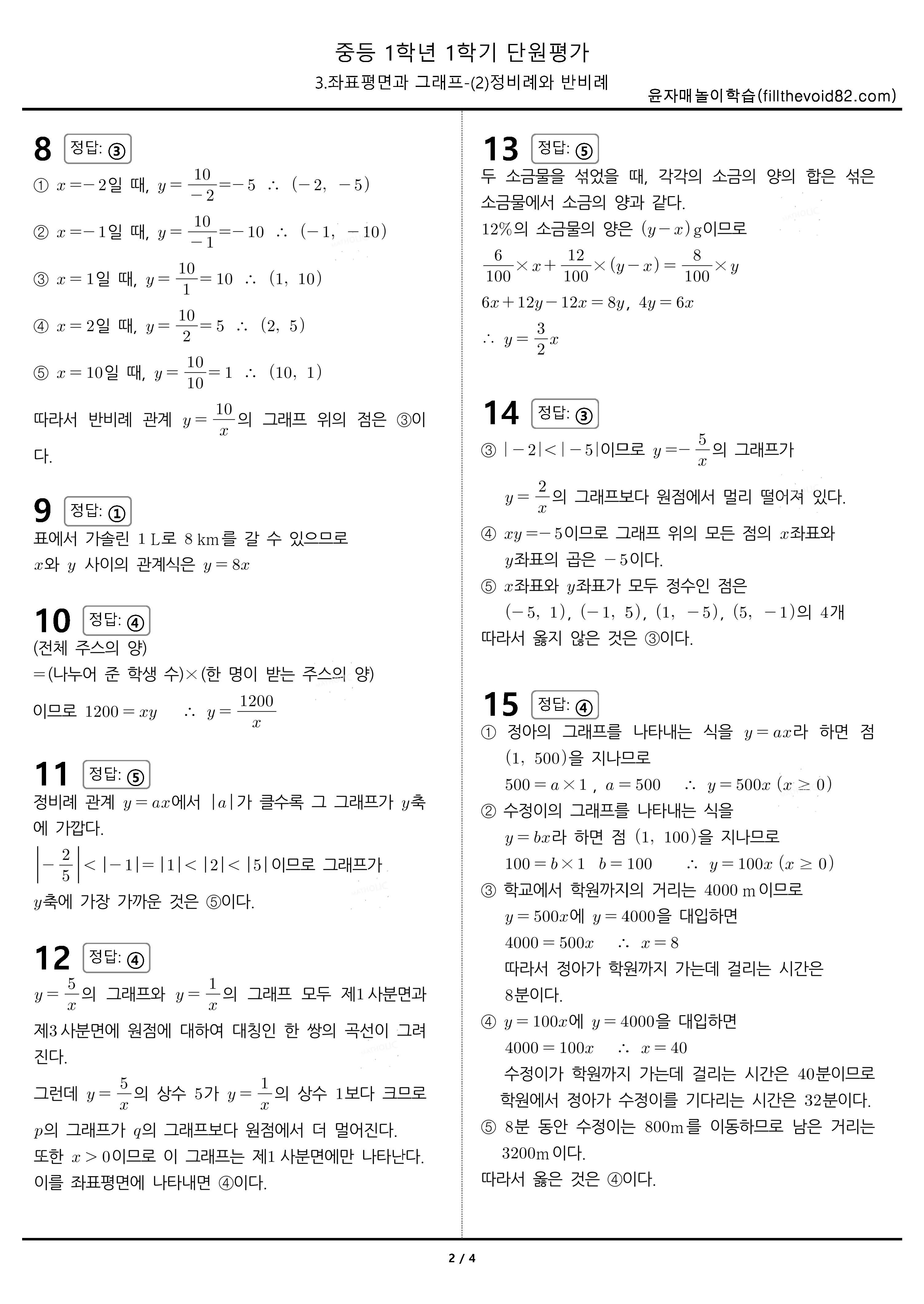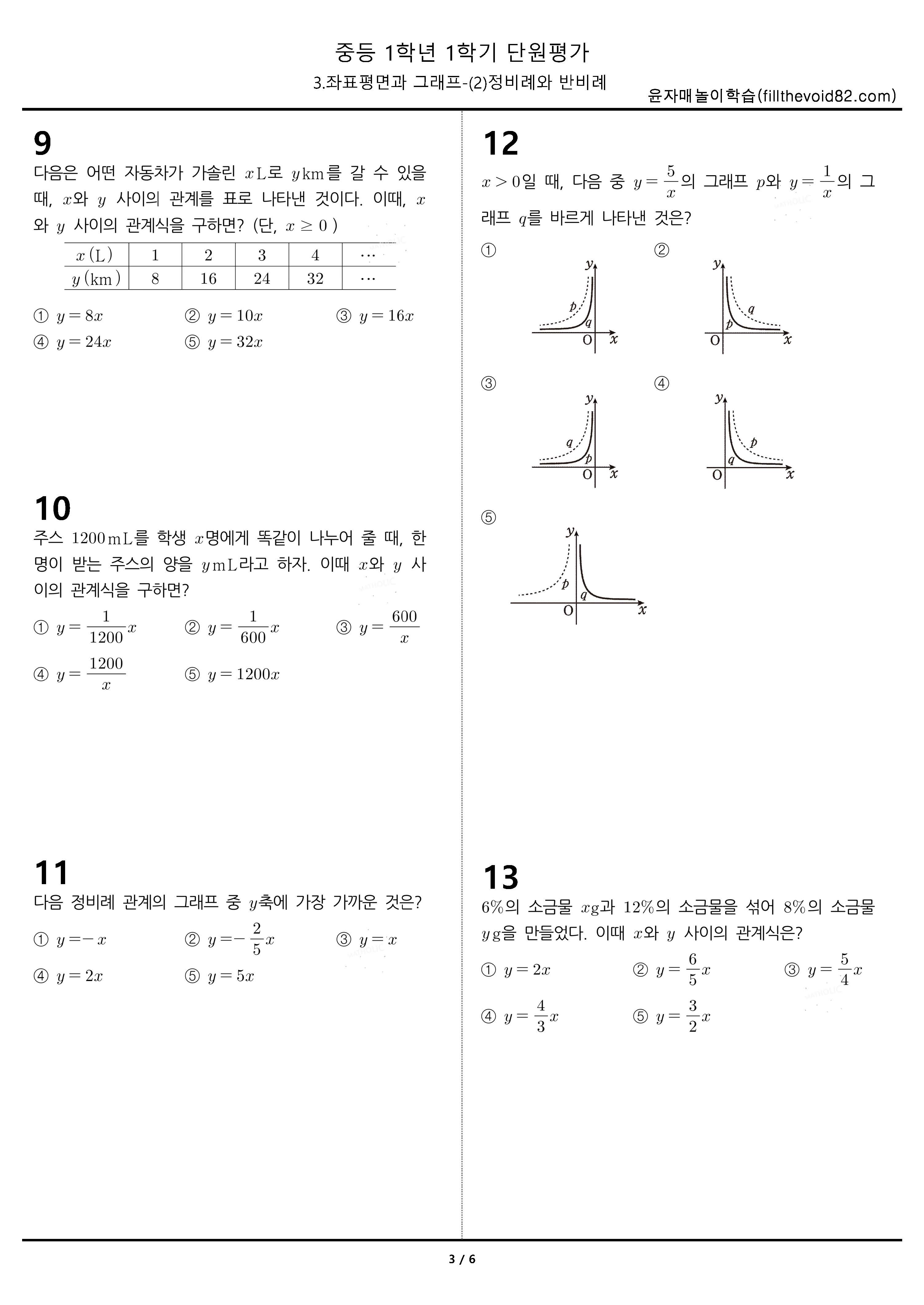 중등 1학년 1학기 좌표평면과 그래프 단원의 정비례와 반비례, 22문제입니다