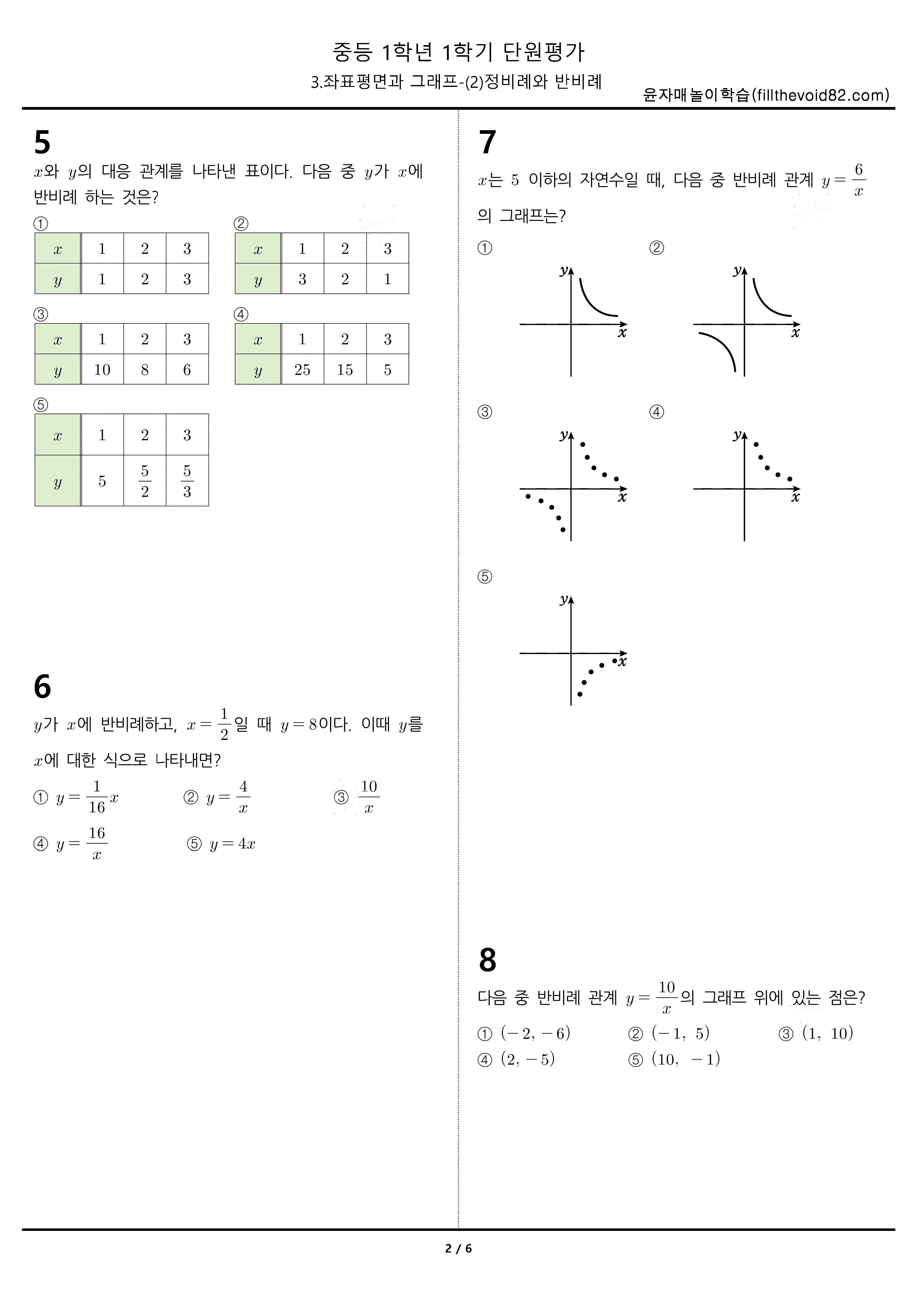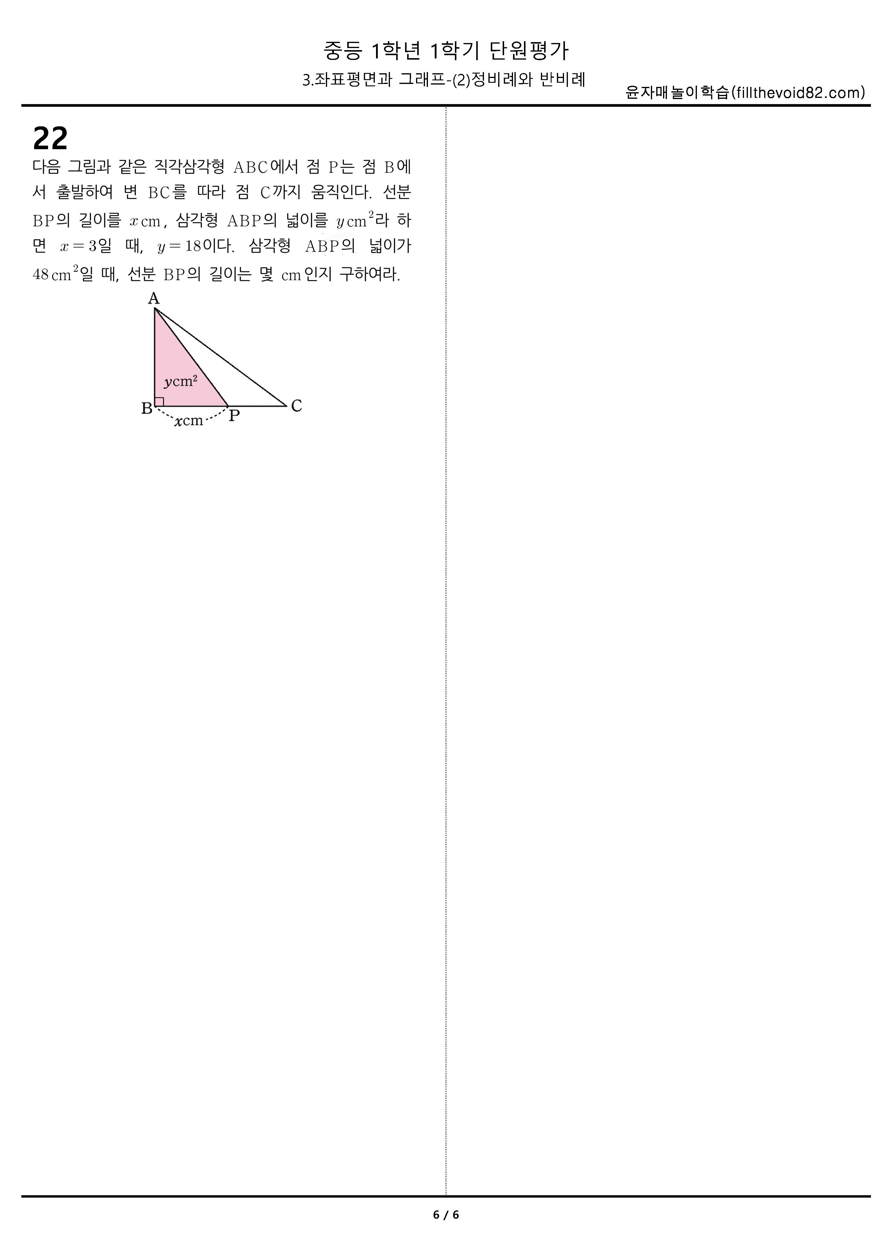 중등 1학년 1학기 좌표평면과 그래프 단원의 정비례와 반비례, 22문제입니다