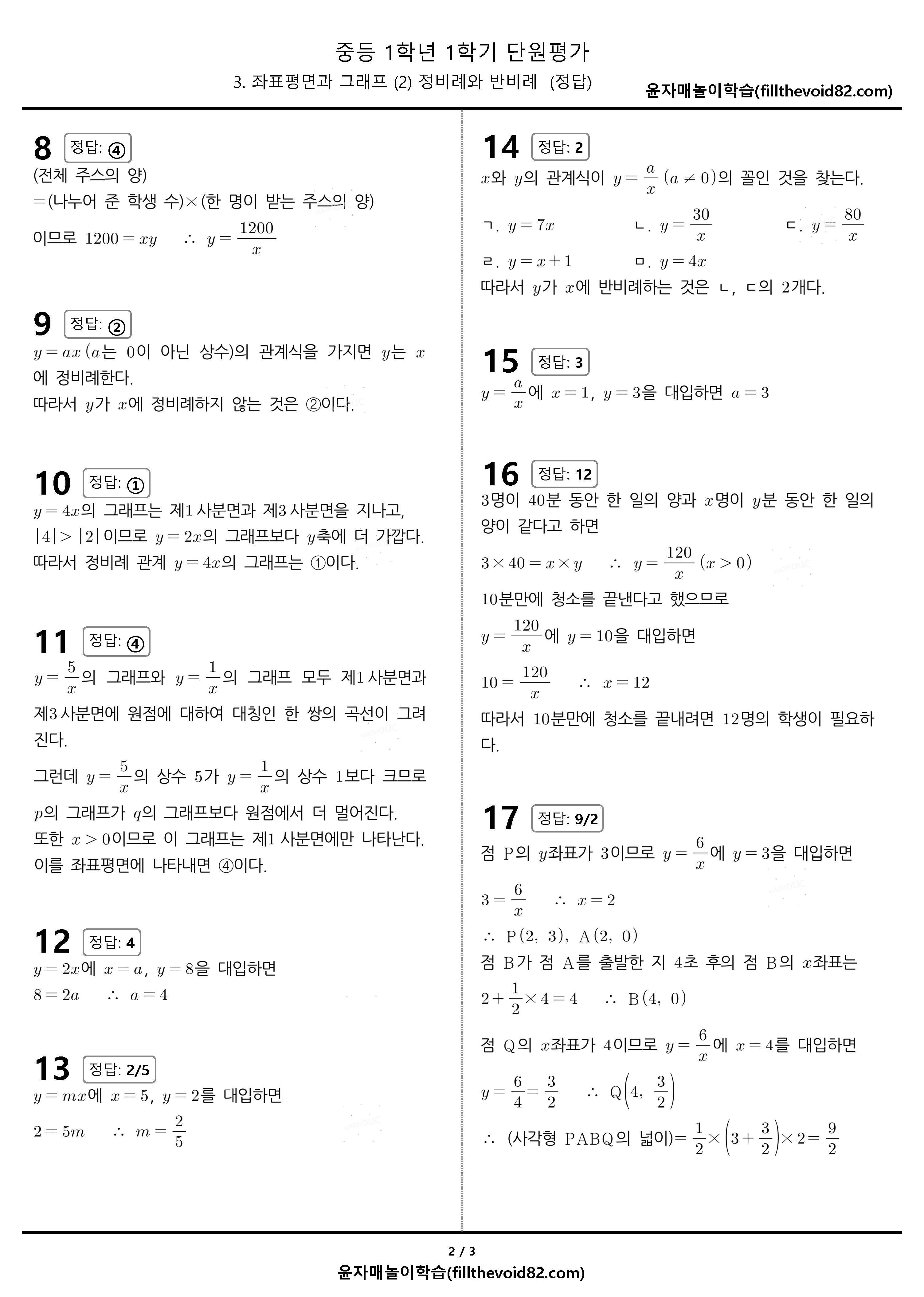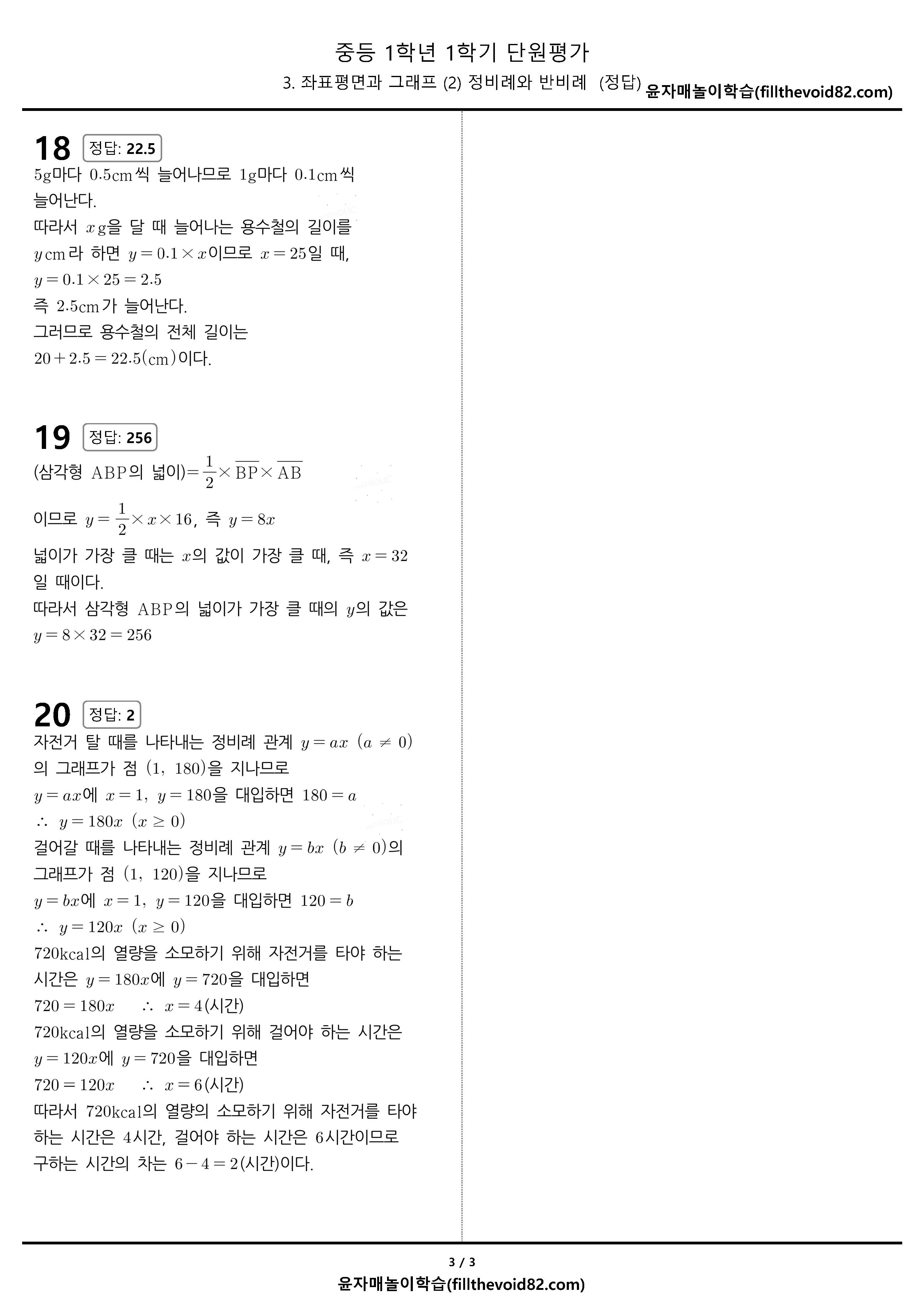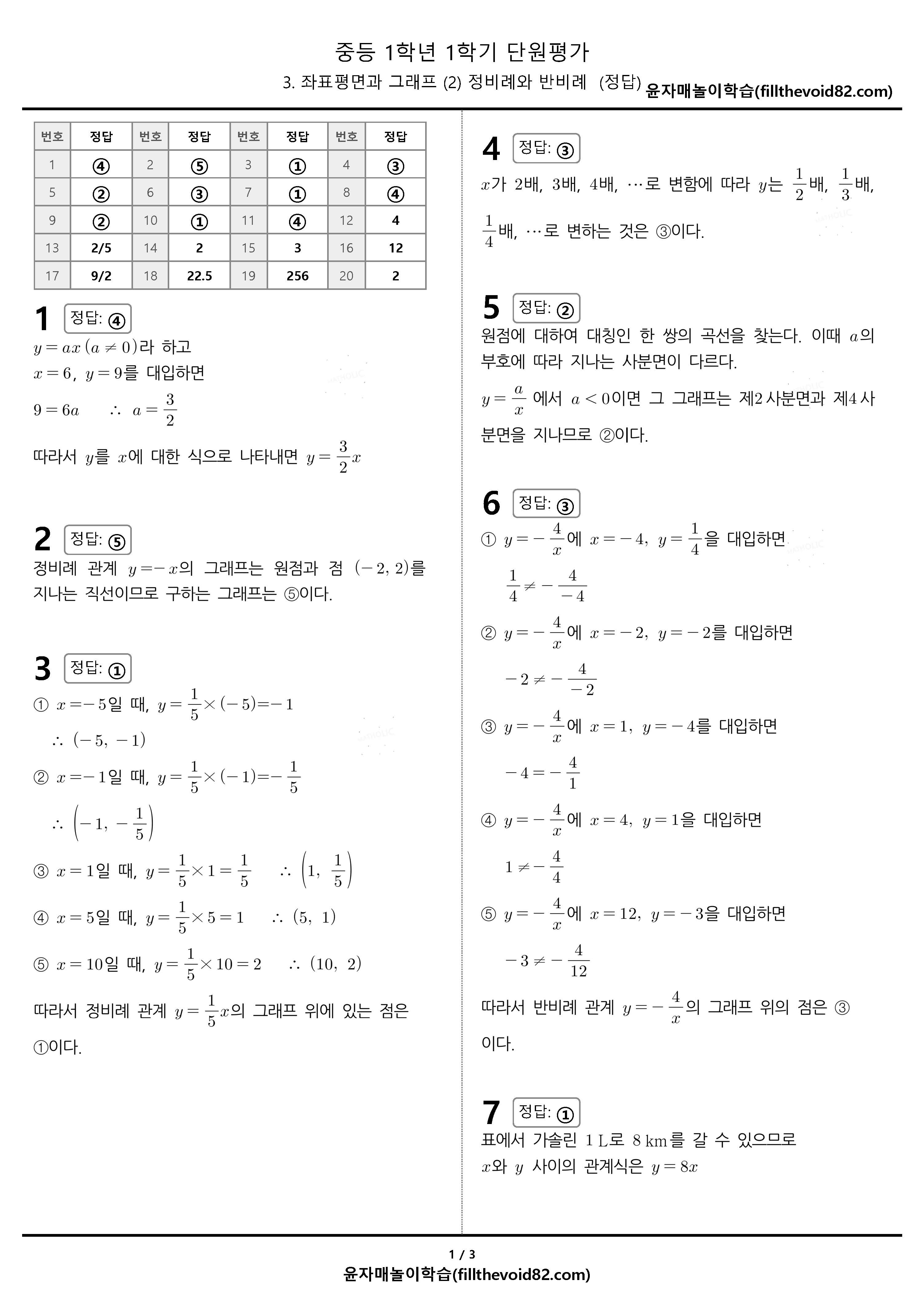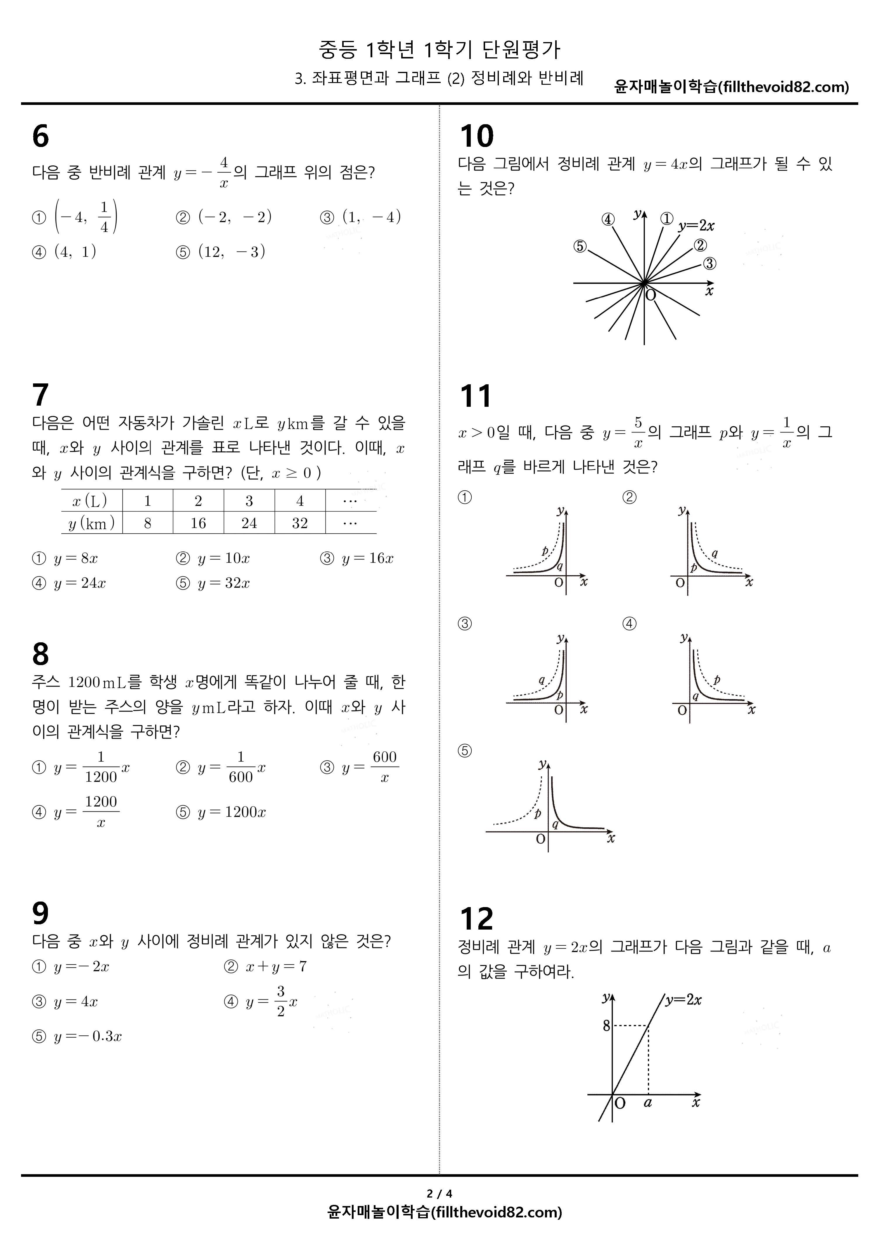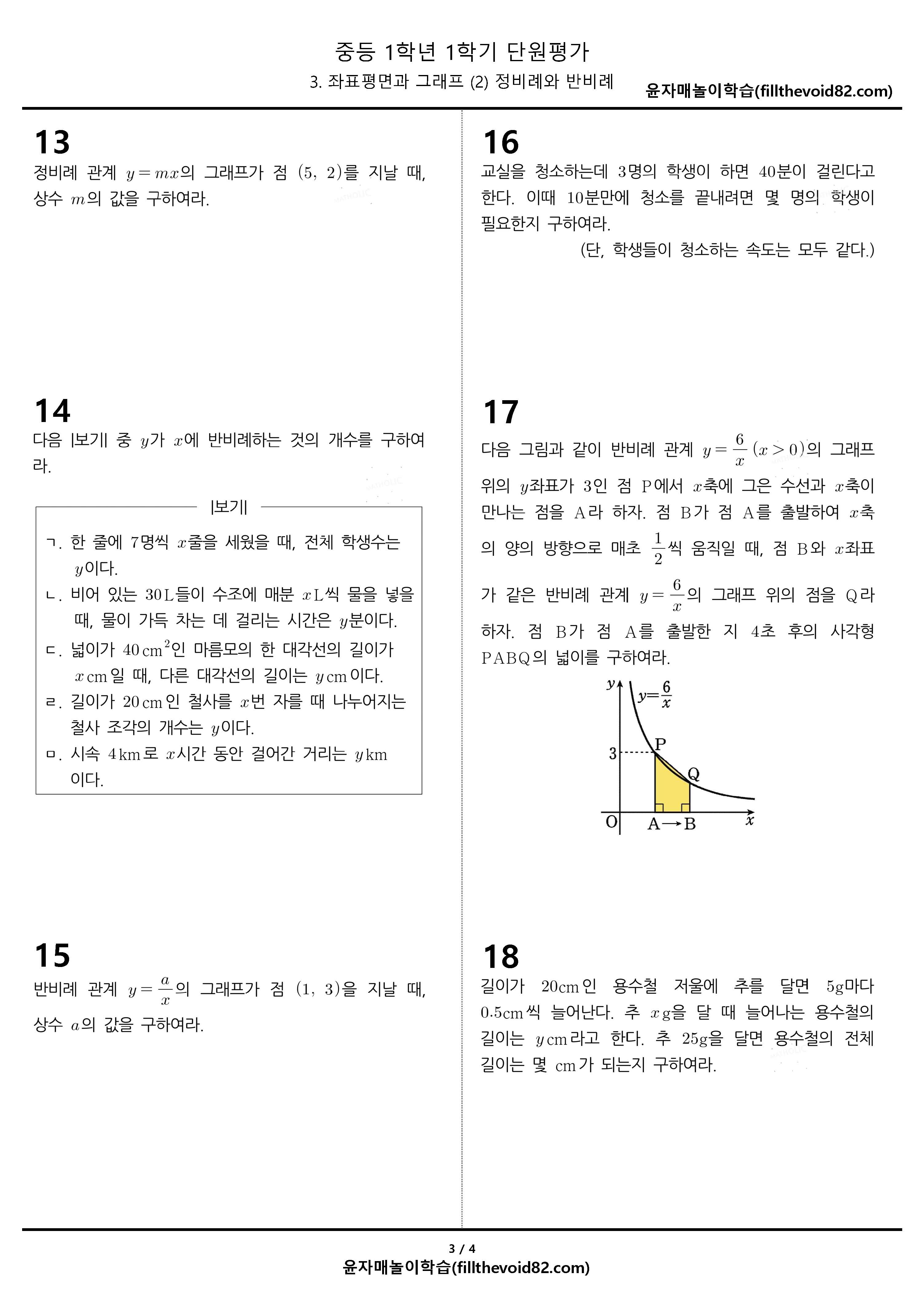 중1-1, 3(2) 정비례와 반비례 단원평가 20문제입니다.